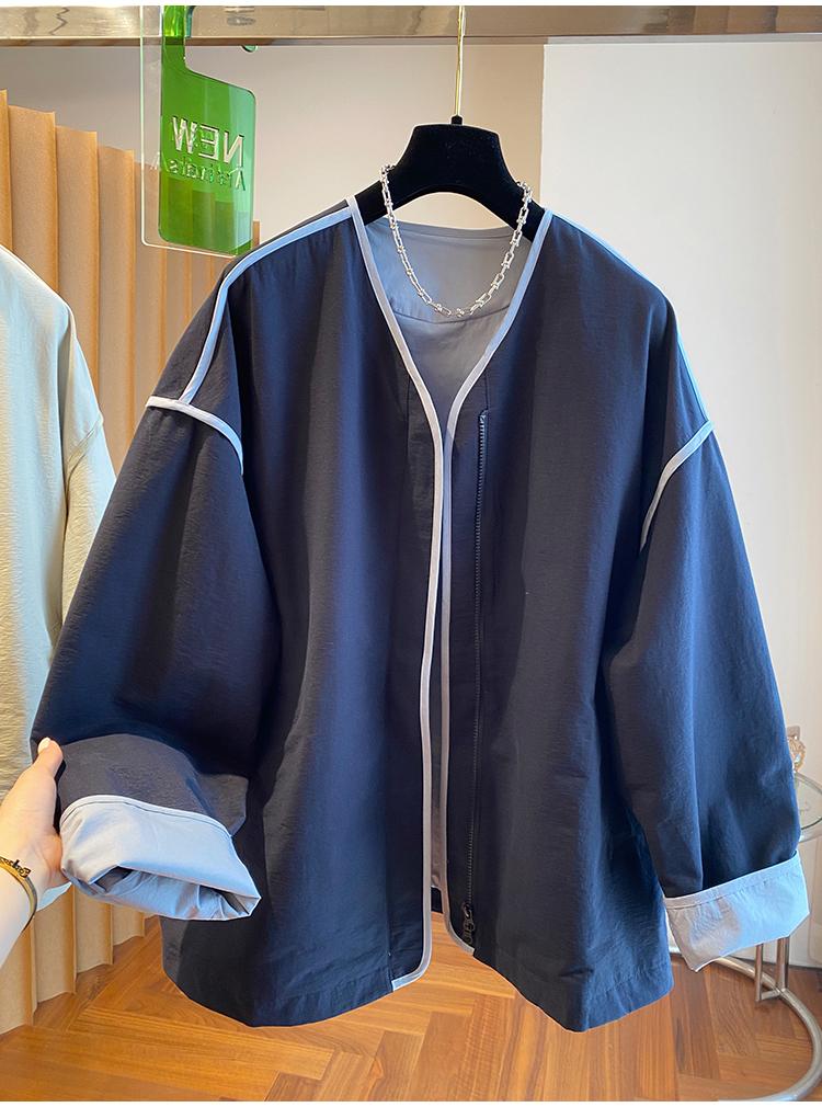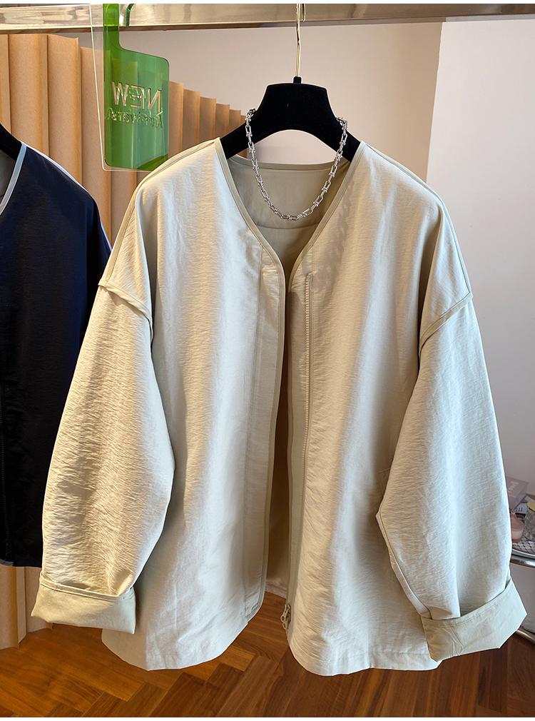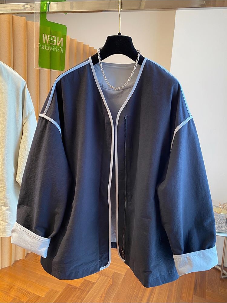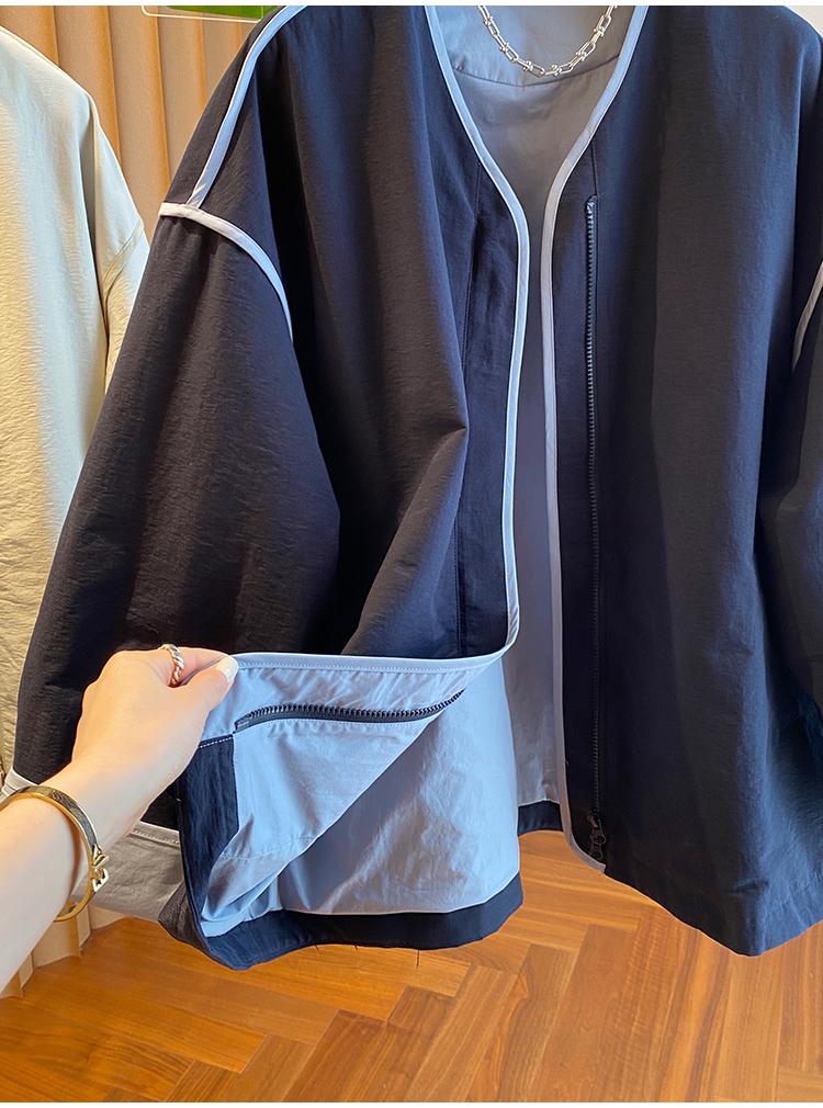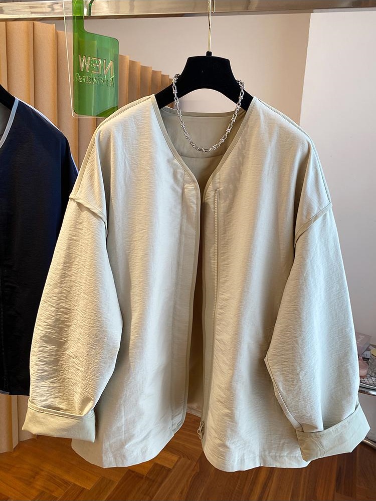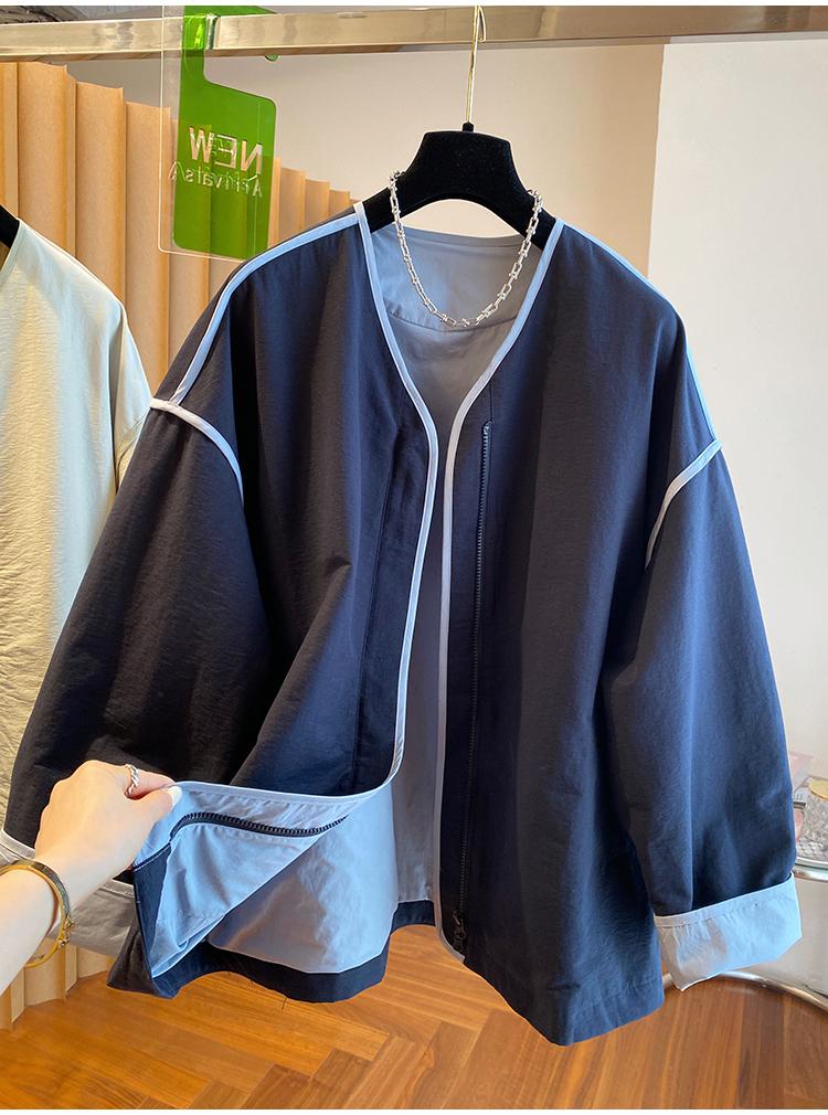 韩系高级感无领外套女春秋2026新款宽松薄款超火拼色休闲夹克风衣