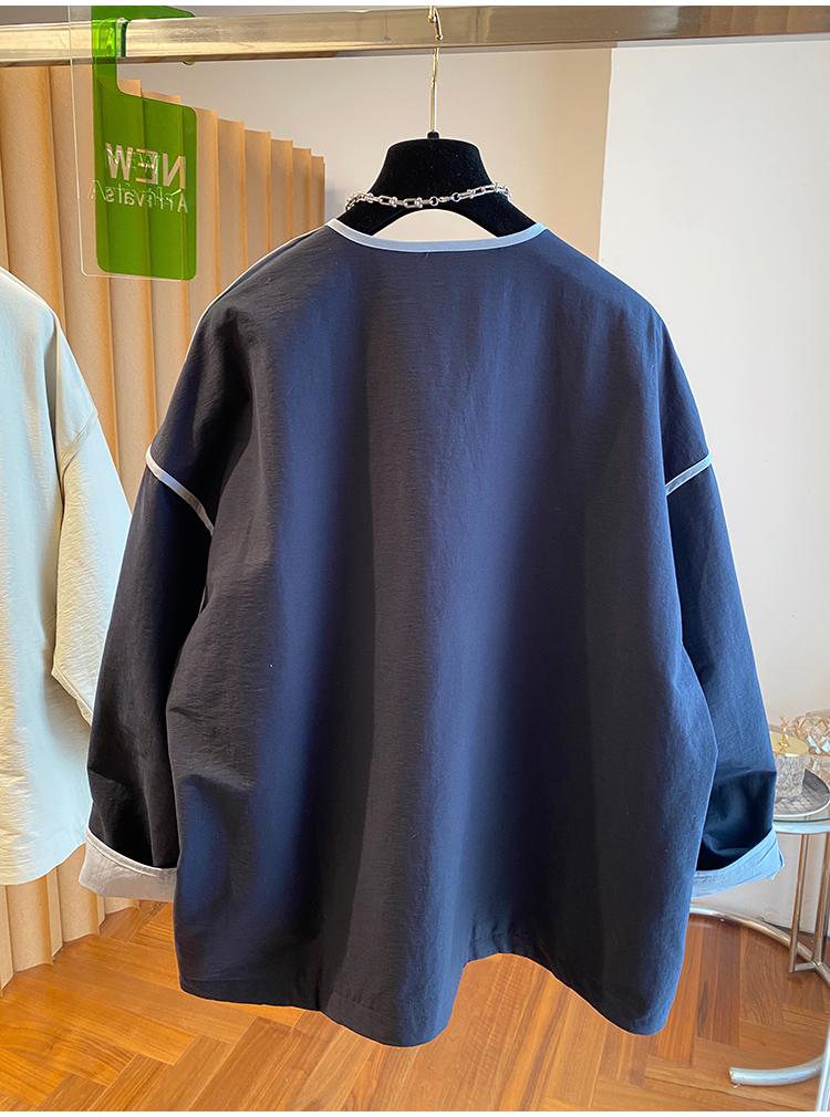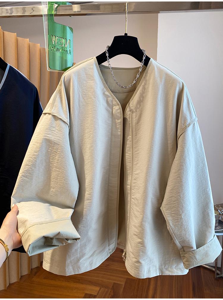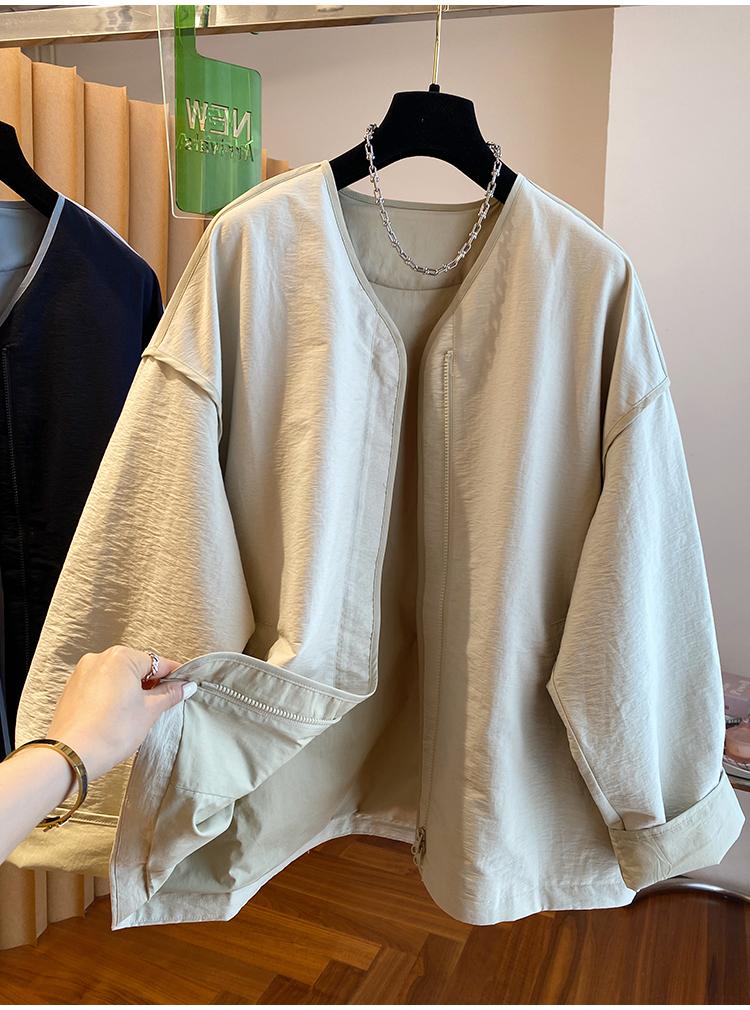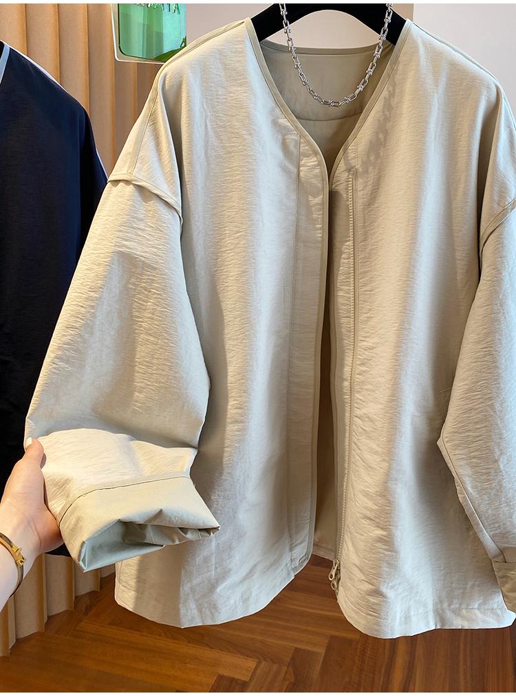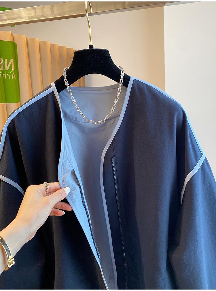 韩系高级感无领外套女春秋2026新款宽松薄款超火拼色休闲夹克风衣