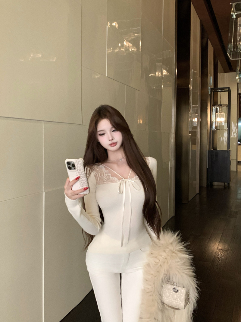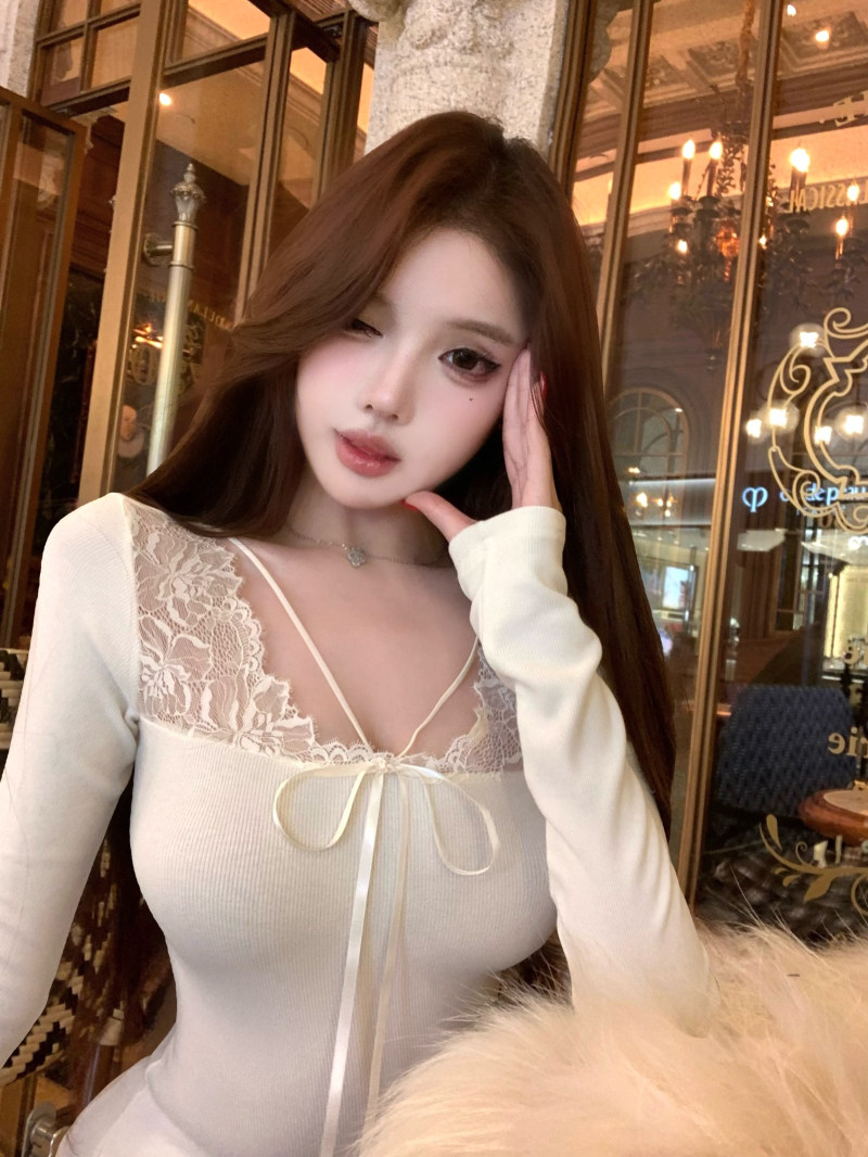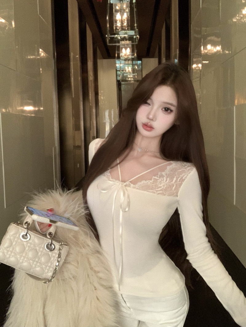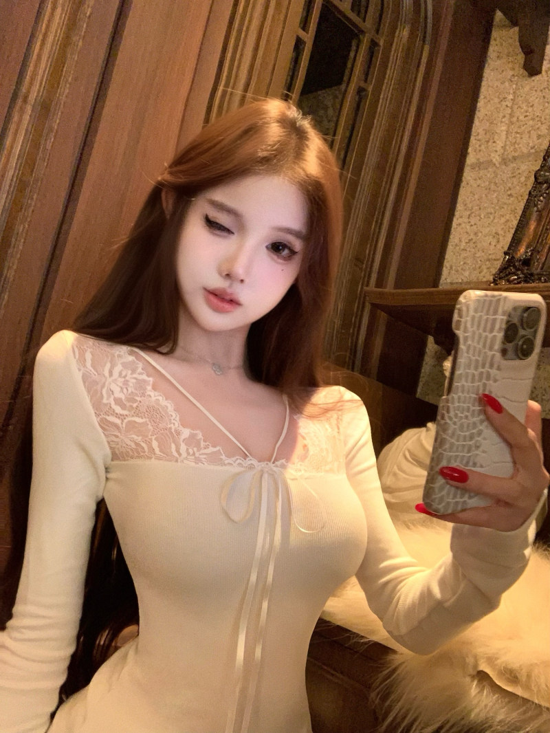 kumikumi纯欲风蕾丝拼接性感杏色长袖T恤女冬季修身显瘦百搭上衣