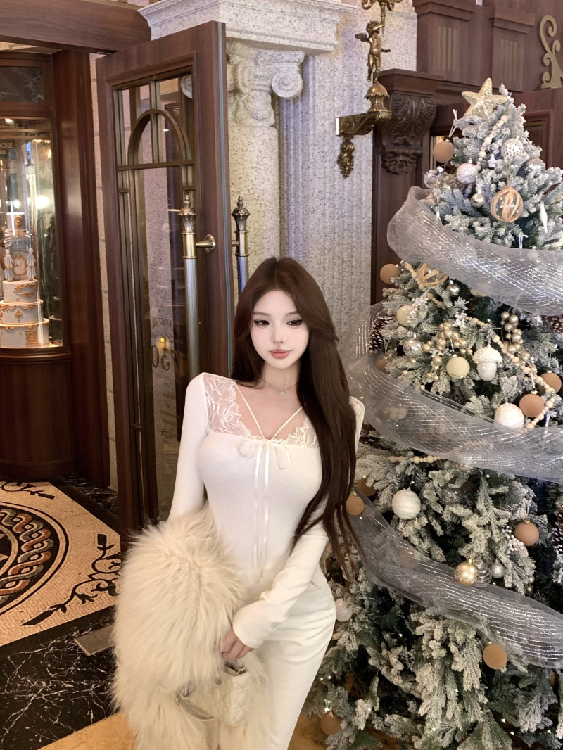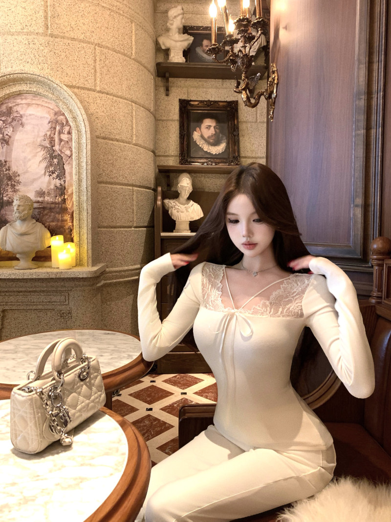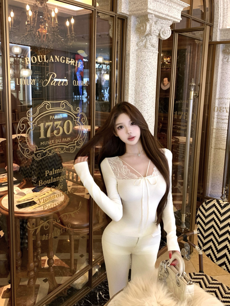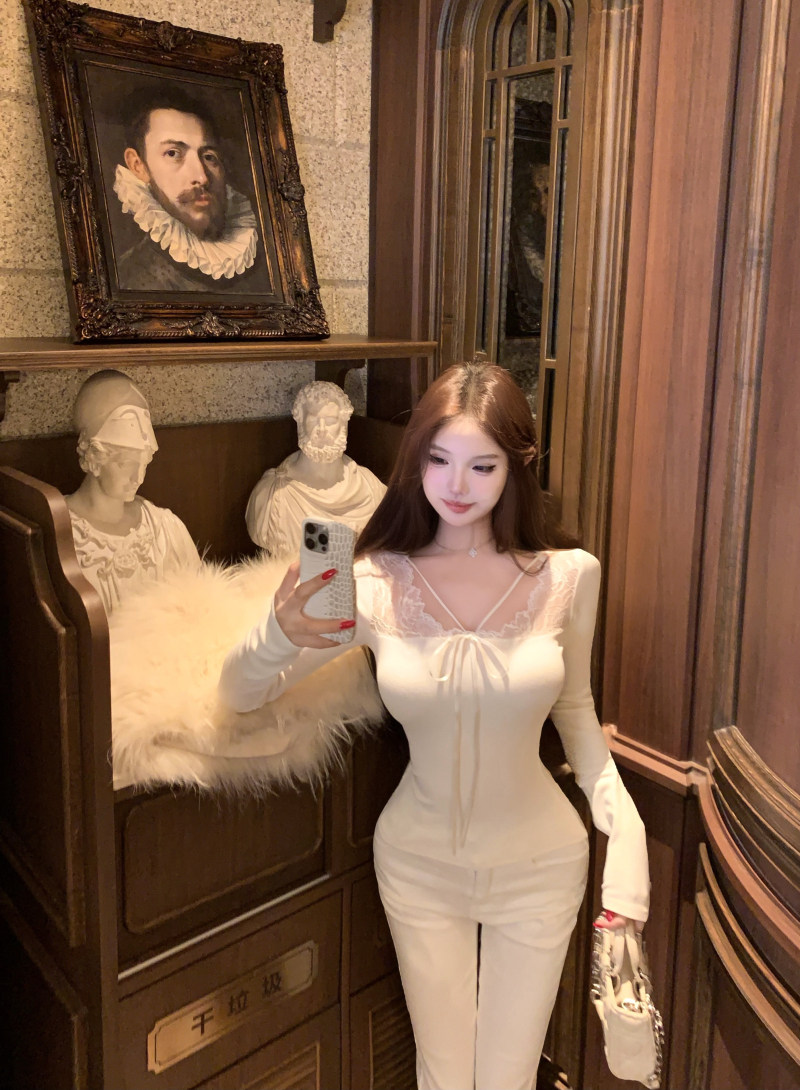 kumikumi纯欲风蕾丝拼接性感杏色长袖T恤女冬季修身显瘦百搭上衣