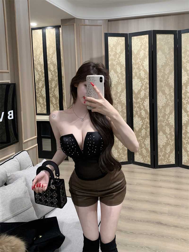 实拍实价黑色性感烫钻明艳大美女风抹胸背心带胸垫