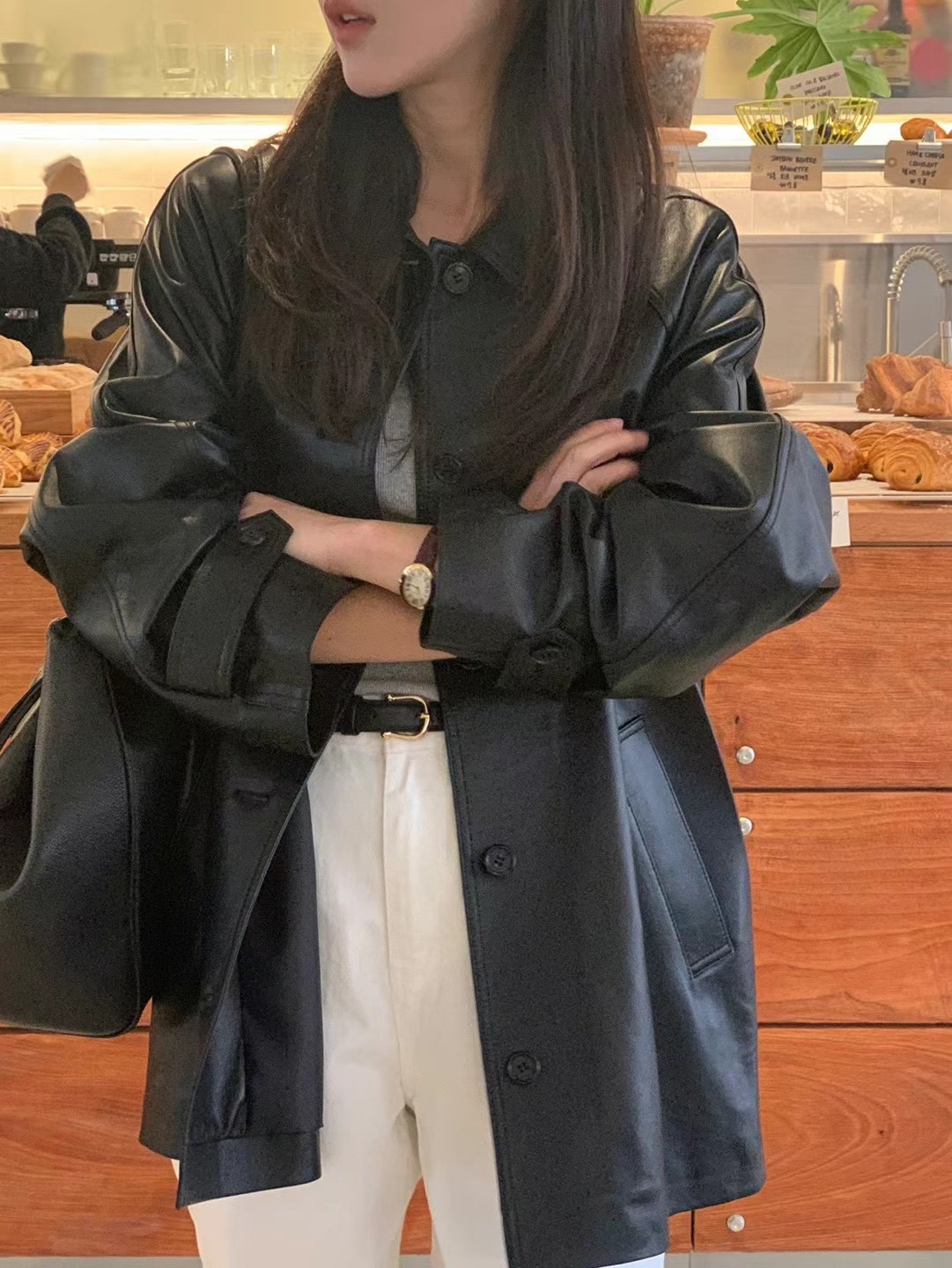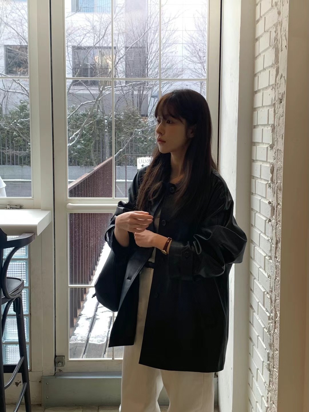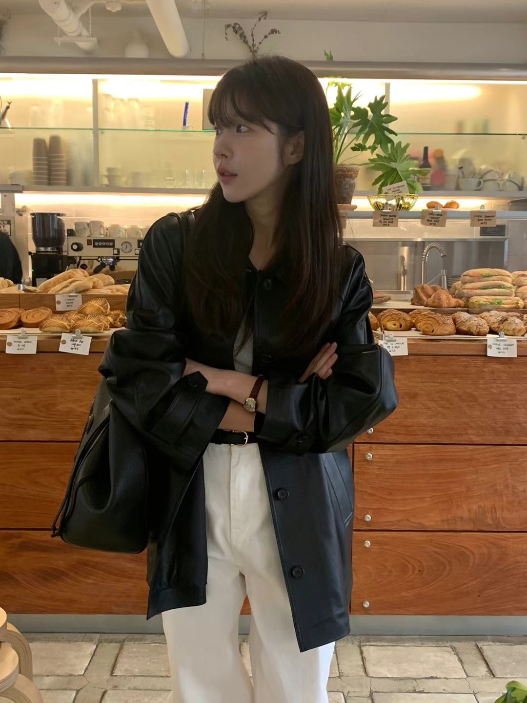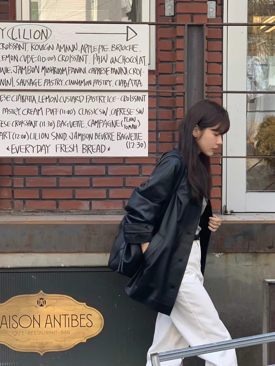 尺寸已更新 INS博主款春秋设计感炸街复古黑色宽松PU西装皮衣外套