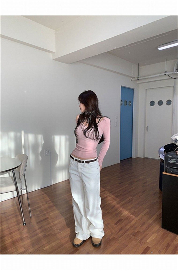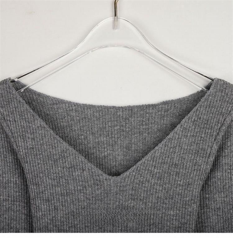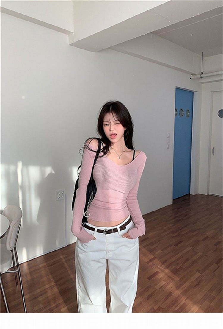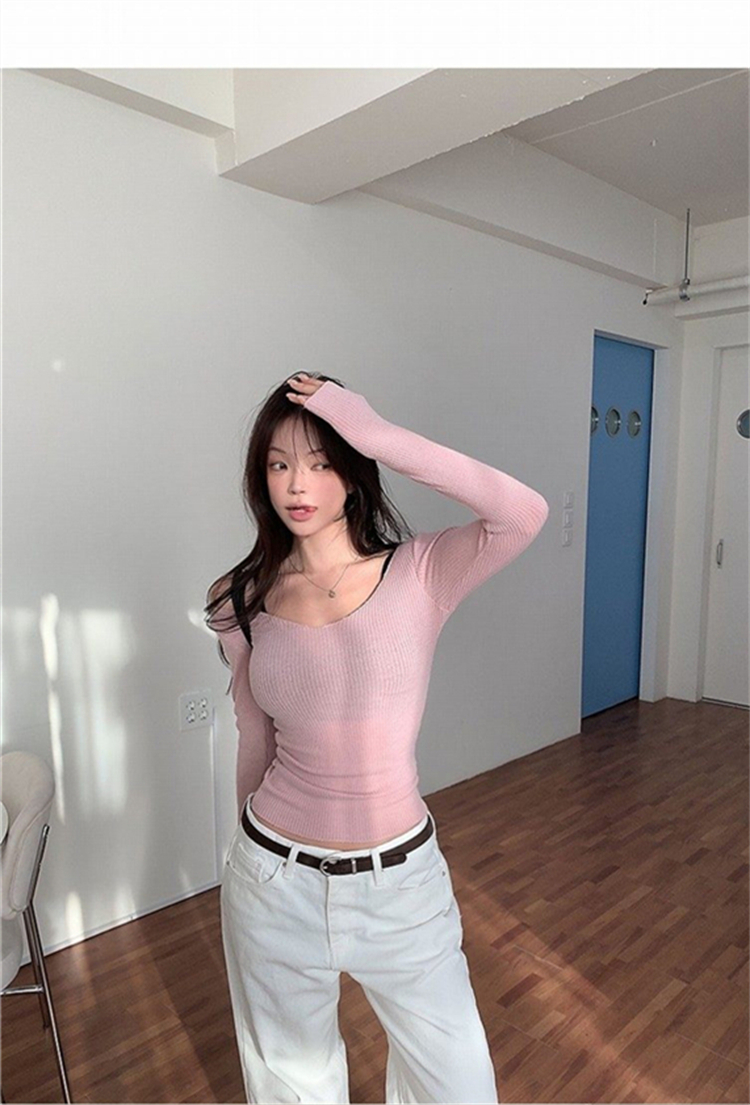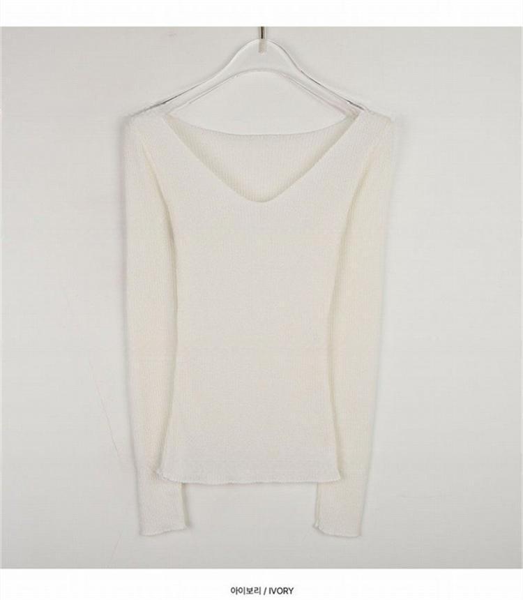韩国东大门新款气质修身显身材长袖薄款微透大V领百搭打底衫T恤女