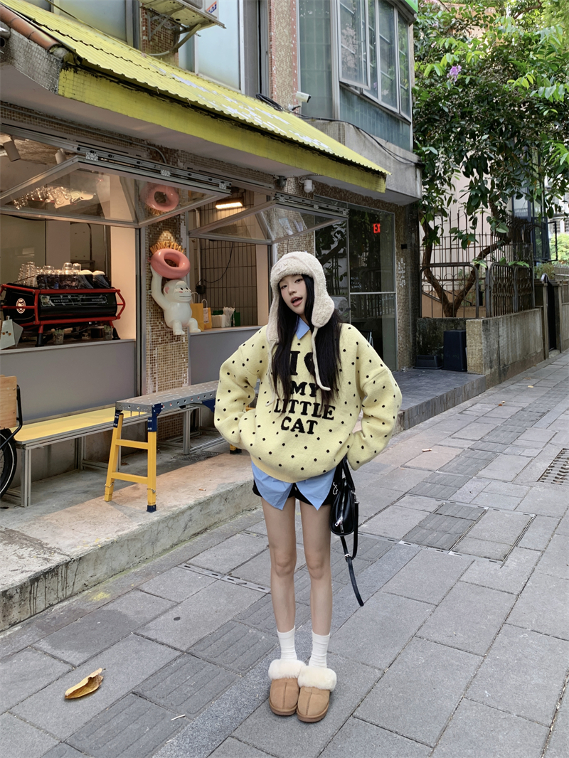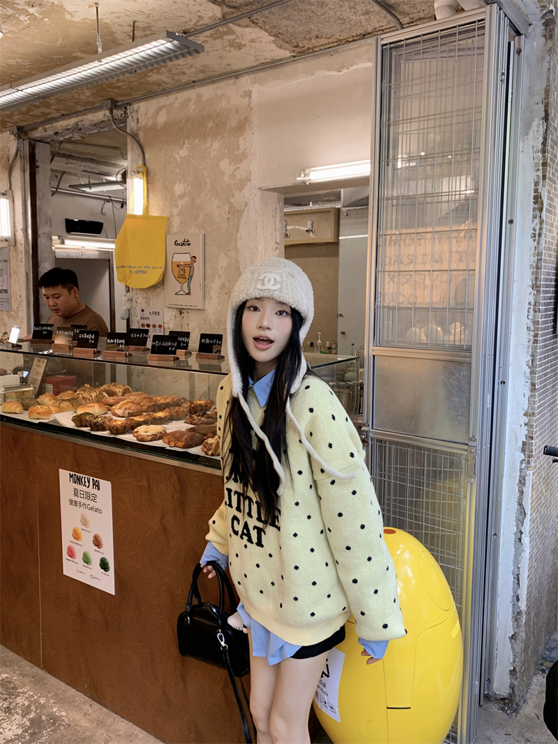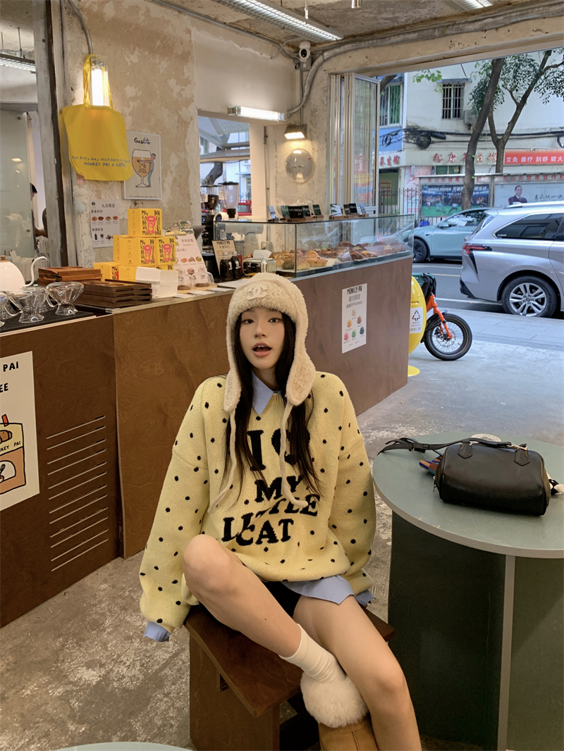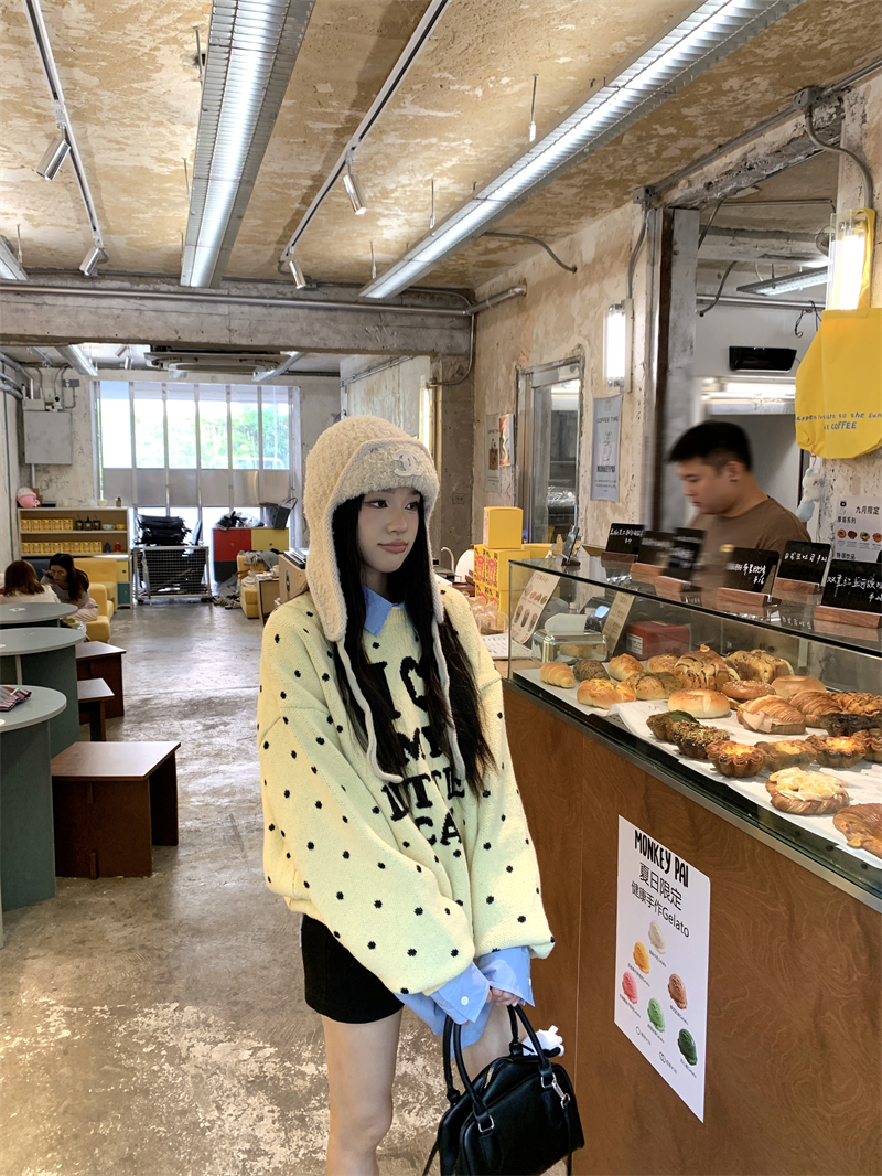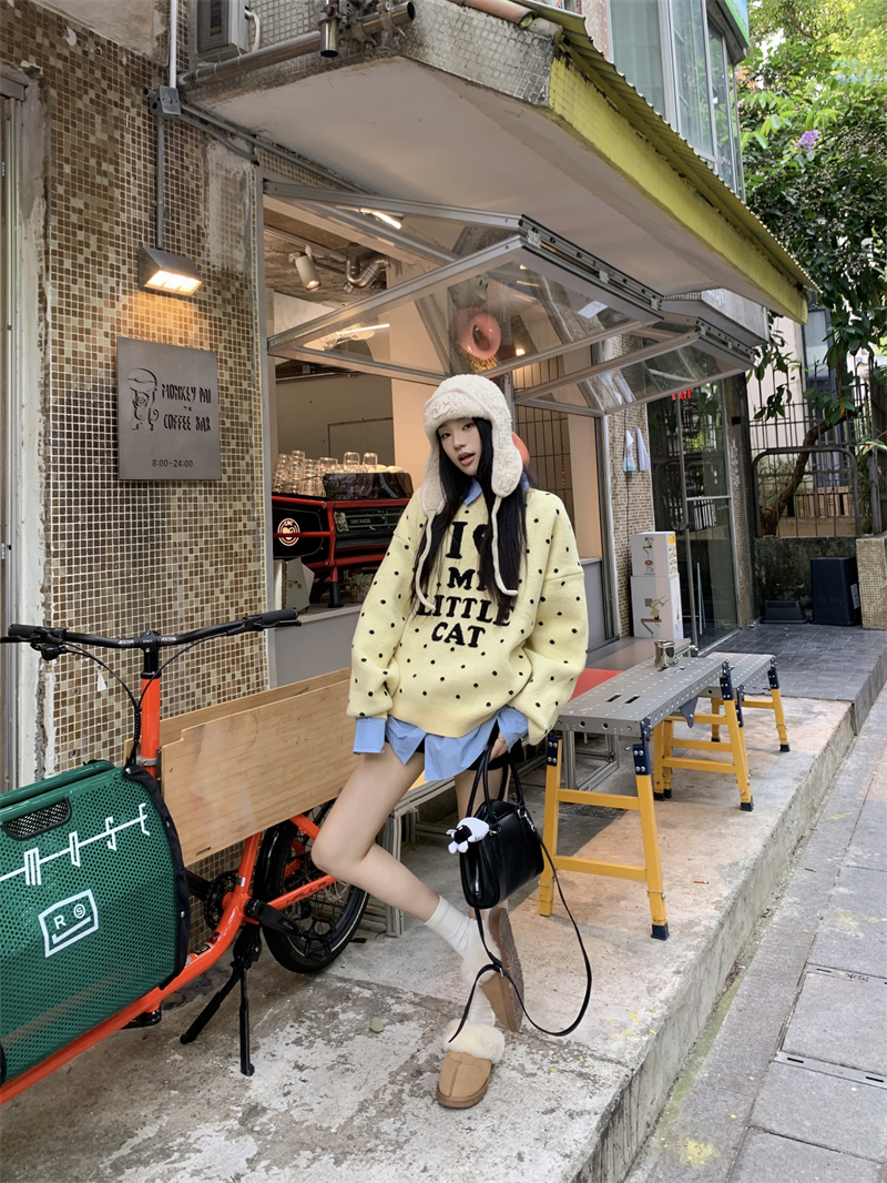 现实拍实价 早秋圆领小鸡黄提花毛衣+蓝色衬衫打底