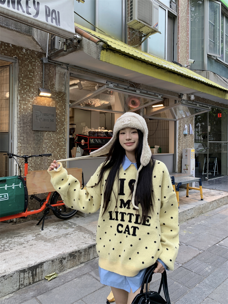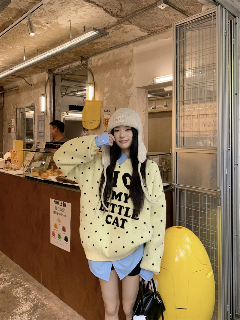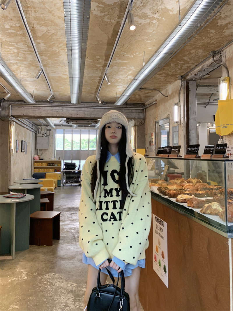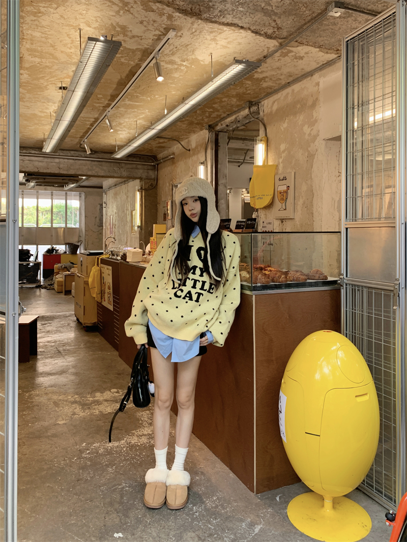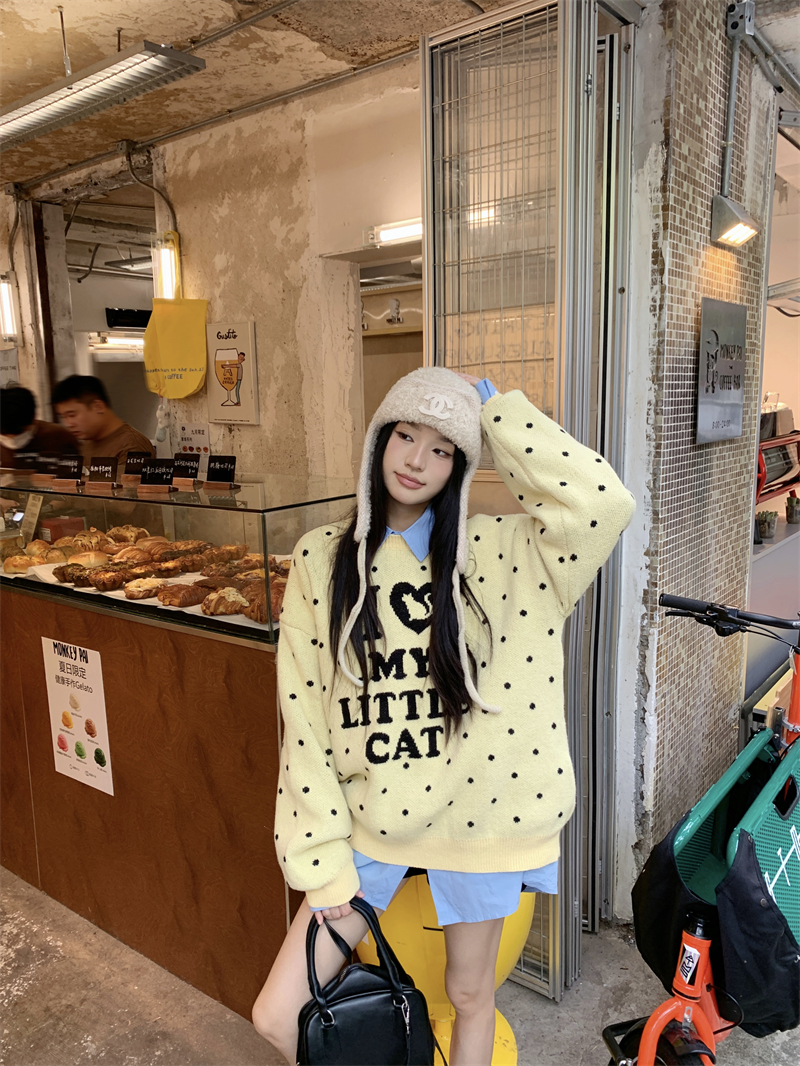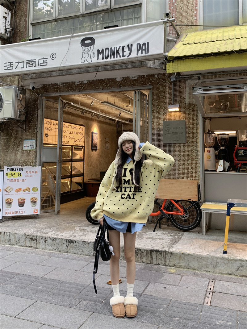 现实拍实价 早秋圆领小鸡黄提花毛衣+蓝色衬衫打底