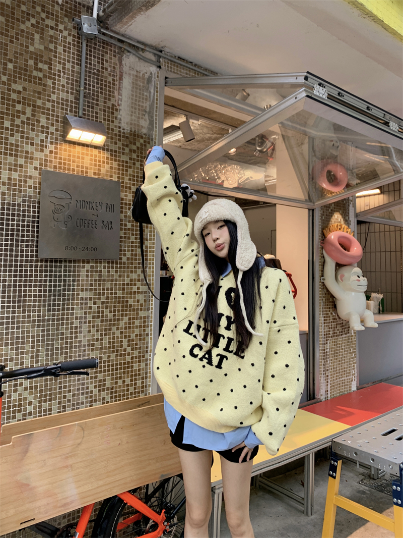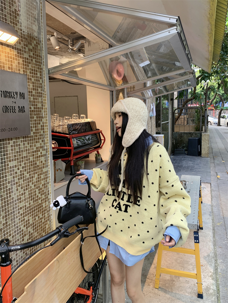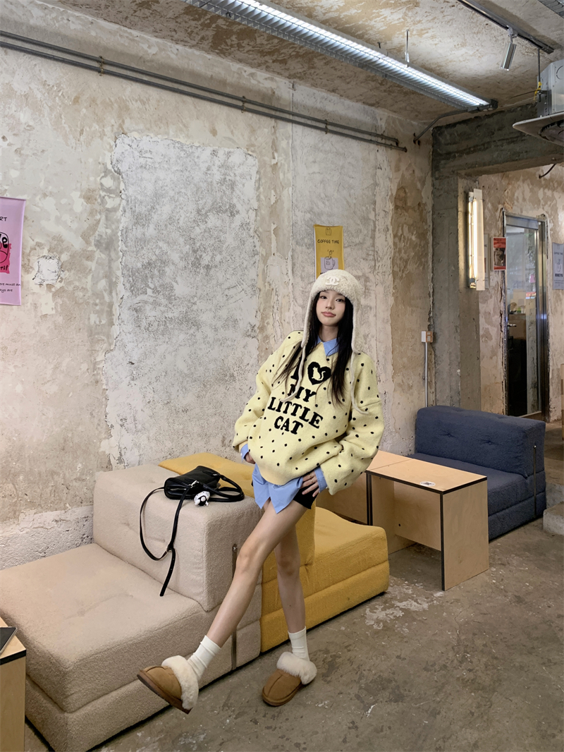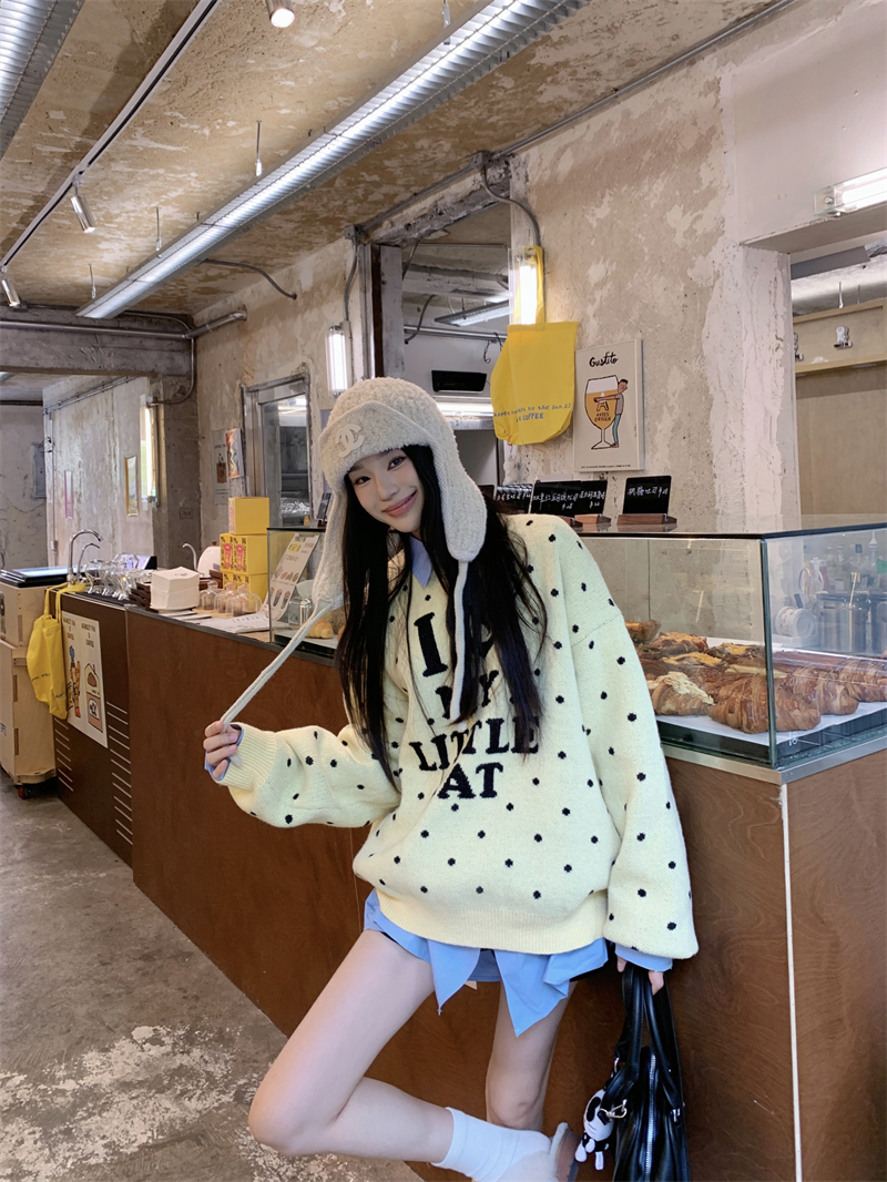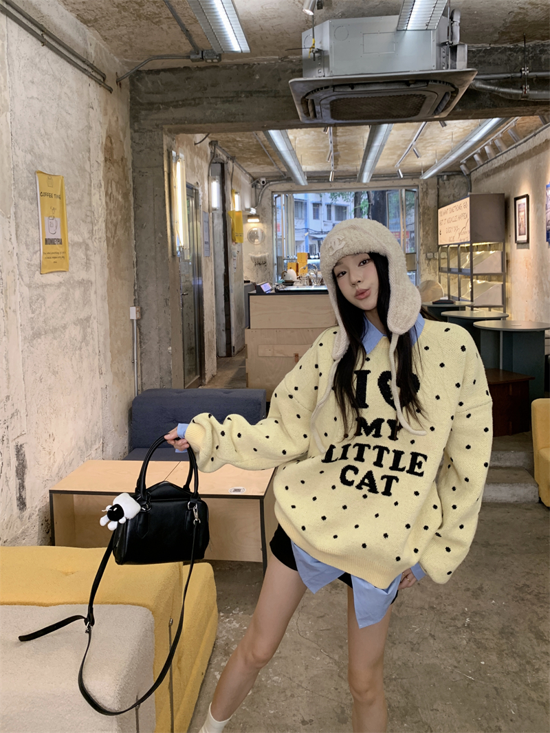 现实拍实价 早秋圆领小鸡黄提花毛衣+蓝色衬衫打底