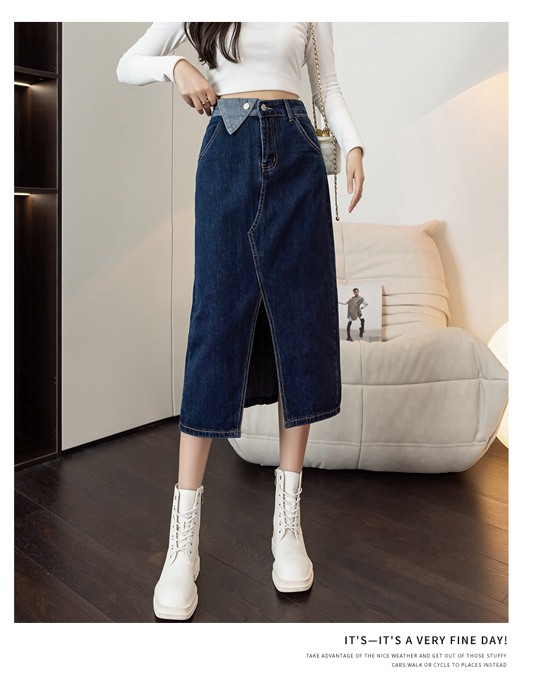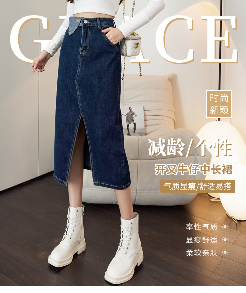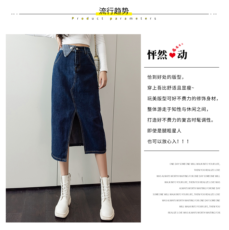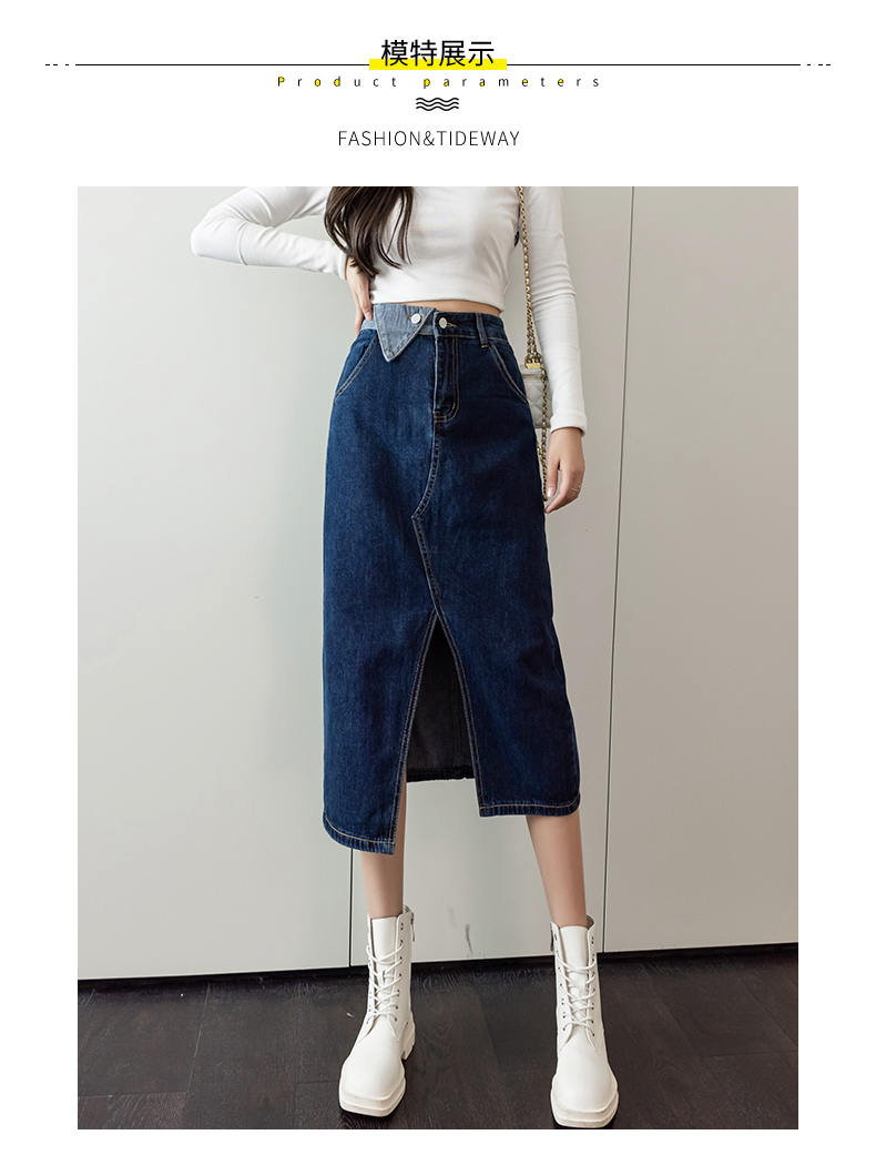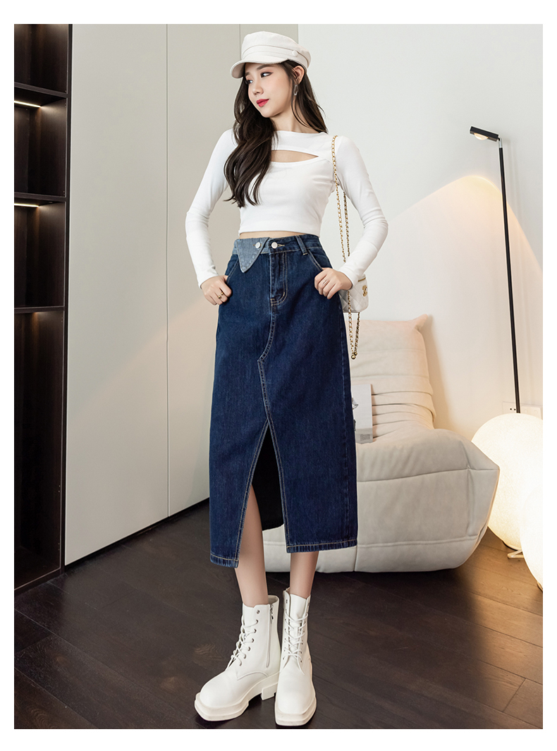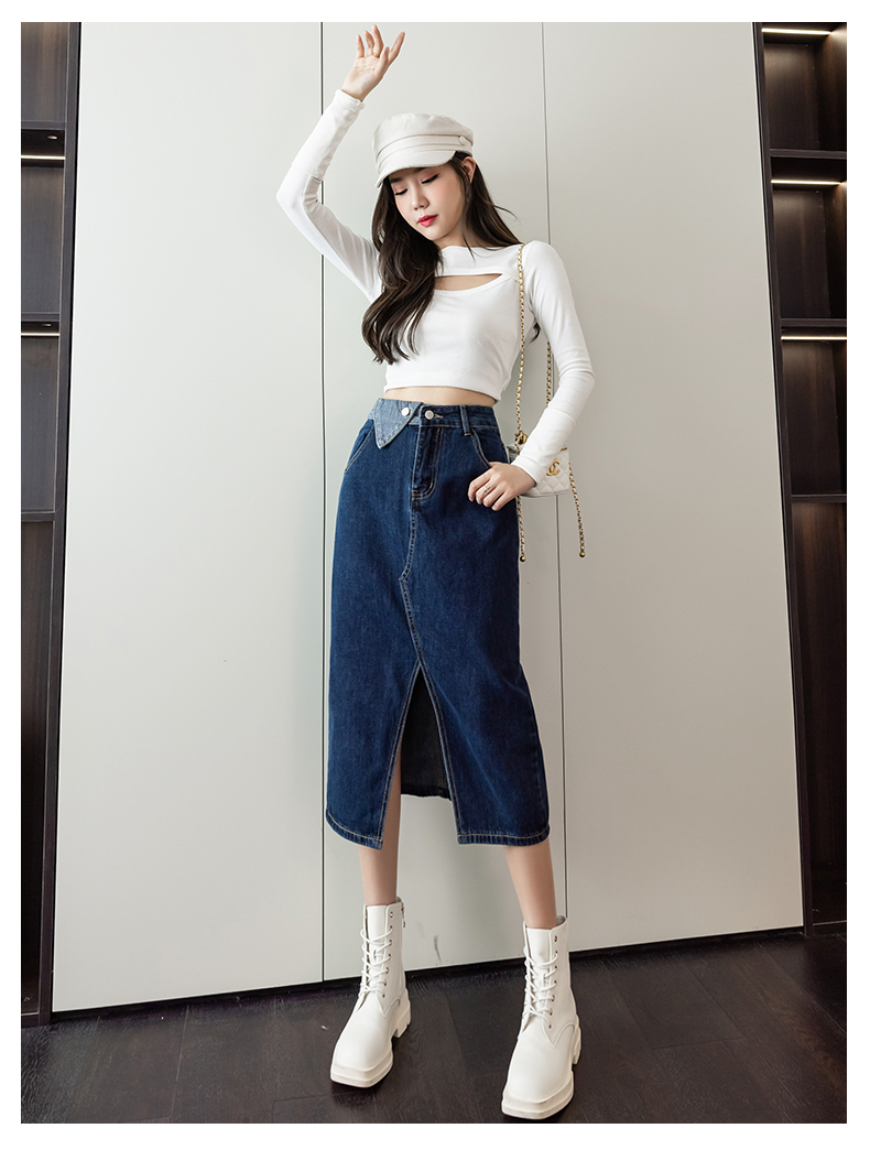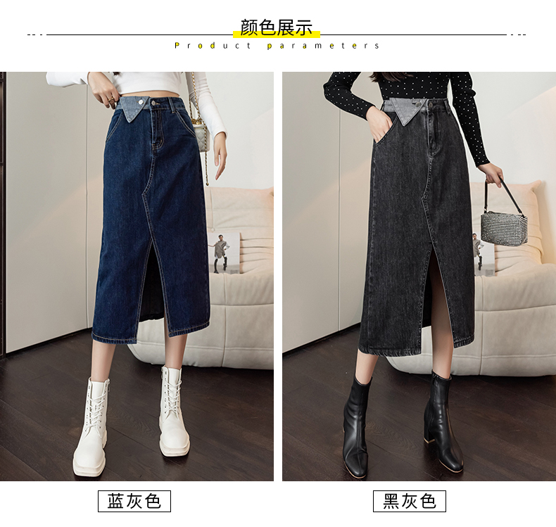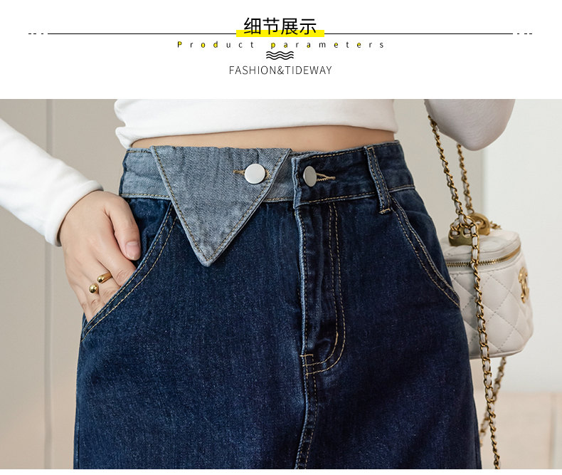 撞色包臀牛仔裙女2026春季新款韩版百搭双扣高腰小个子开叉中长裙