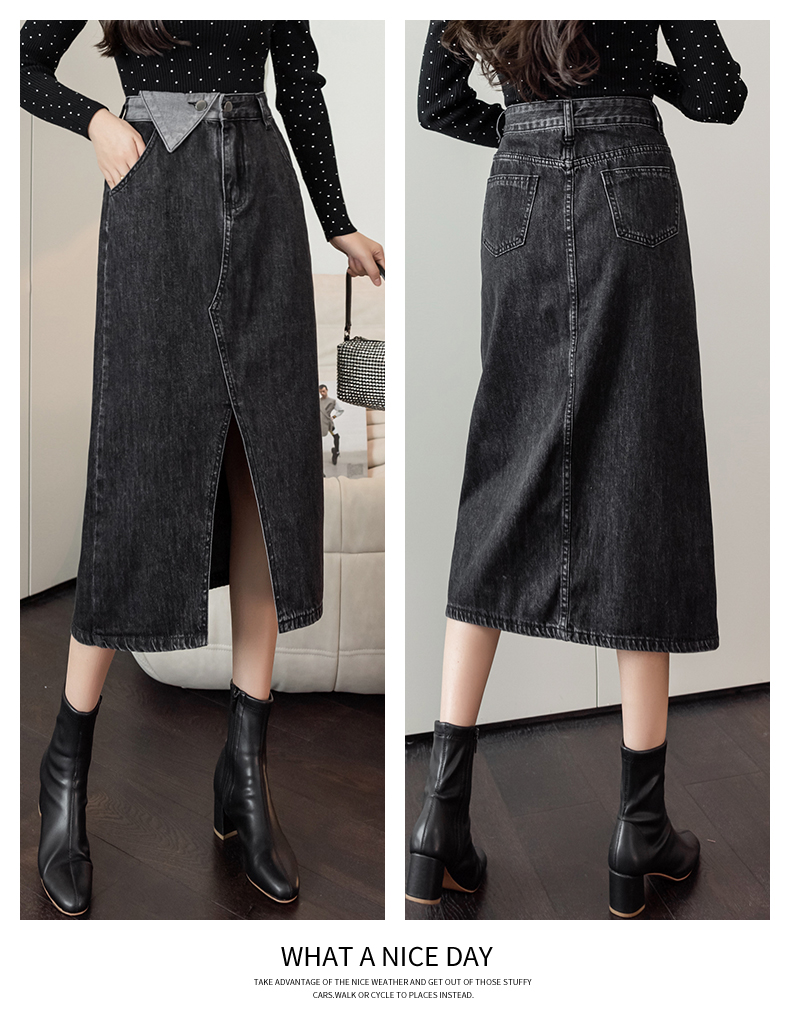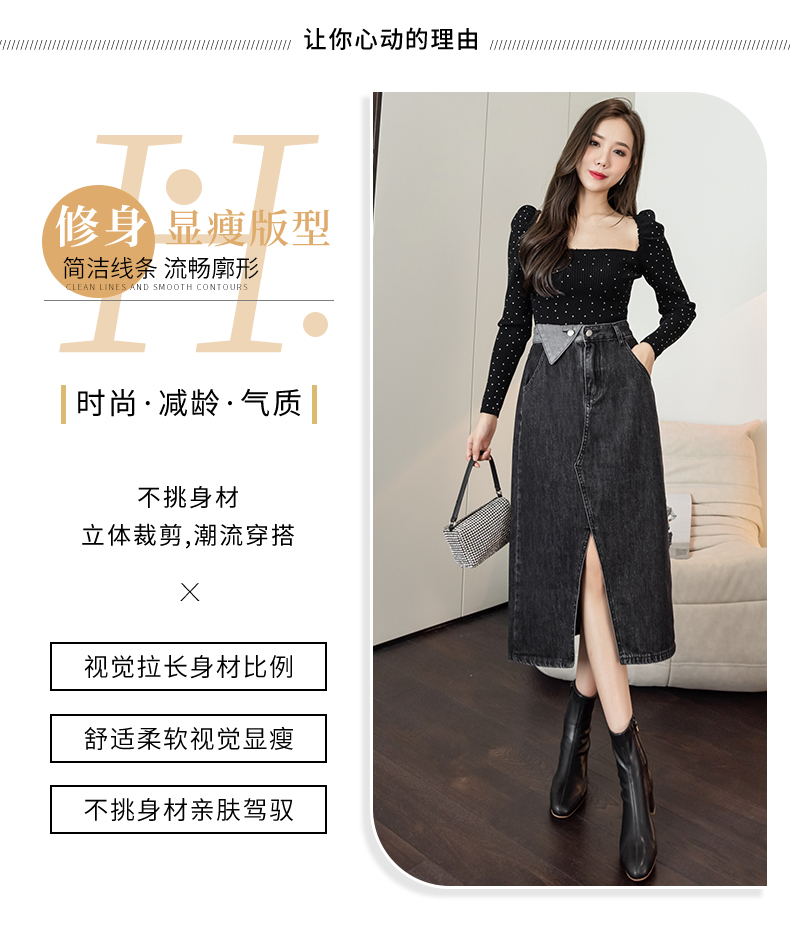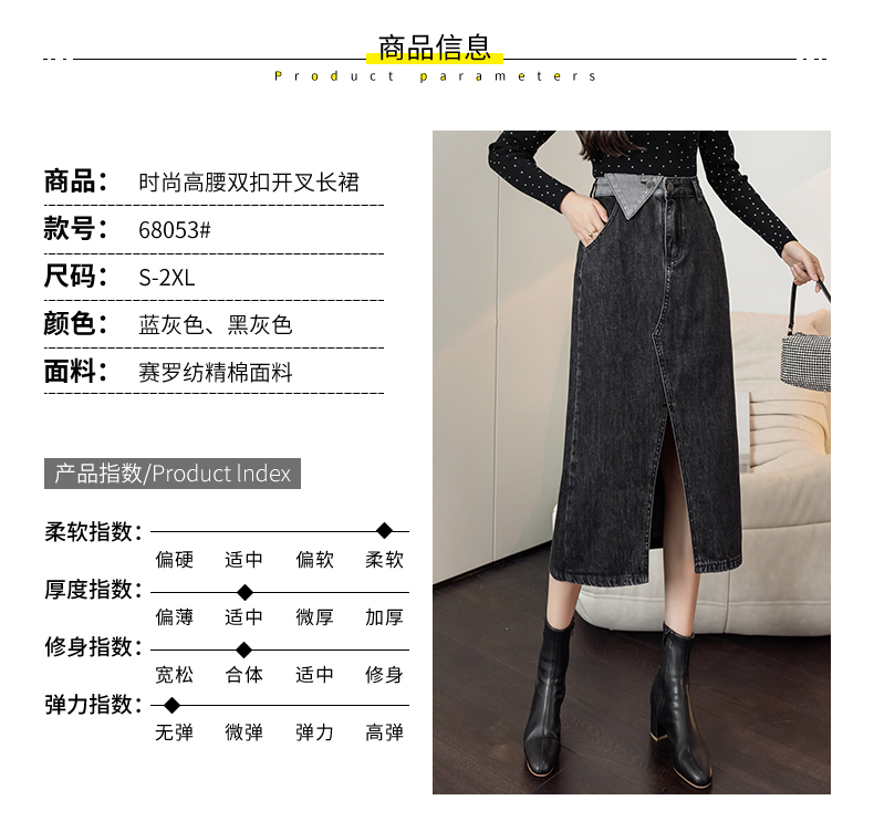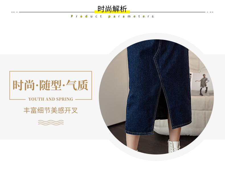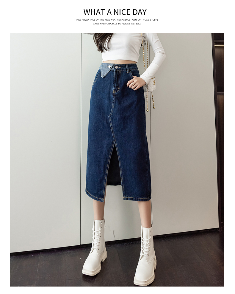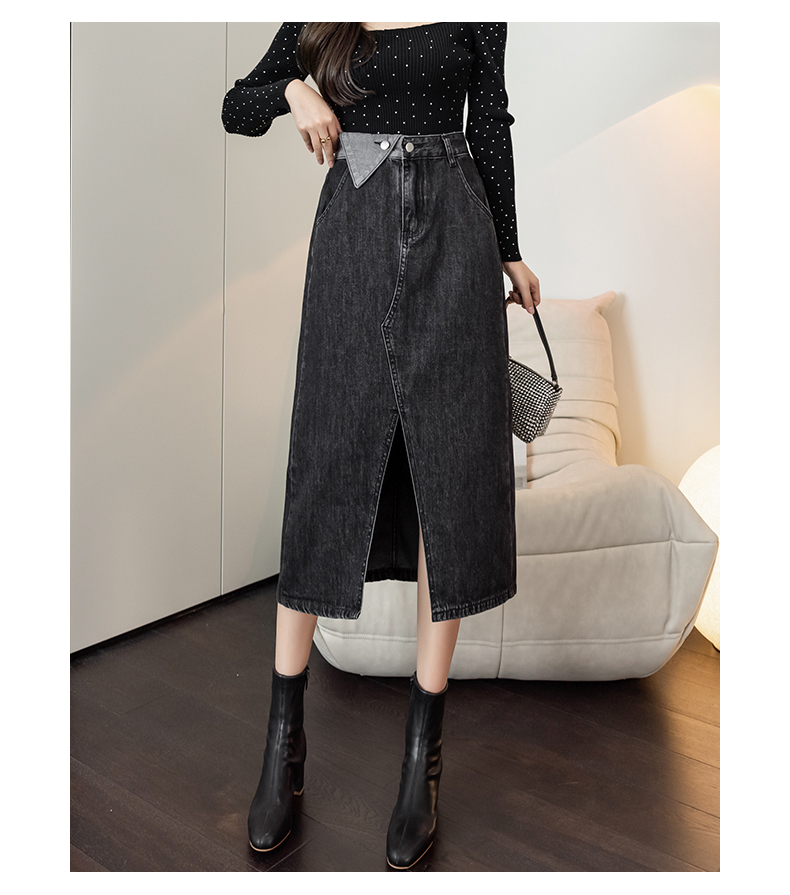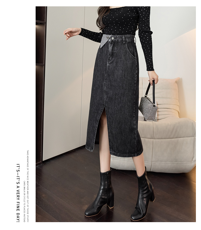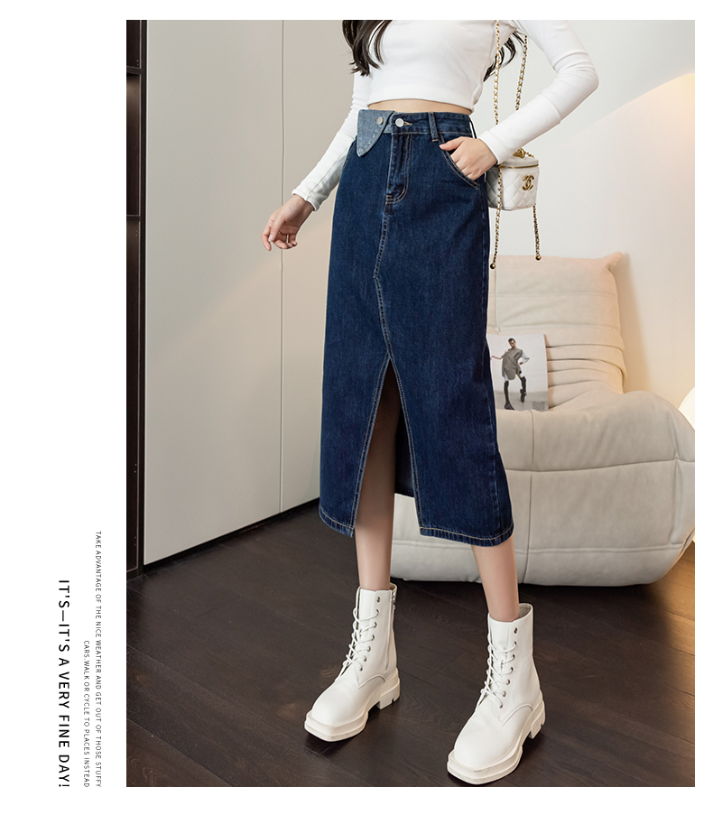 撞色包臀牛仔裙女2026春季新款韩版百搭双扣高腰小个子开叉中长裙