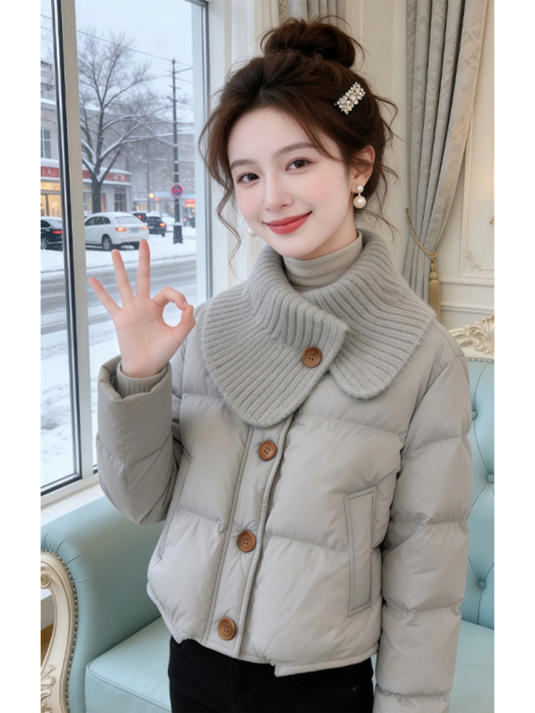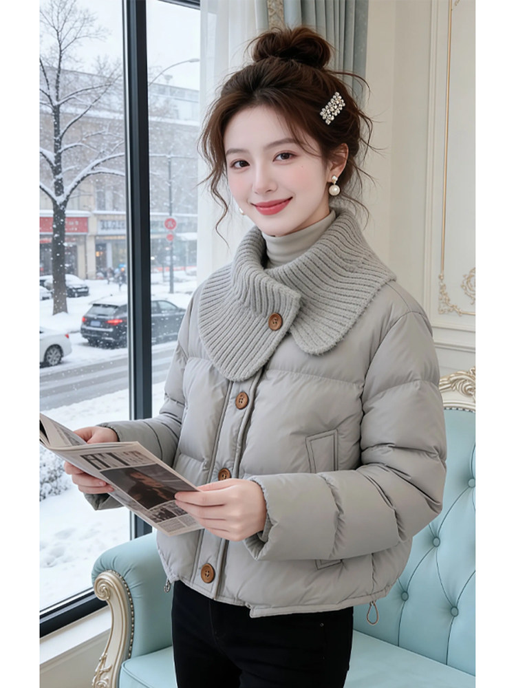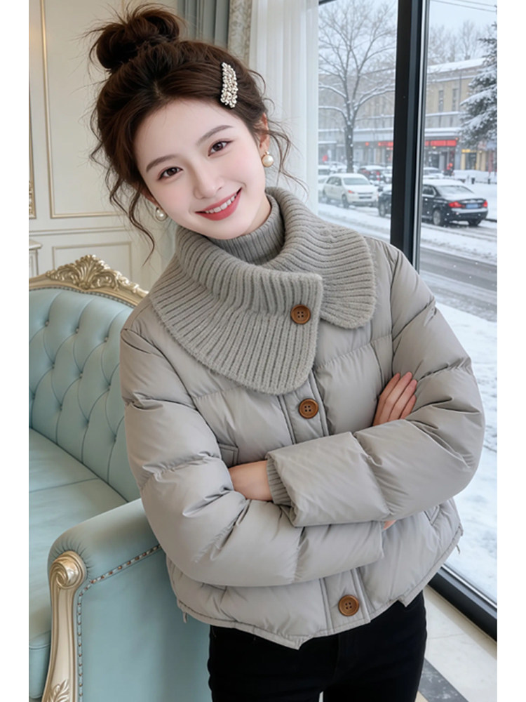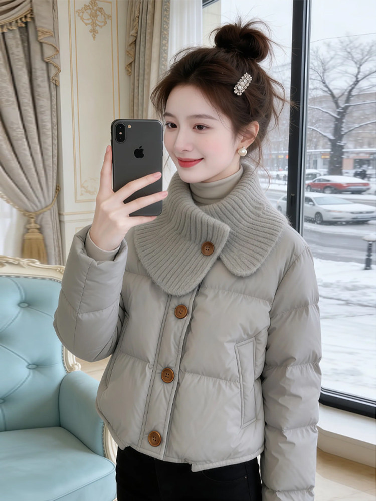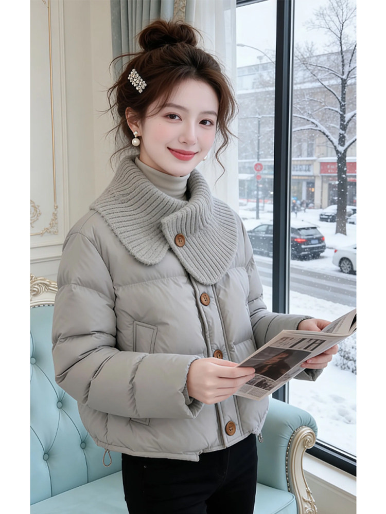 官图 灰色针织拼接翻领夹棉棉服外套女冬装加厚短款独特好看棉衣