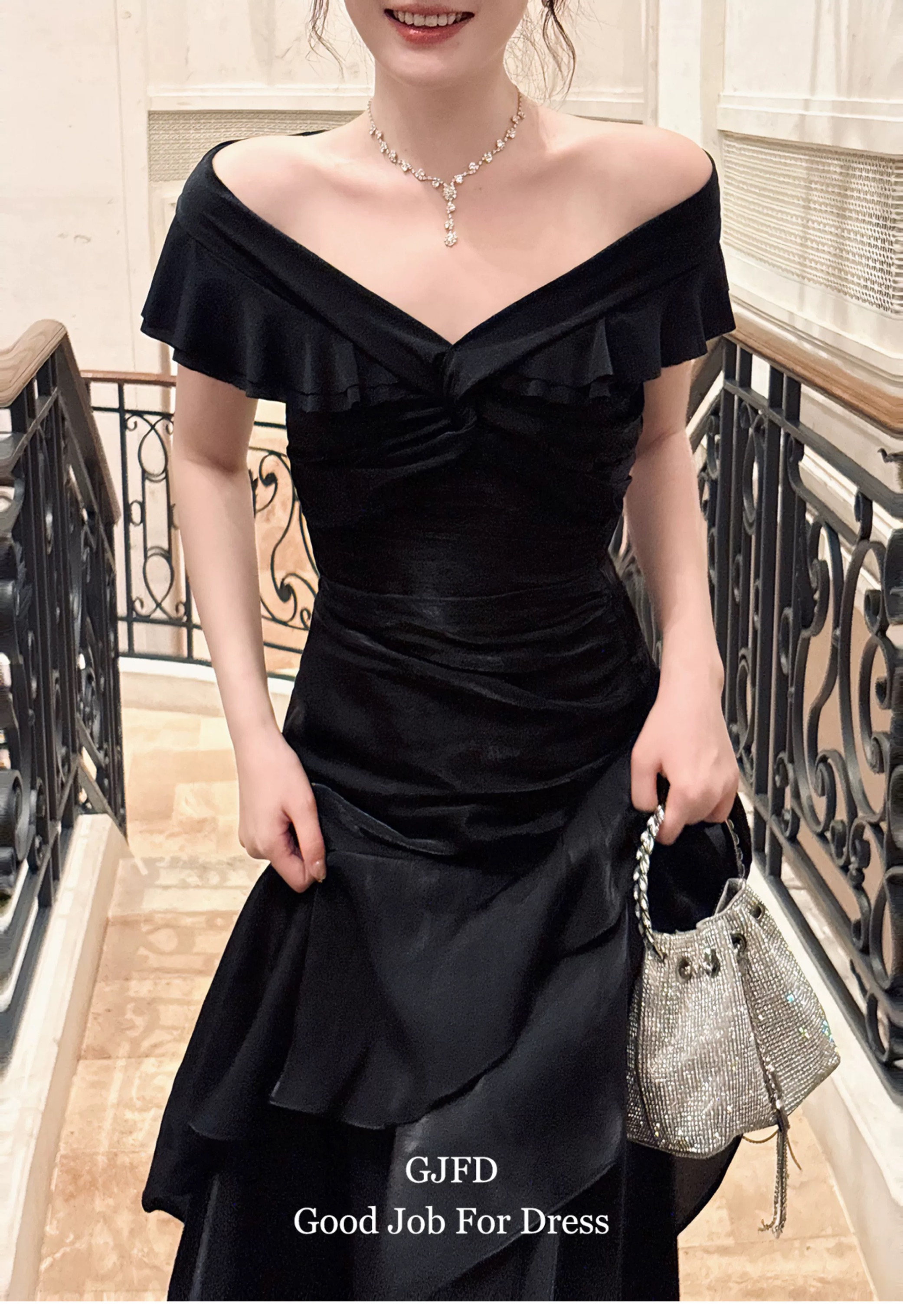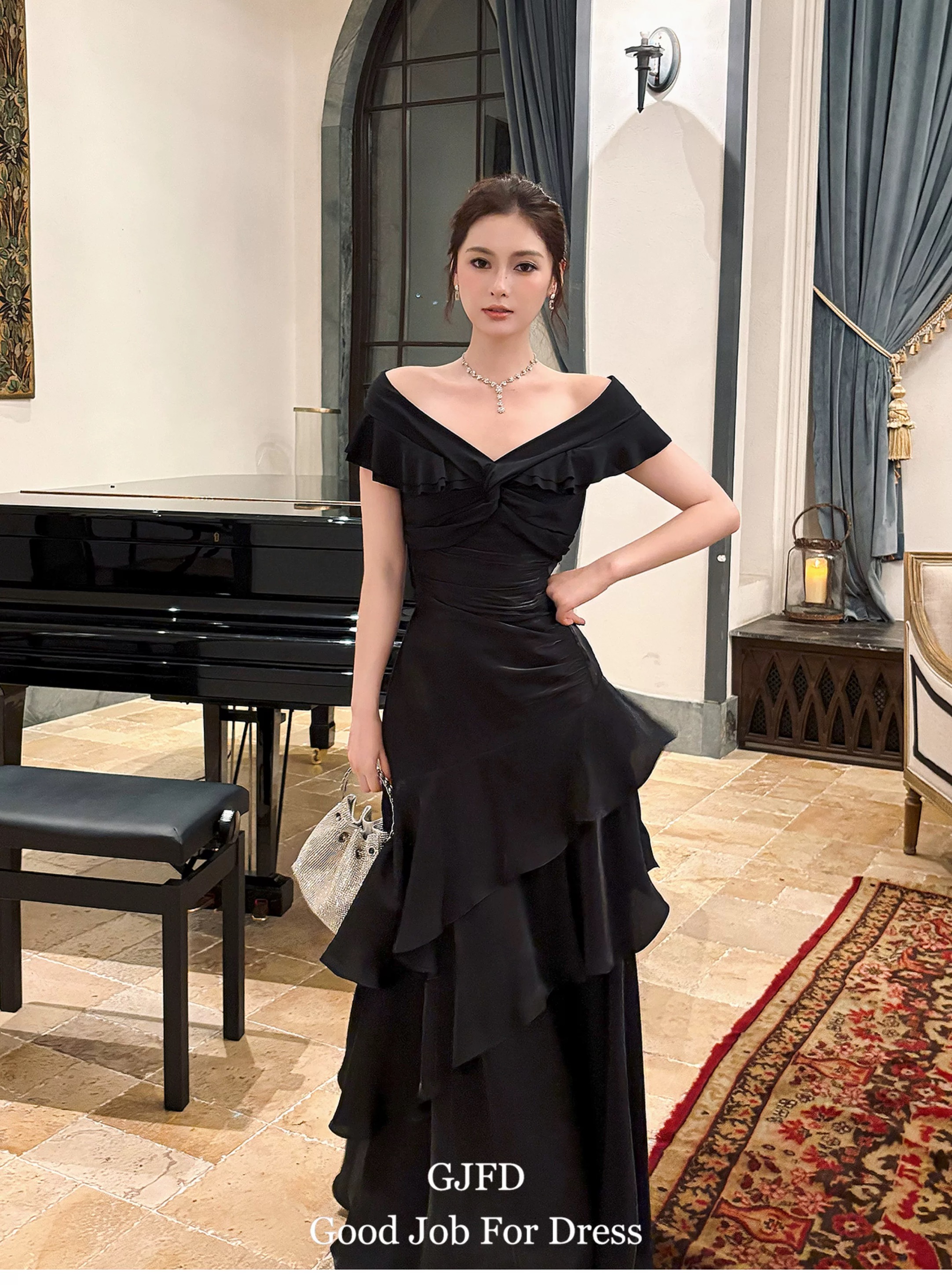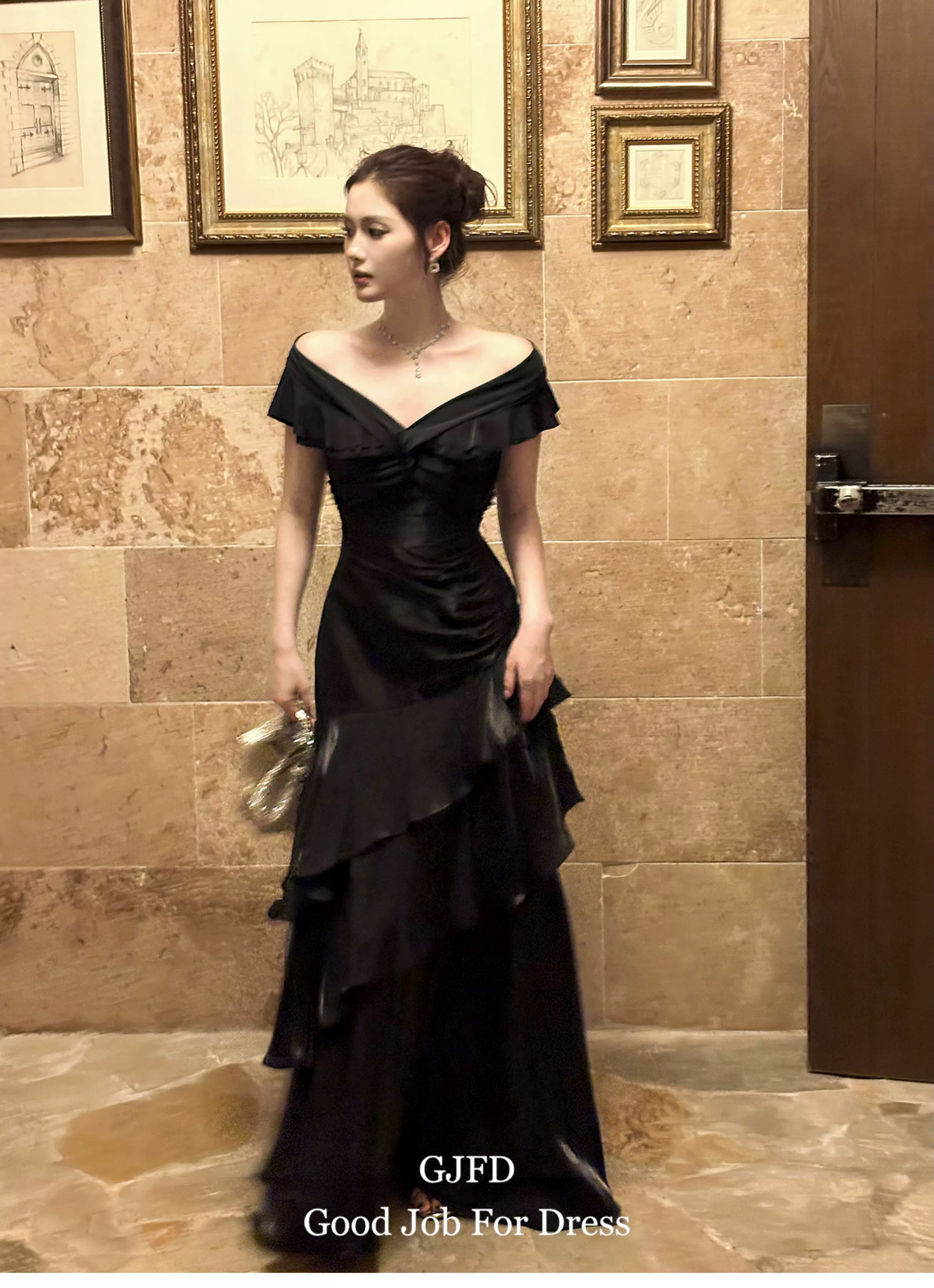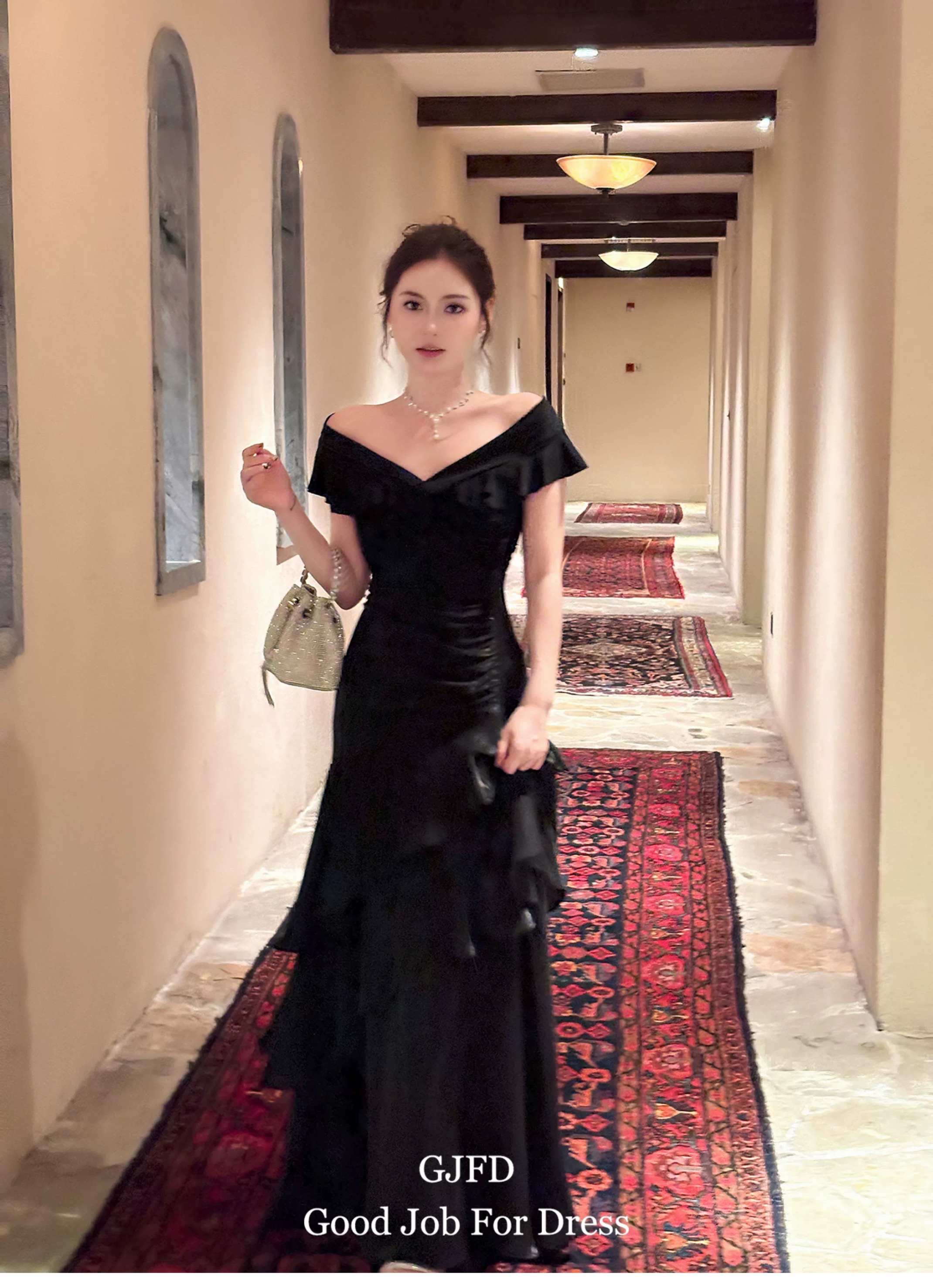 Good Job鲁本斯假日法式黑色一字肩轻奢连衣裙小众礼服鱼尾裙