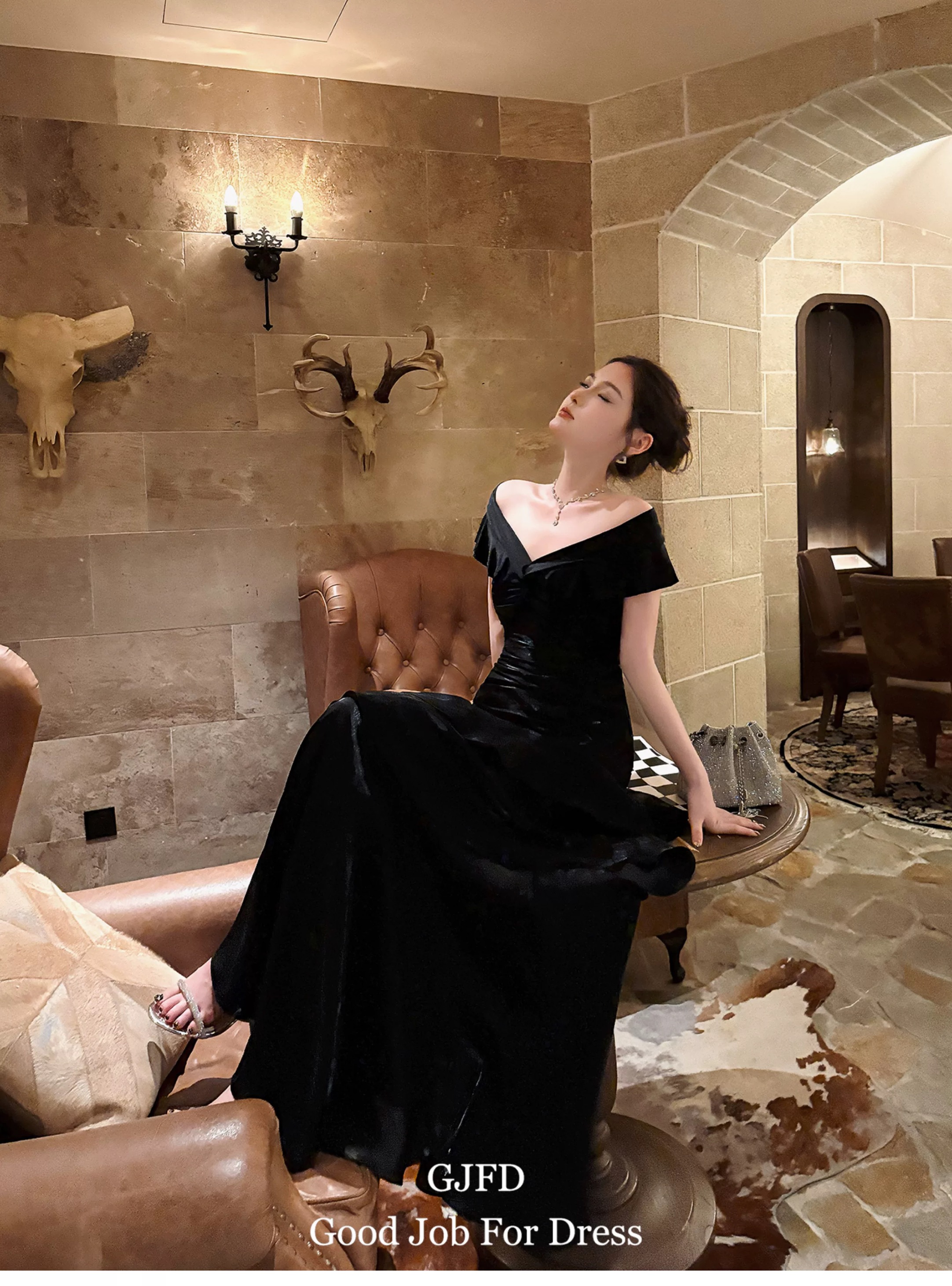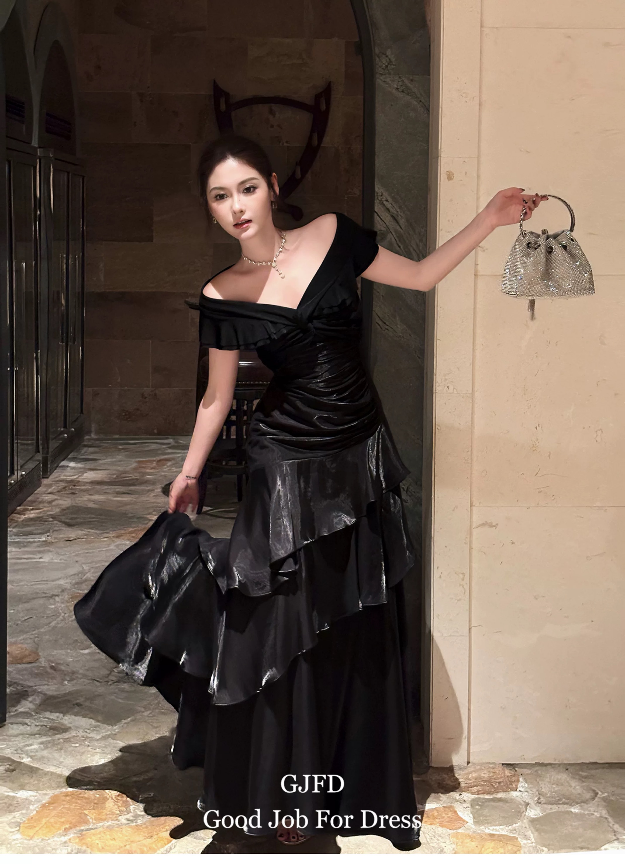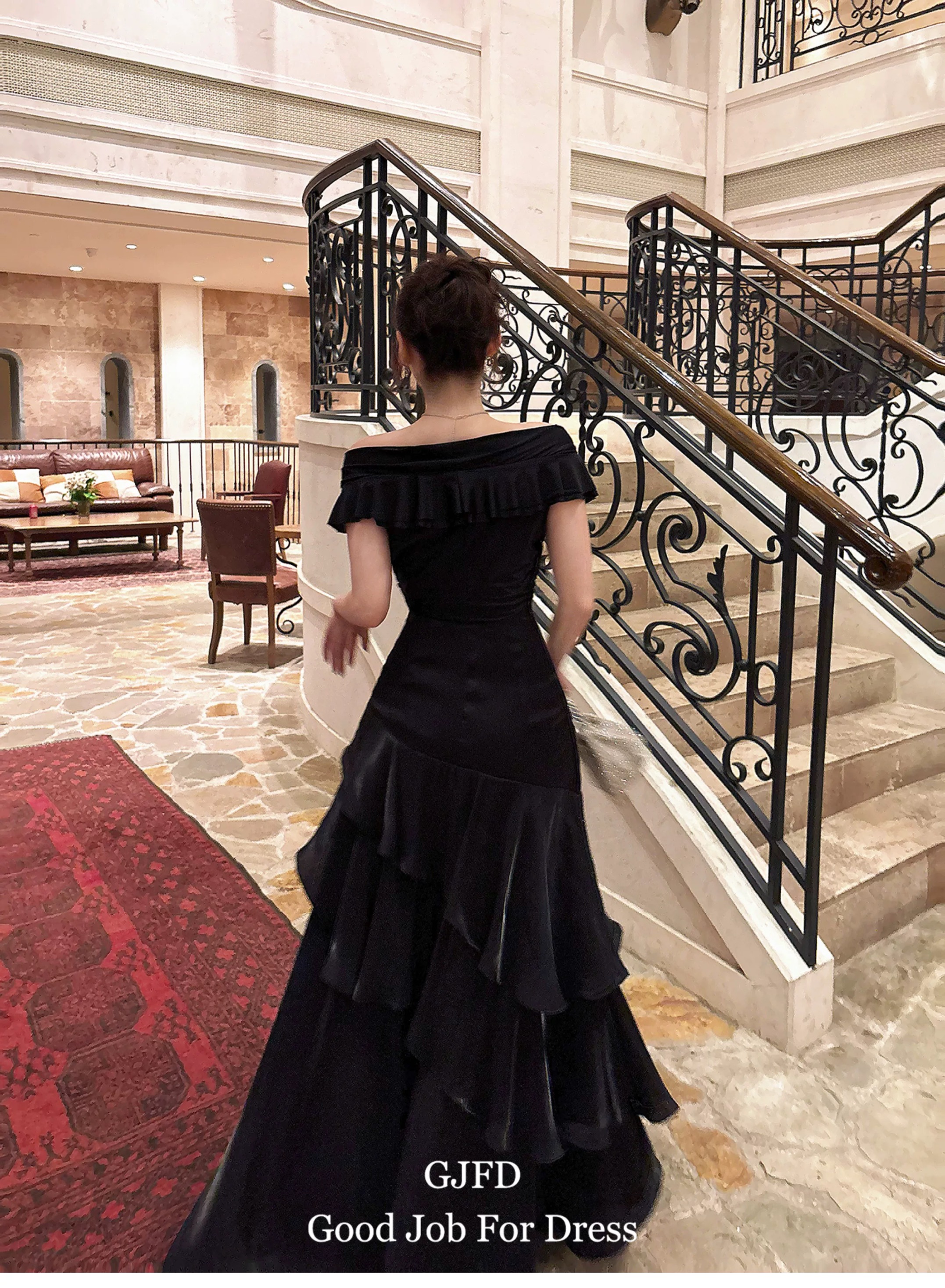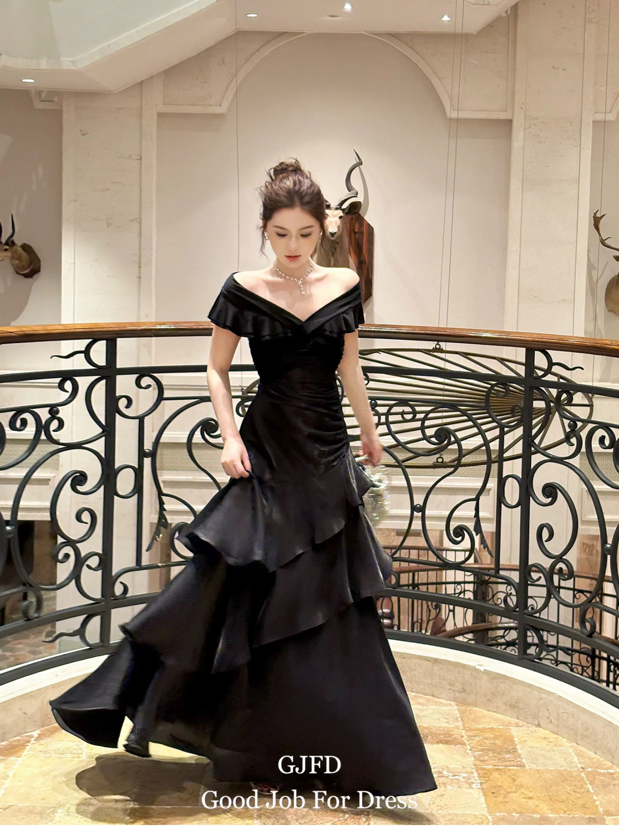 Good Job鲁本斯假日法式黑色一字肩轻奢连衣裙小众礼服鱼尾裙