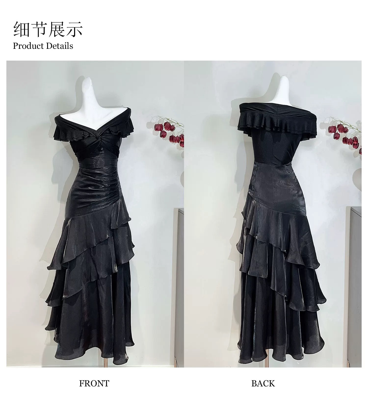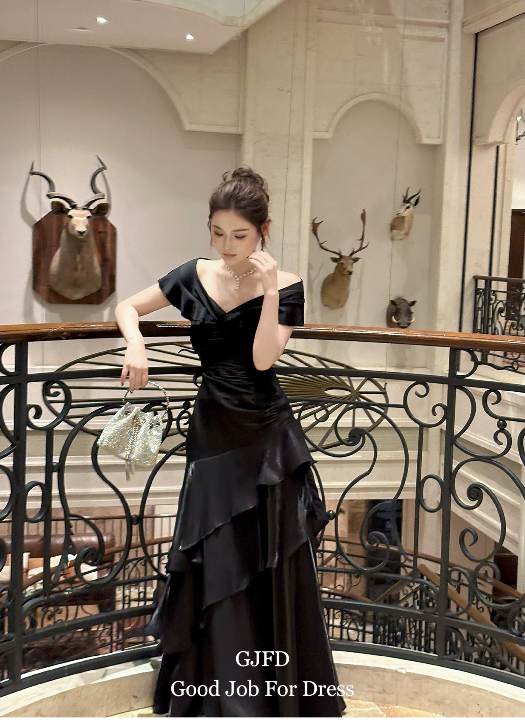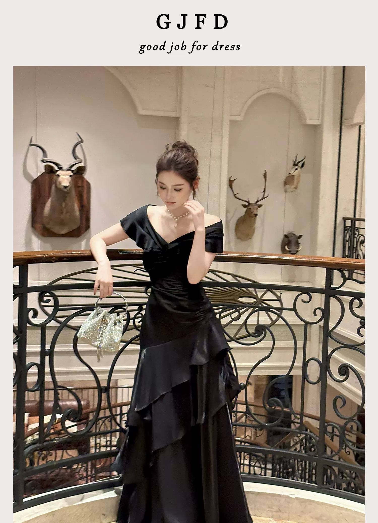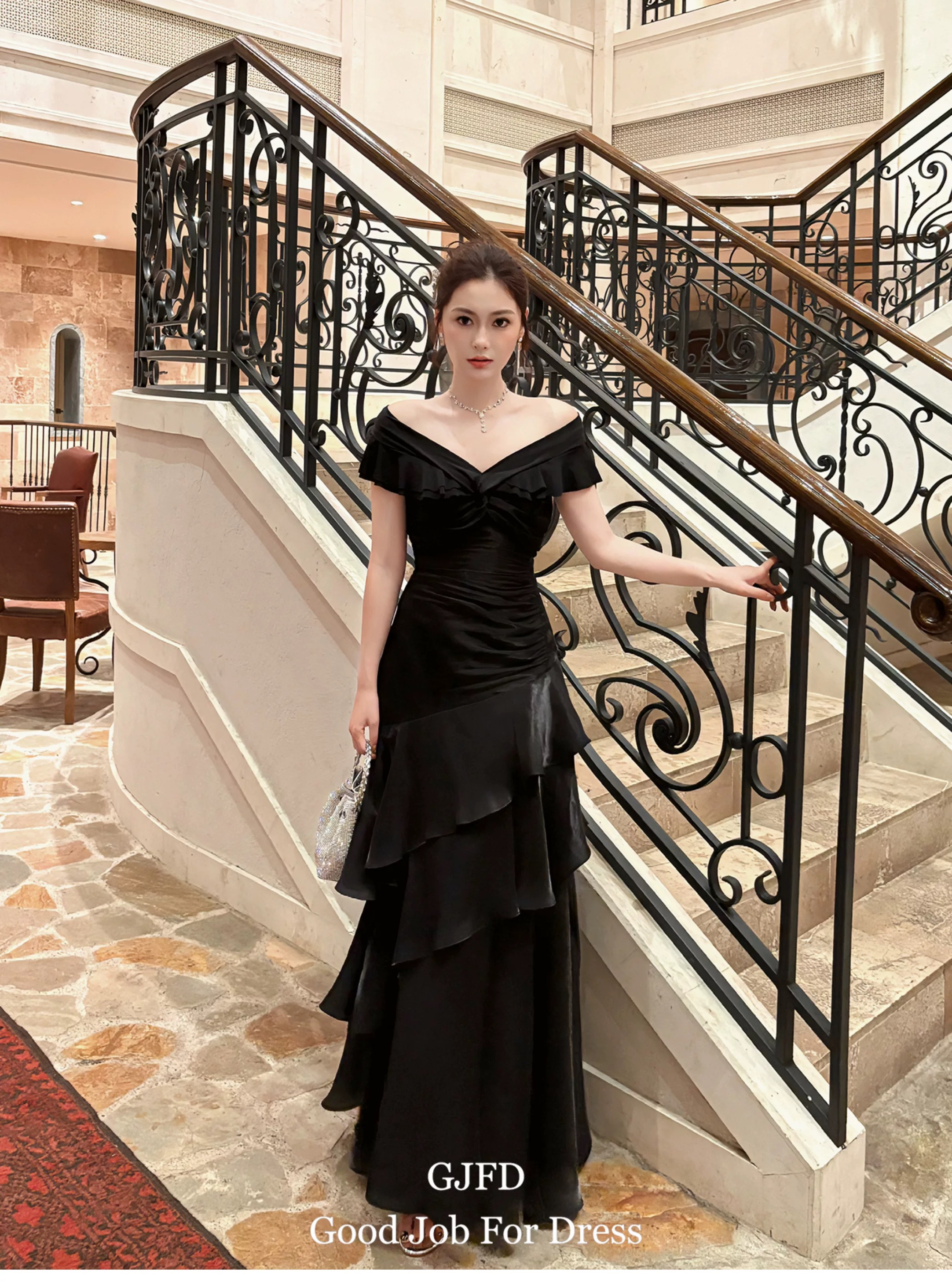 Good Job鲁本斯假日法式黑色一字肩轻奢连衣裙小众礼服鱼尾裙