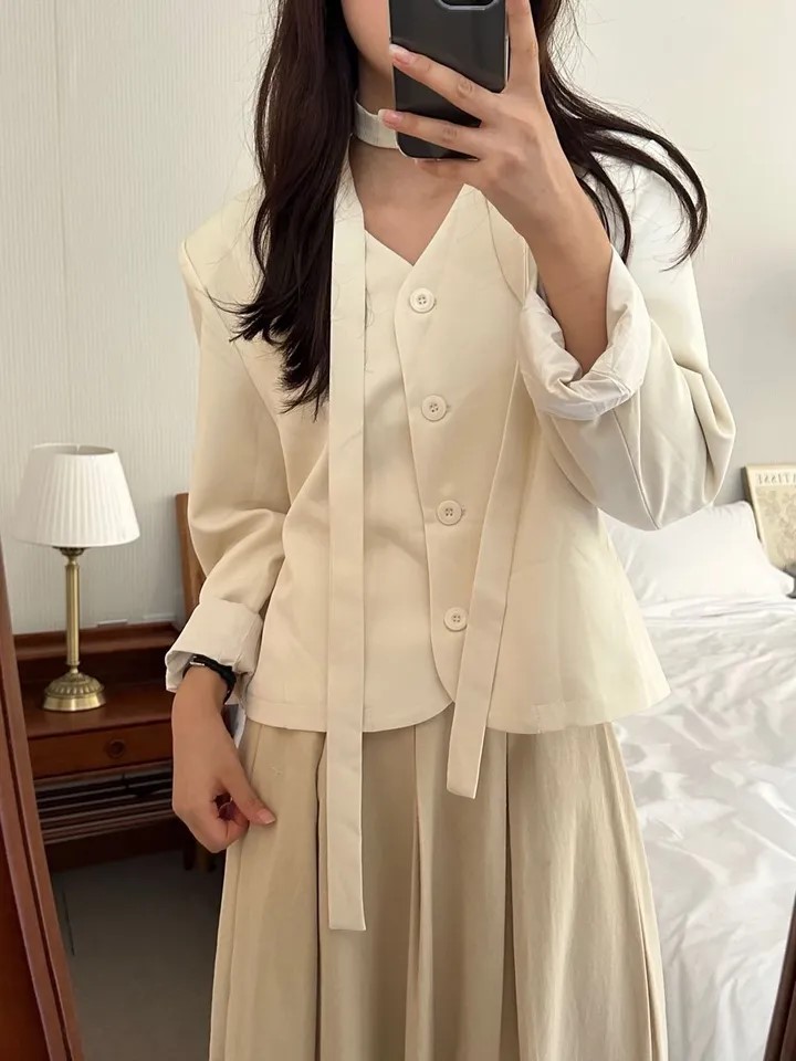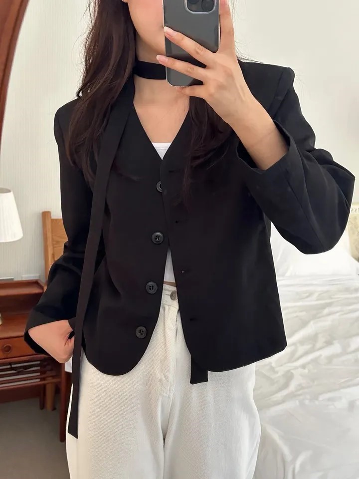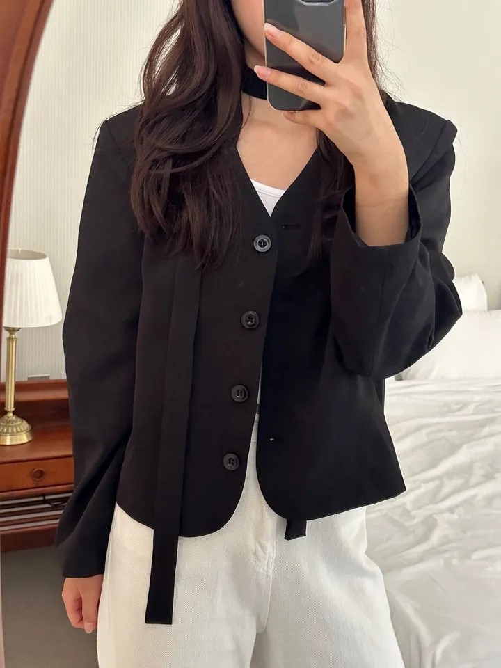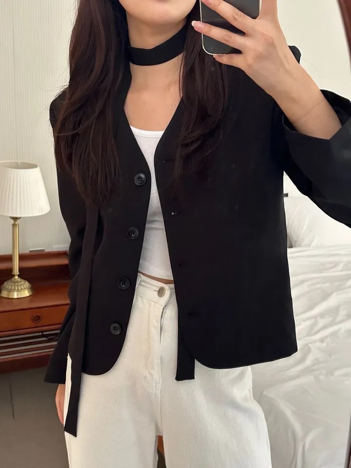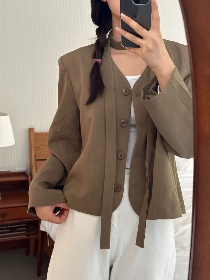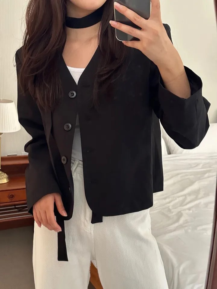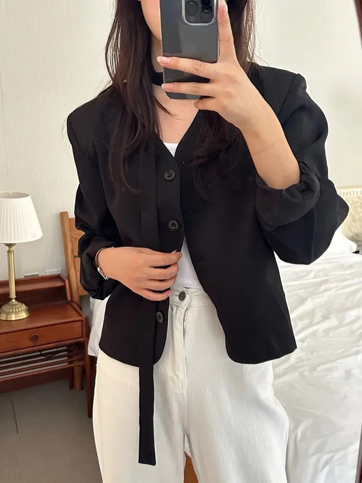 韩国chic春秋复古V领系带单排扣宽松休闲百搭长袖西装短外套女