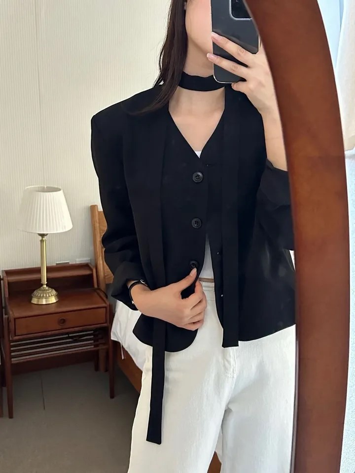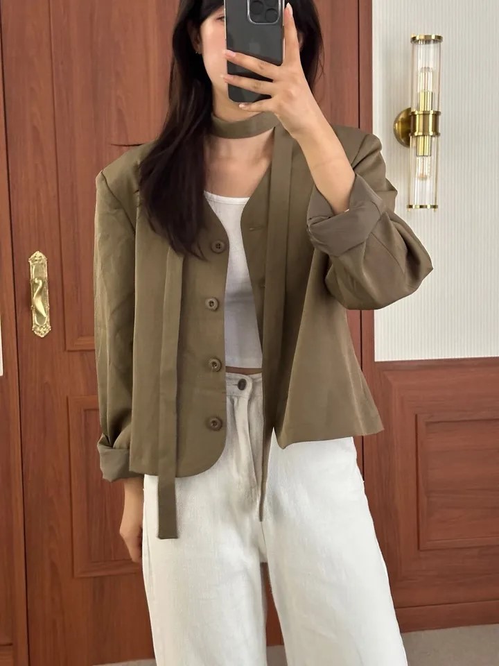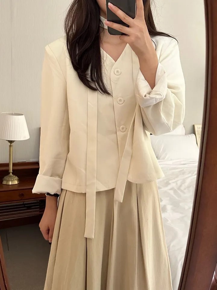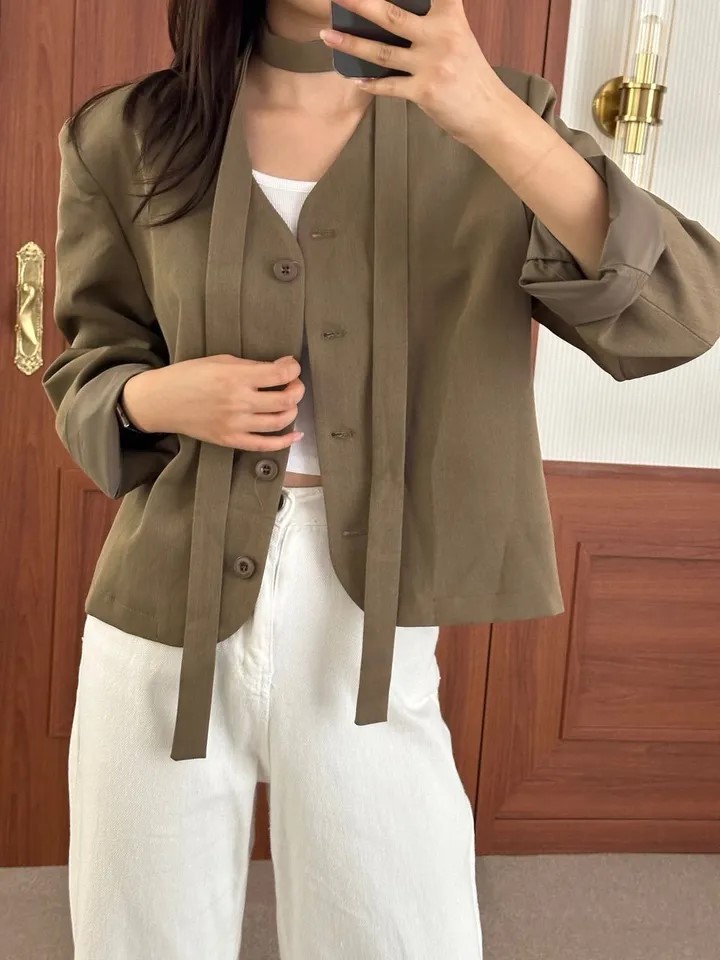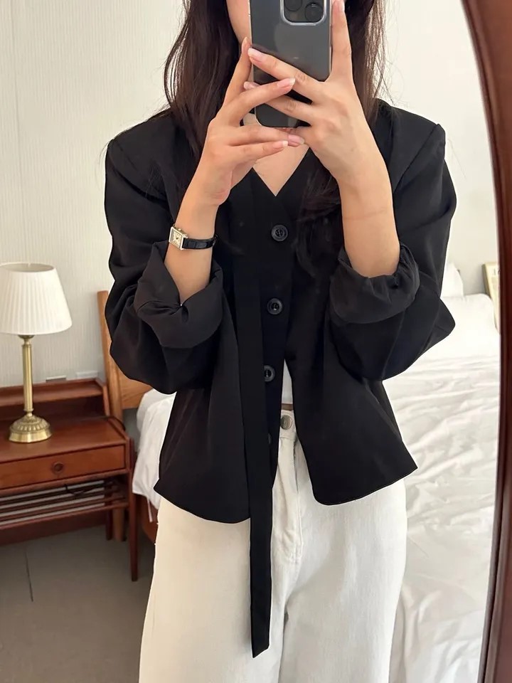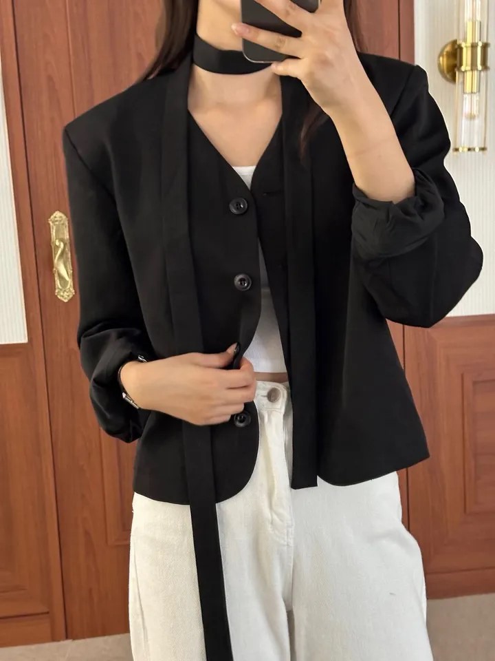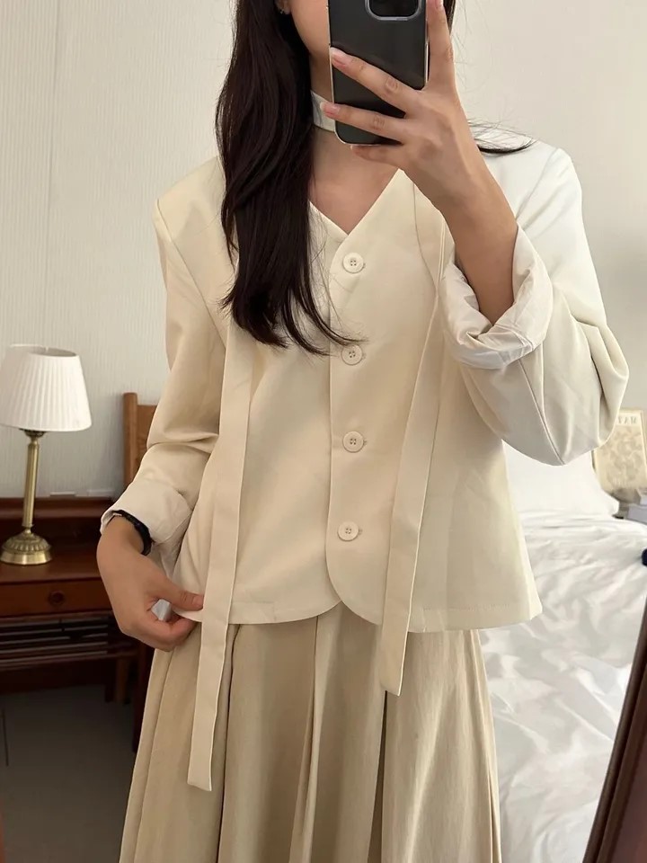 韩国chic春秋复古V领系带单排扣宽松休闲百搭长袖西装短外套女