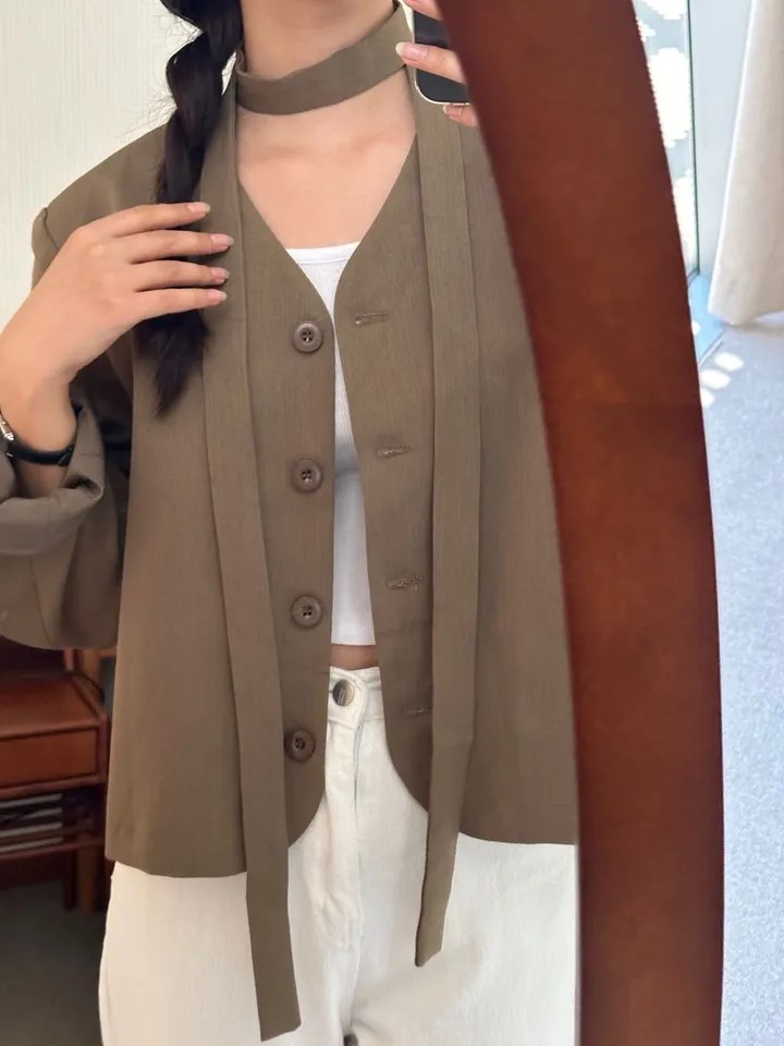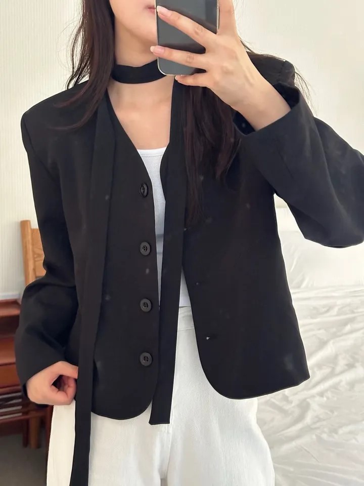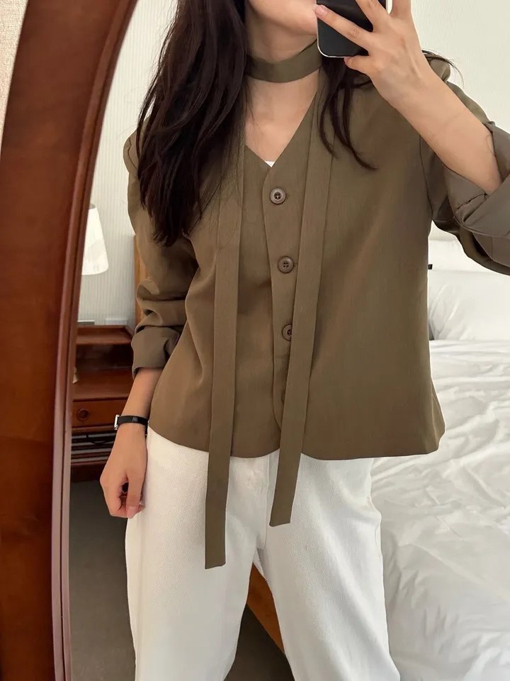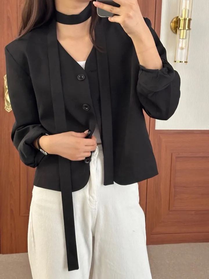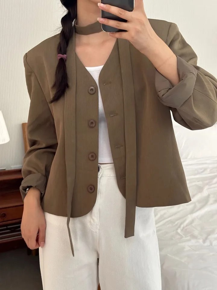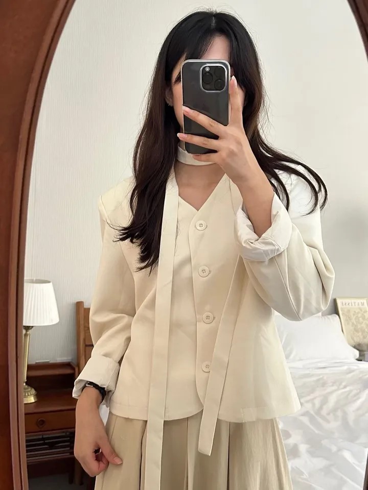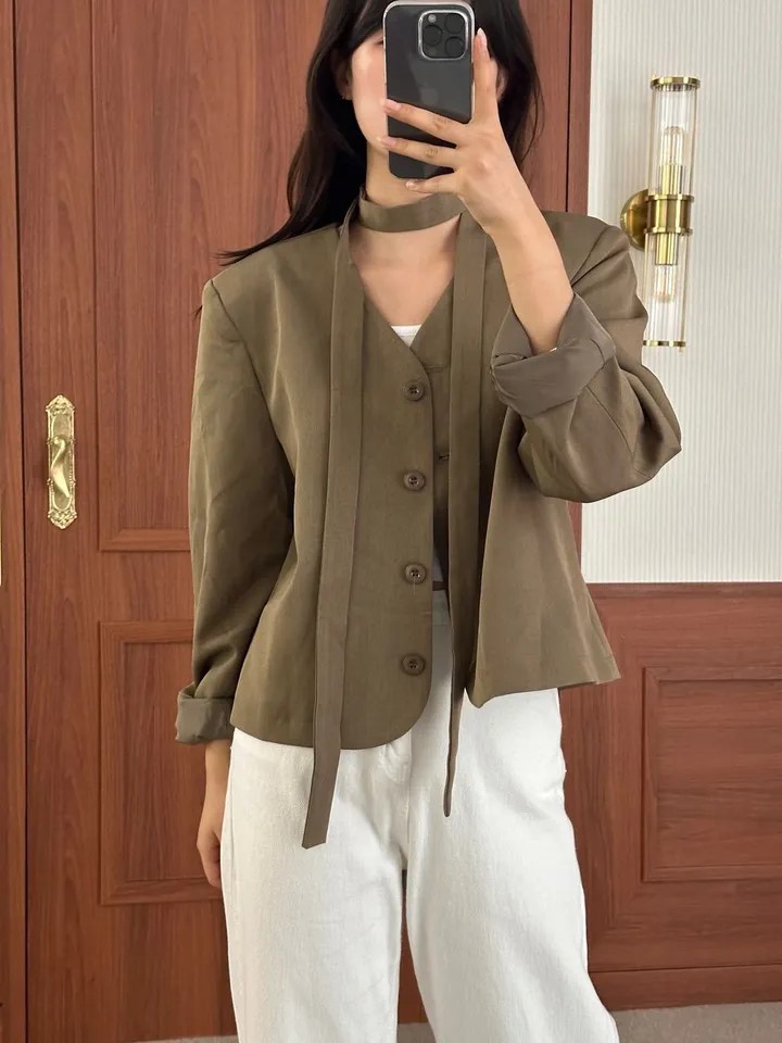 韩国chic春秋复古V领系带单排扣宽松休闲百搭长袖西装短外套女