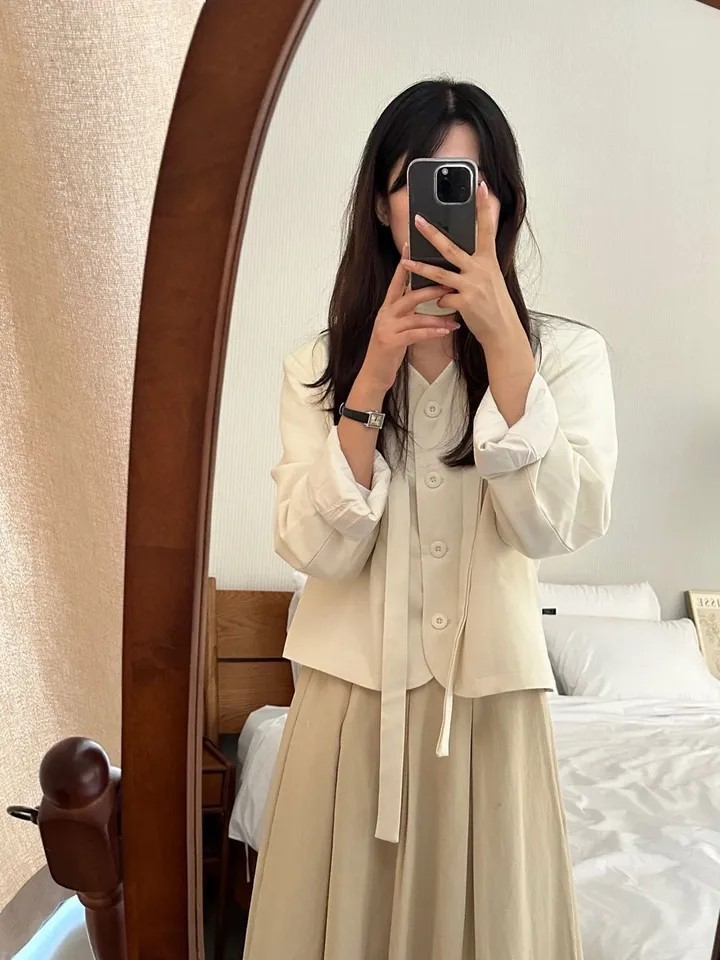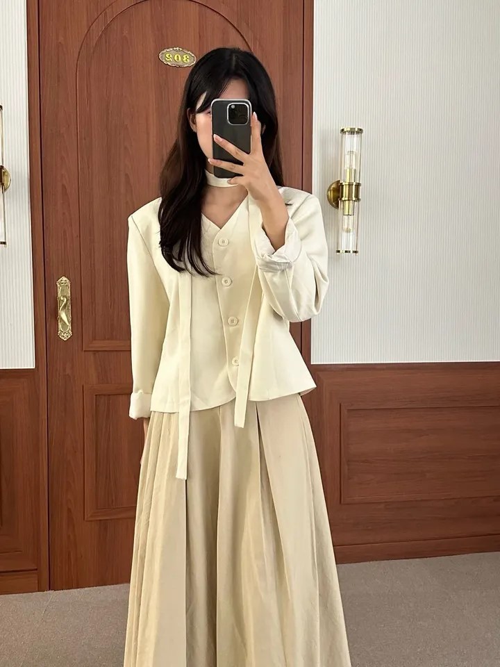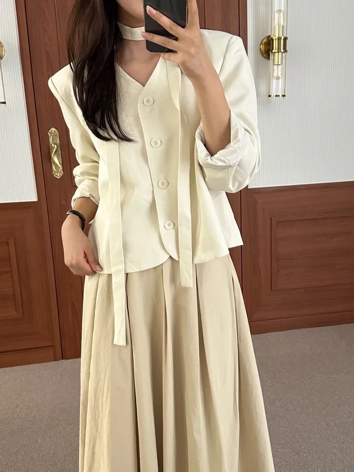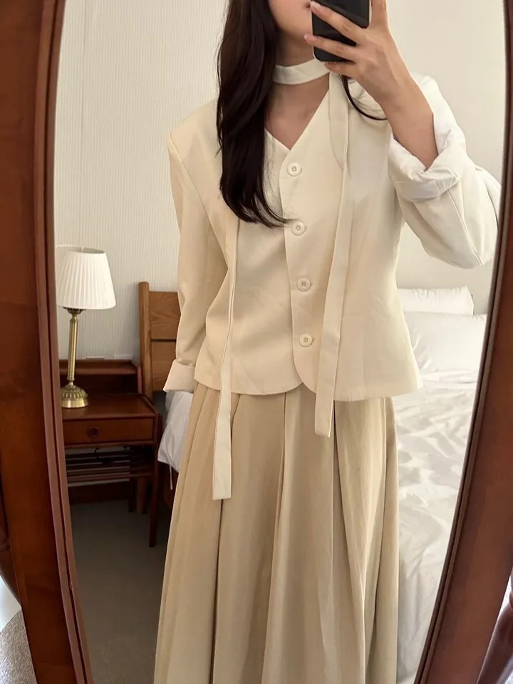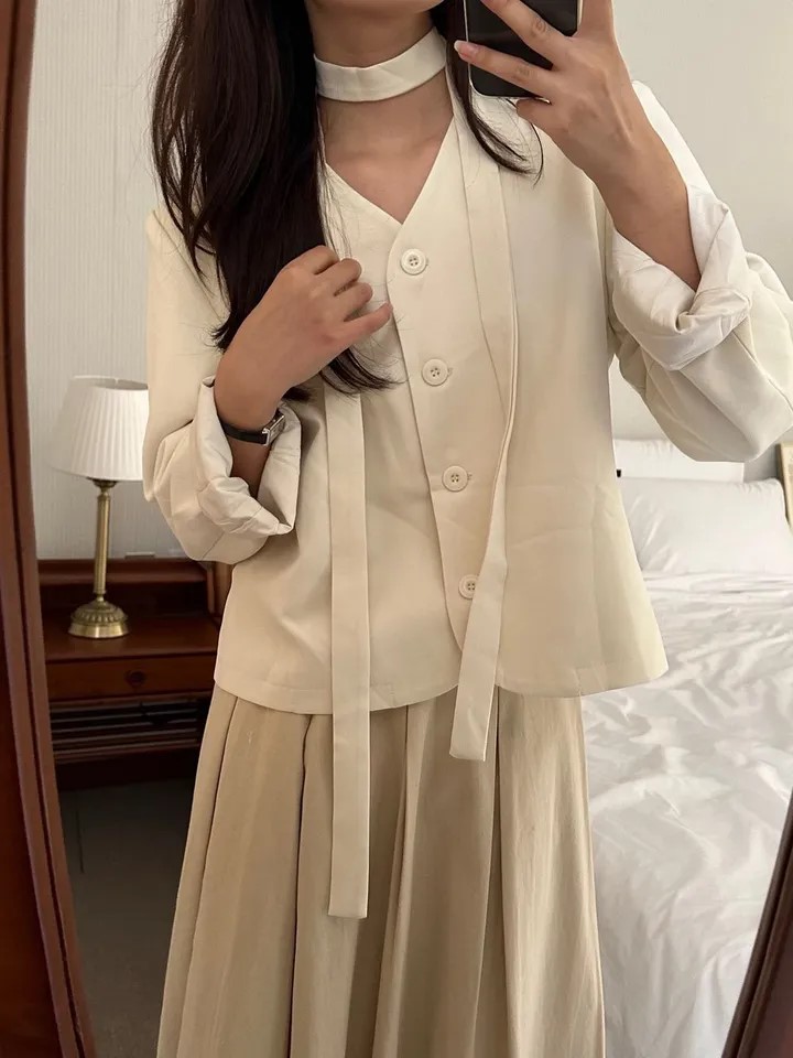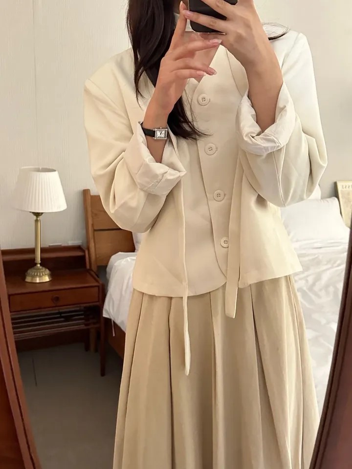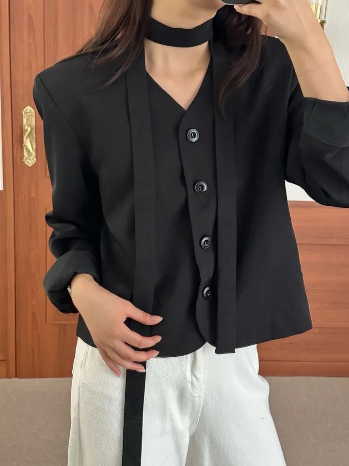 韩国chic春秋复古V领系带单排扣宽松休闲百搭长袖西装短外套女