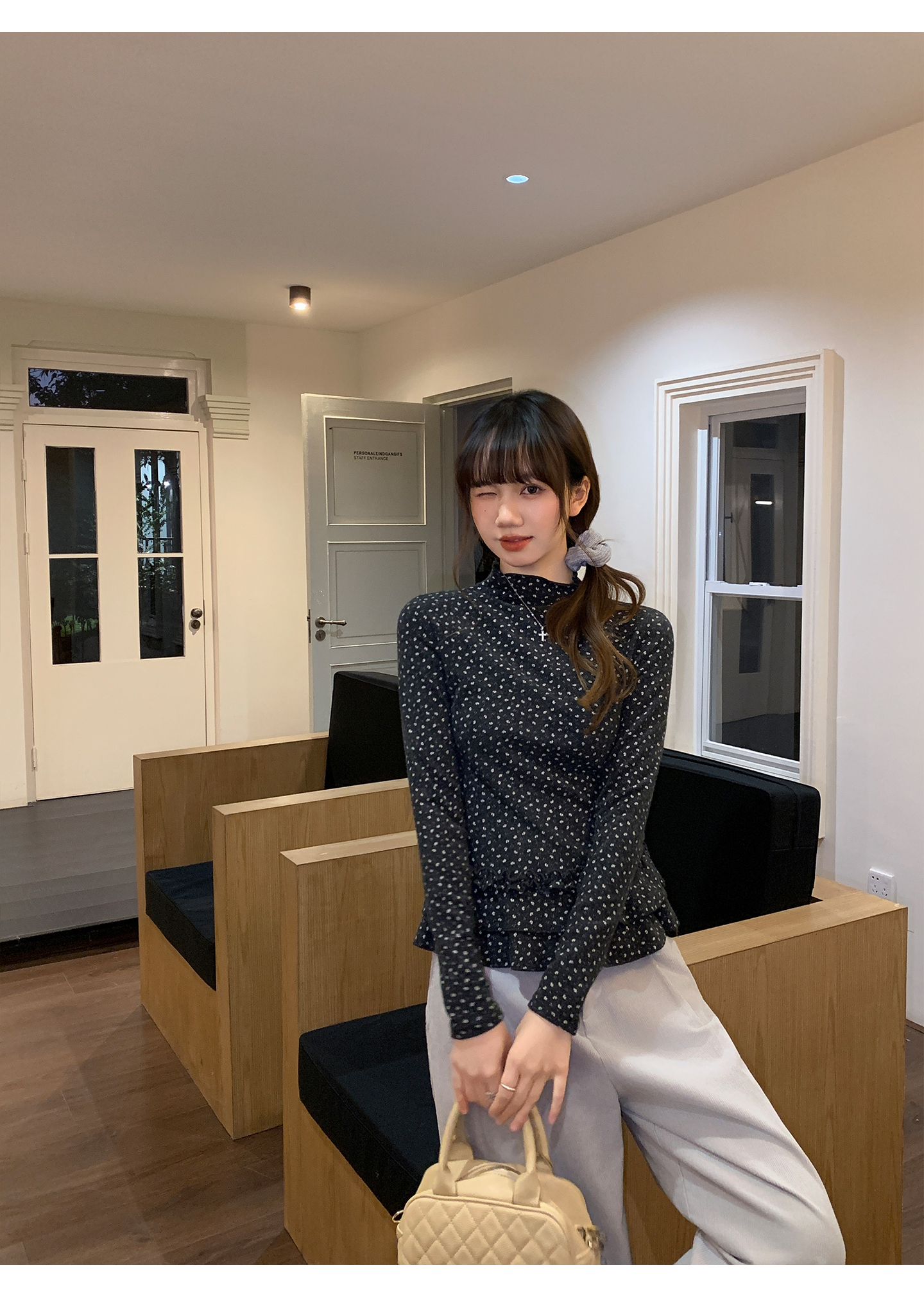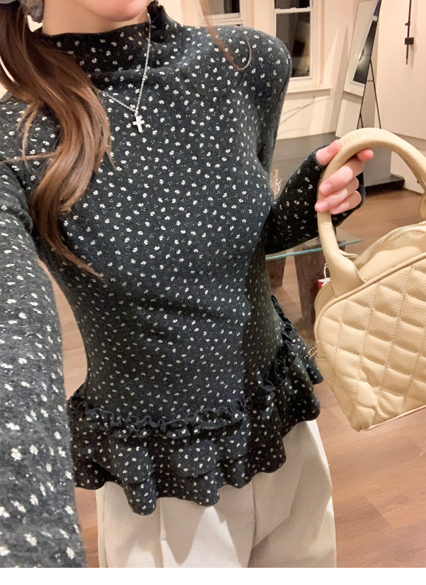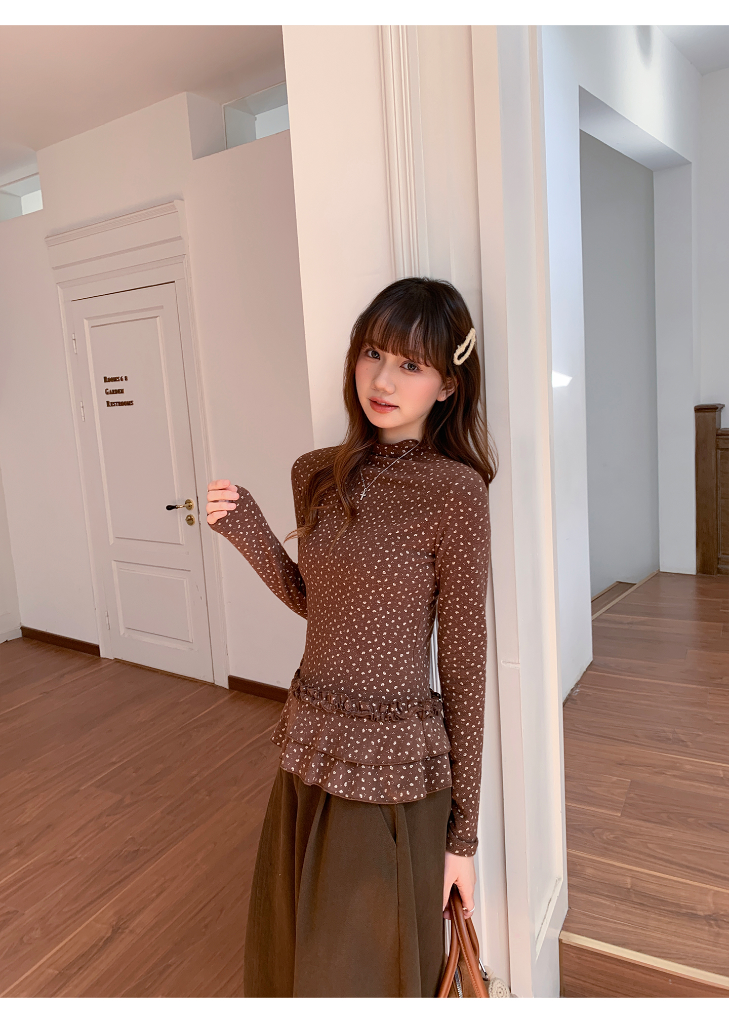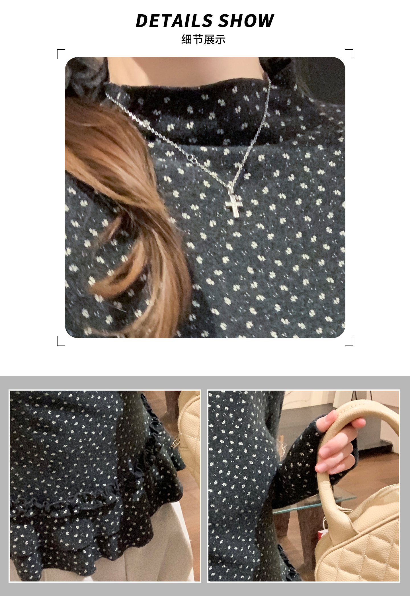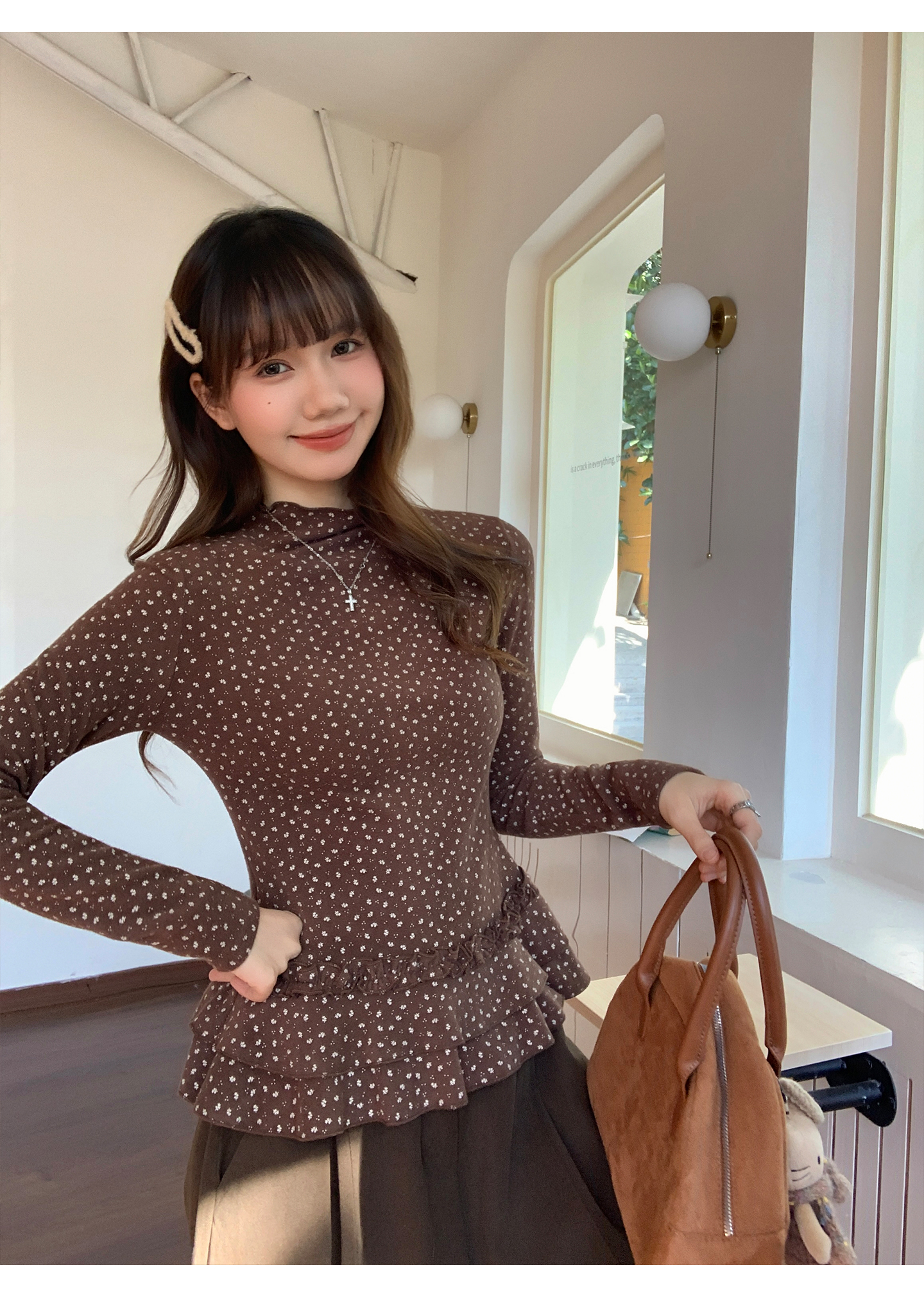 实拍实价#碎花半高领打底衫女外磨毛2026春冬长袖t恤拼接下摆花边