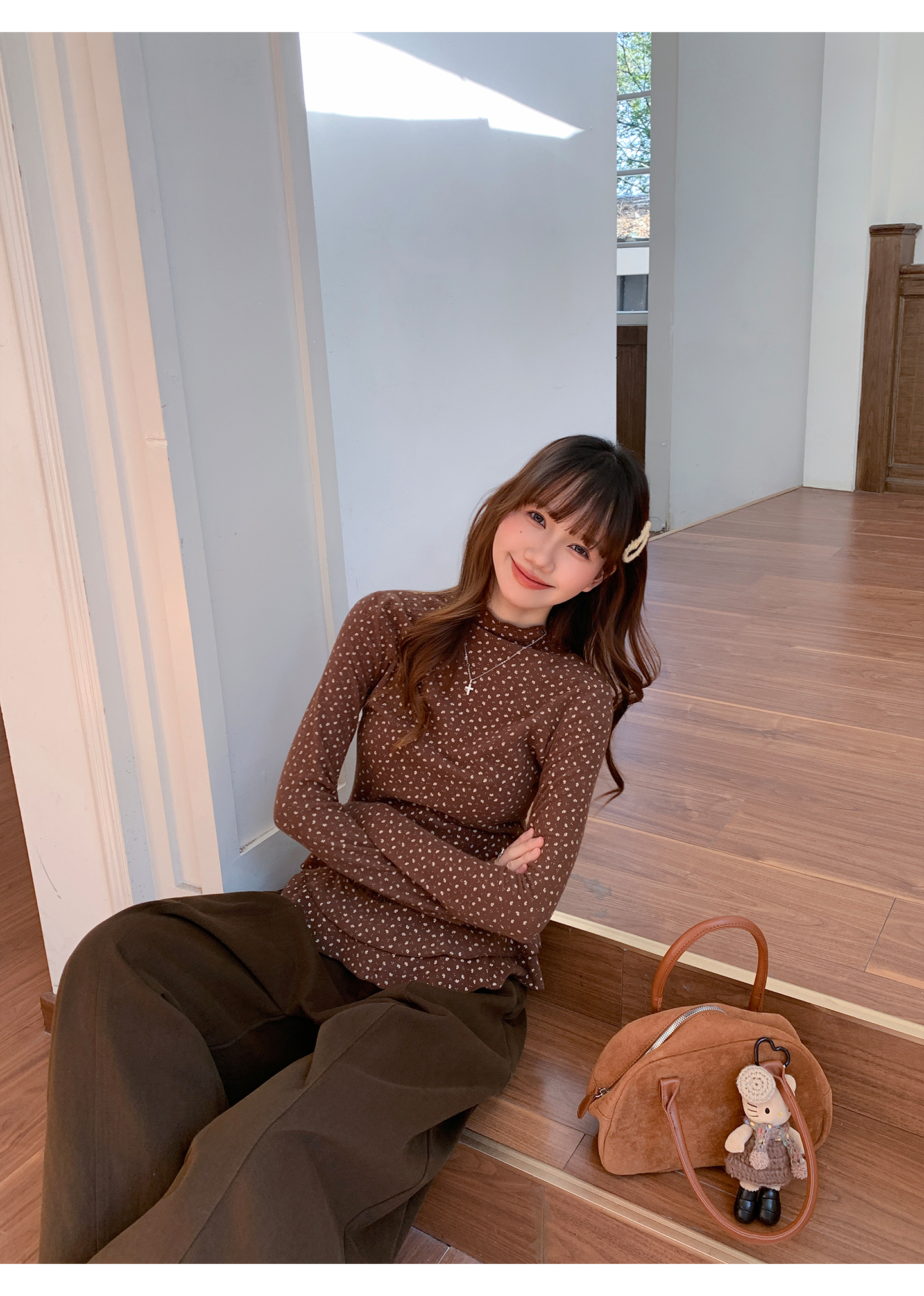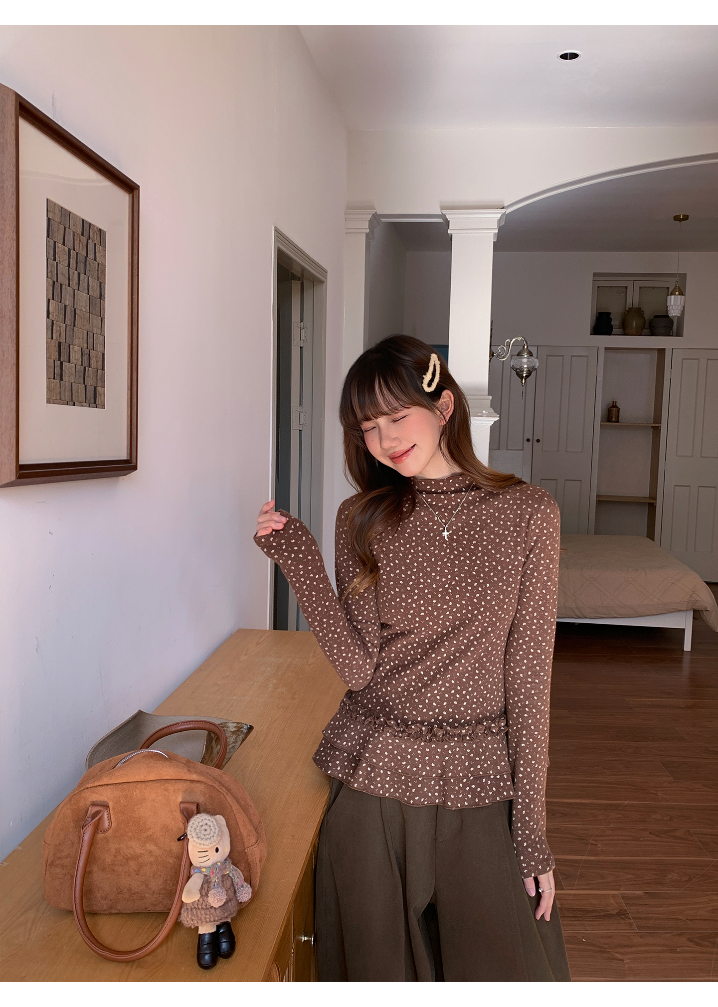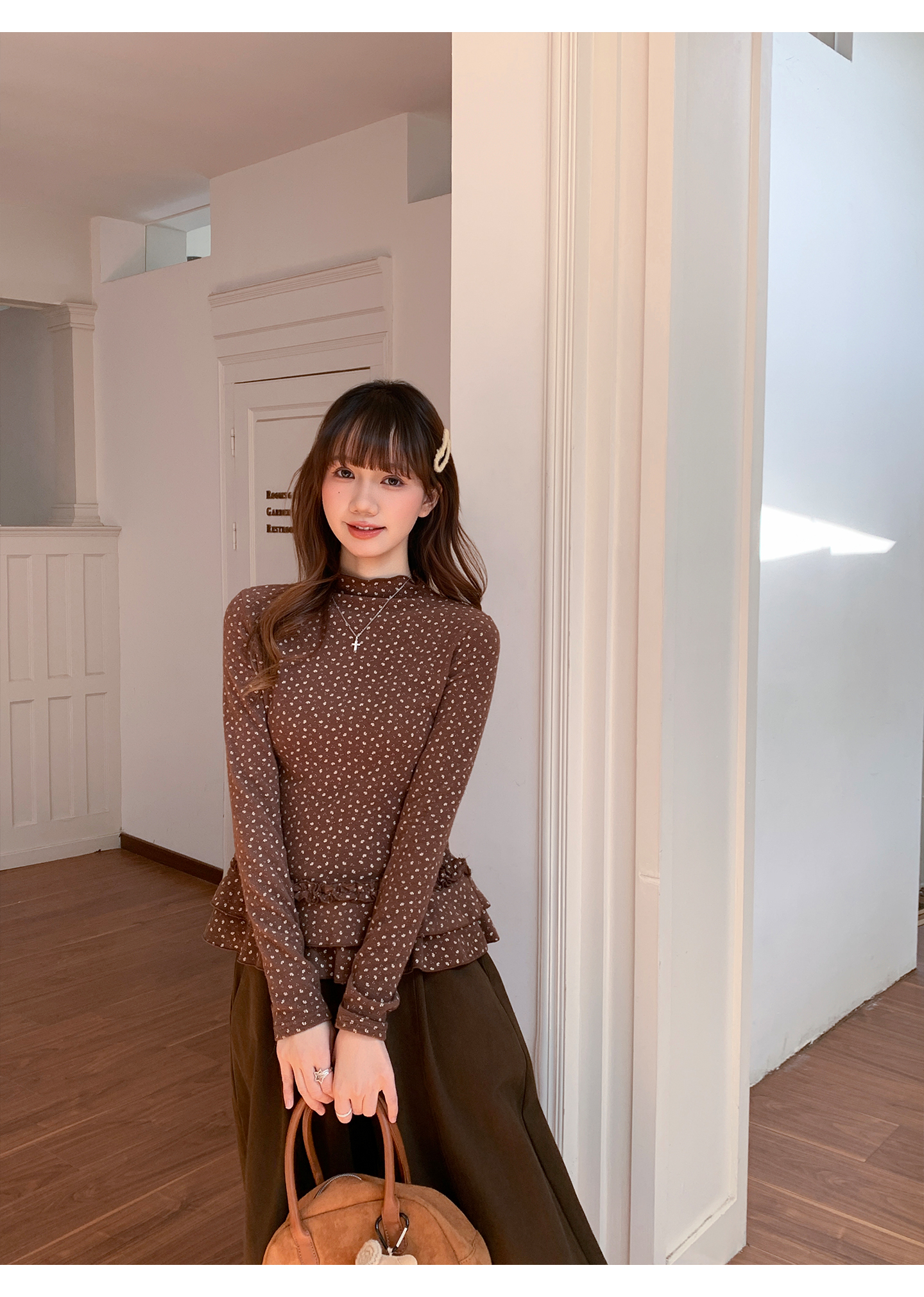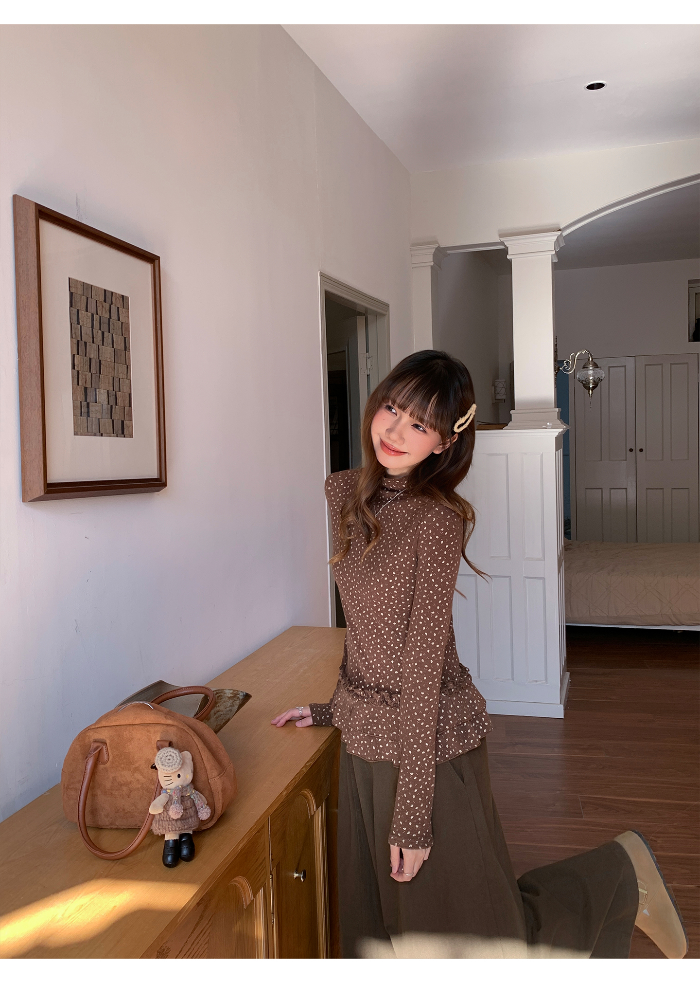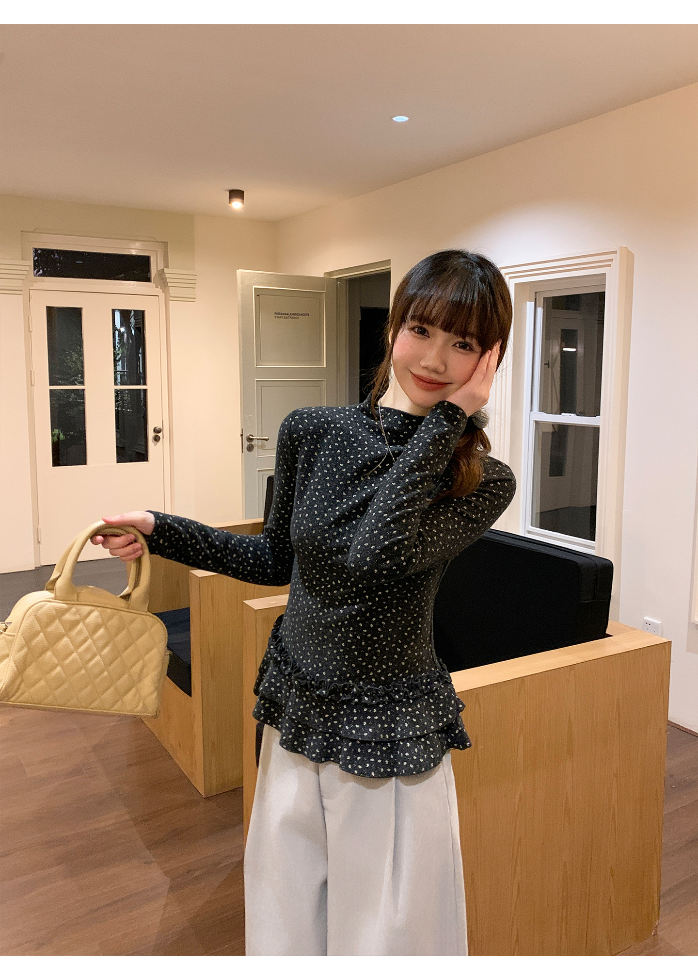 实拍实价#碎花半高领打底衫女外磨毛2026春冬长袖t恤拼接下摆花边