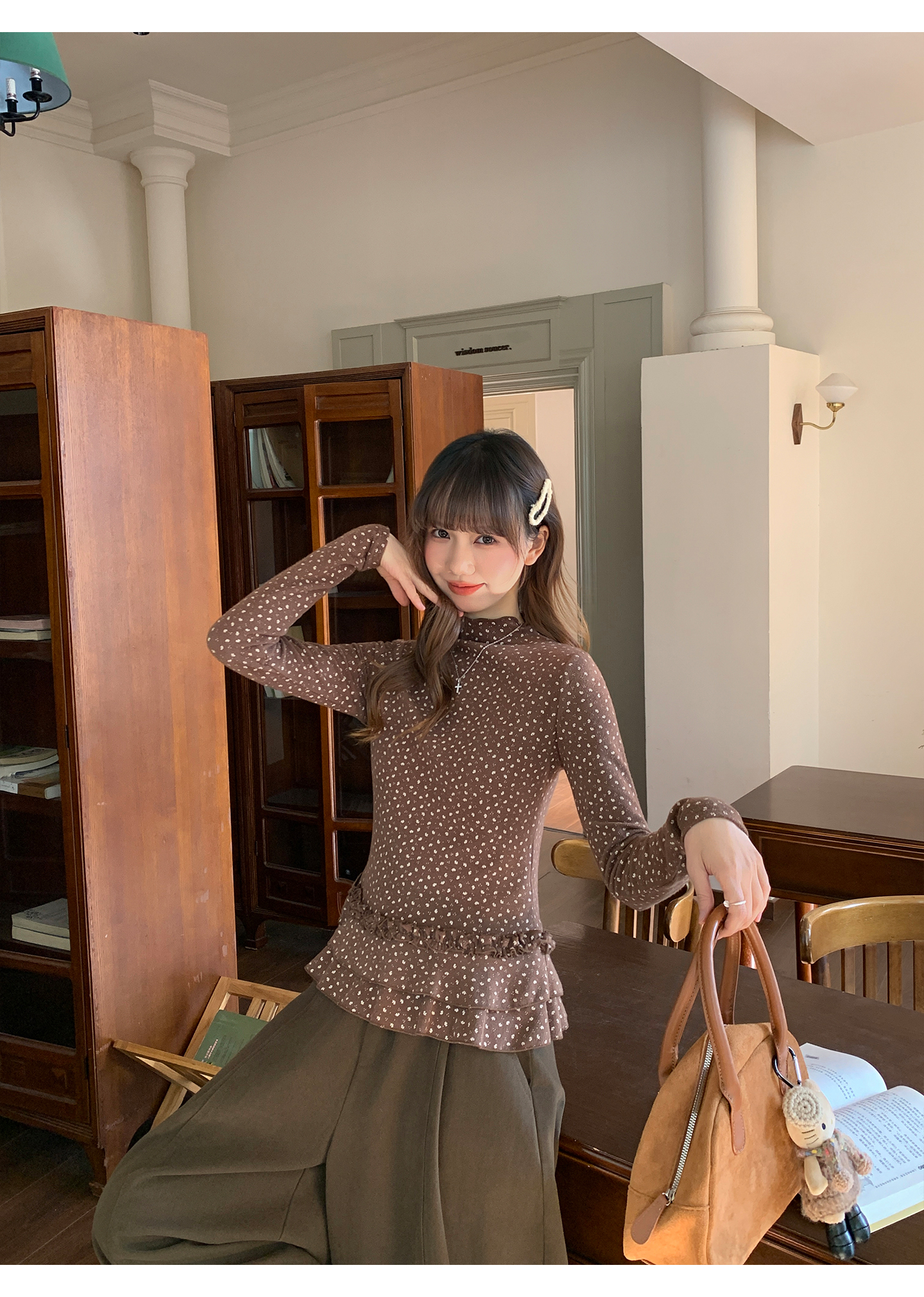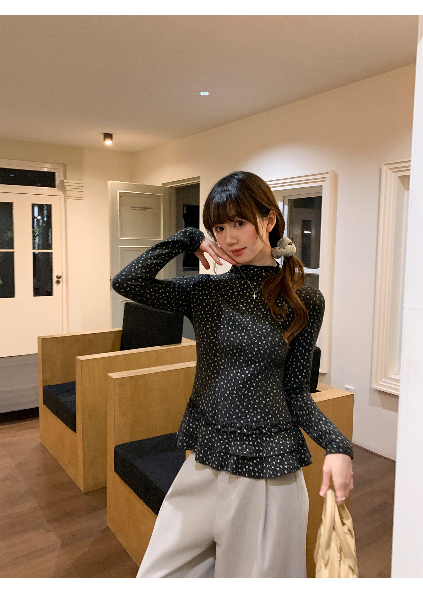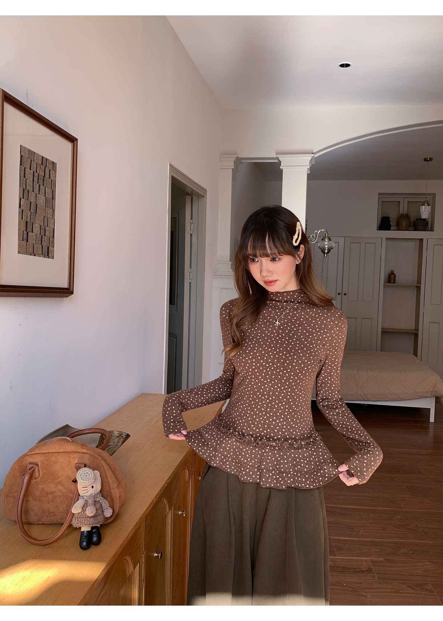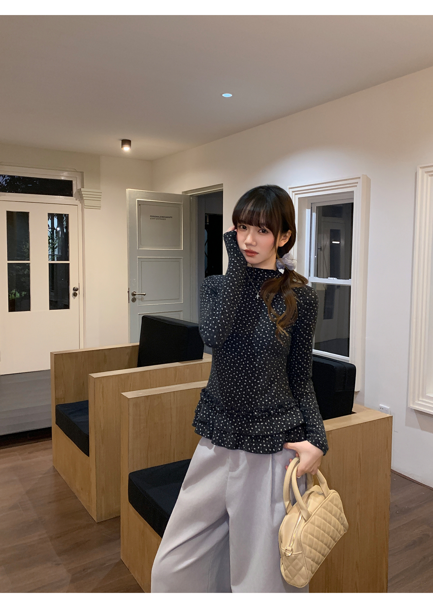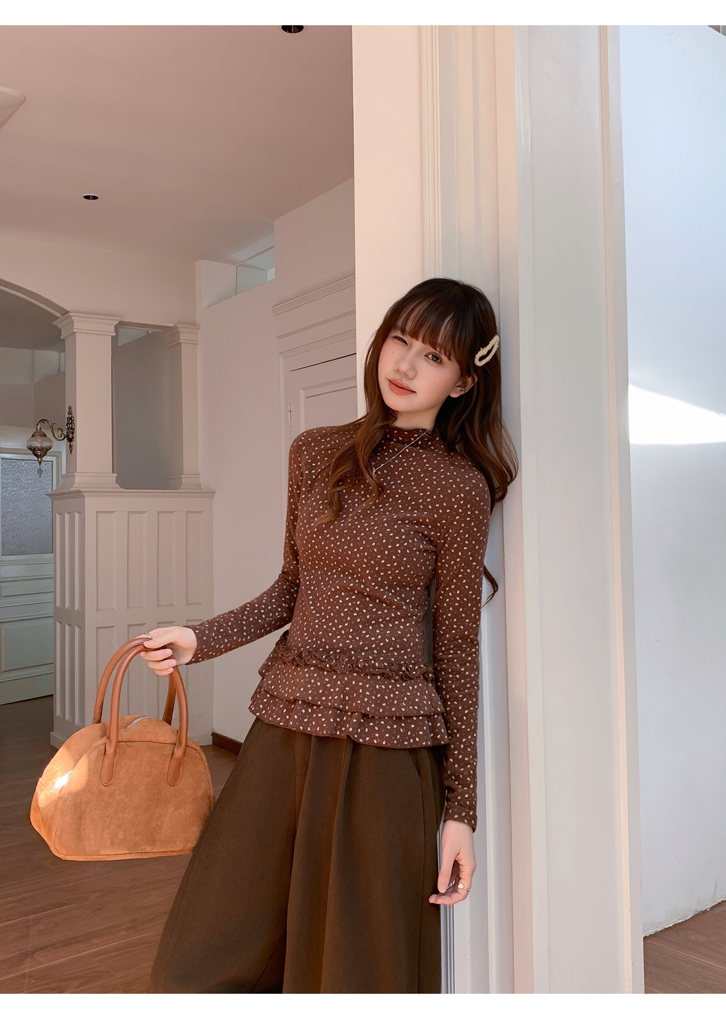 实拍实价#碎花半高领打底衫女外磨毛2026春冬长袖t恤拼接下摆花边