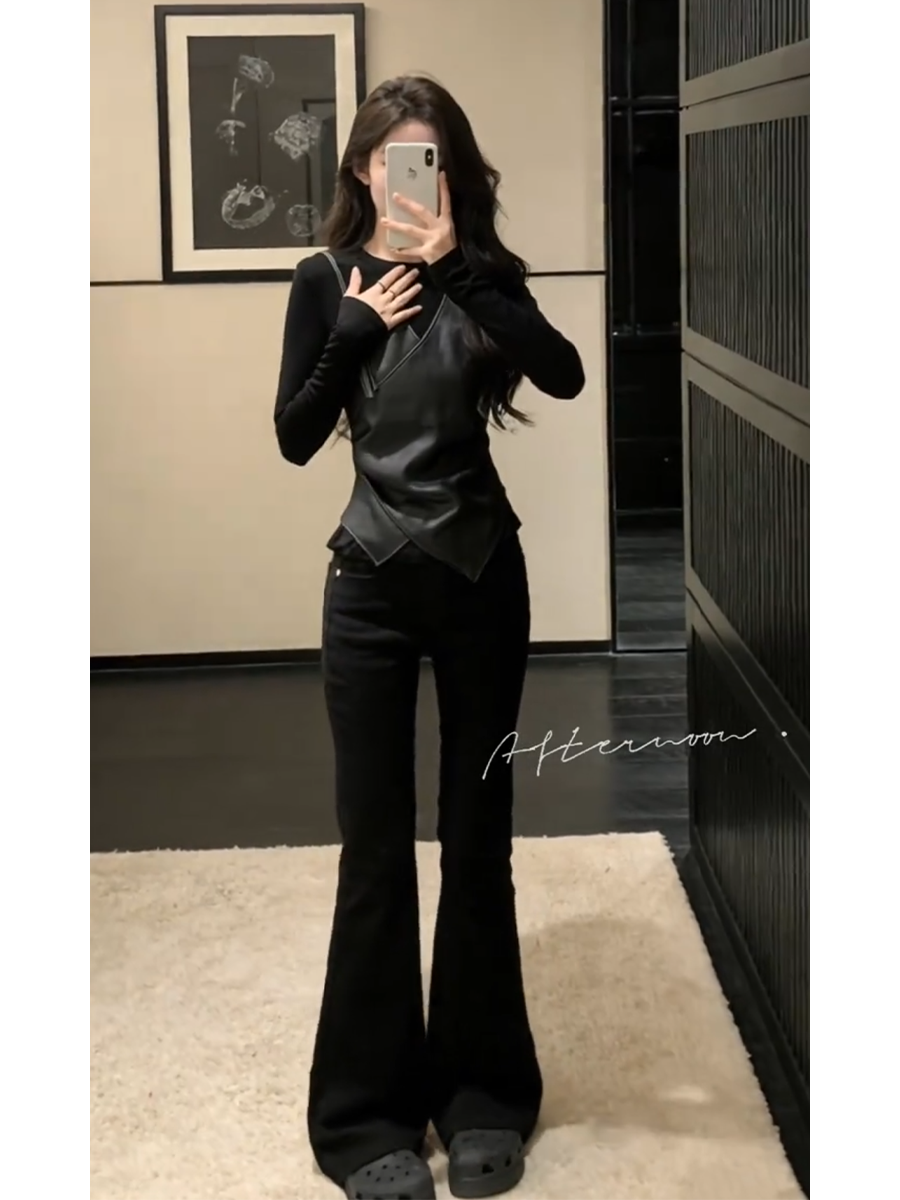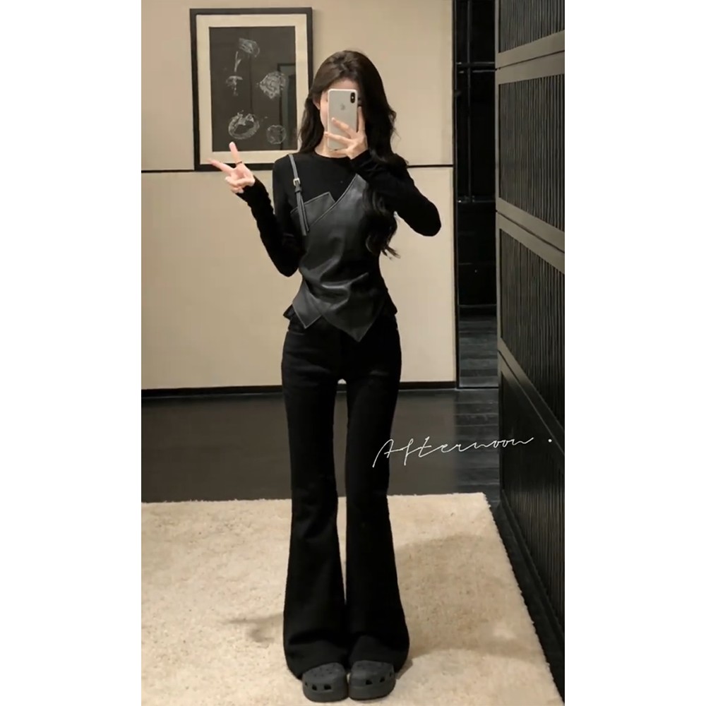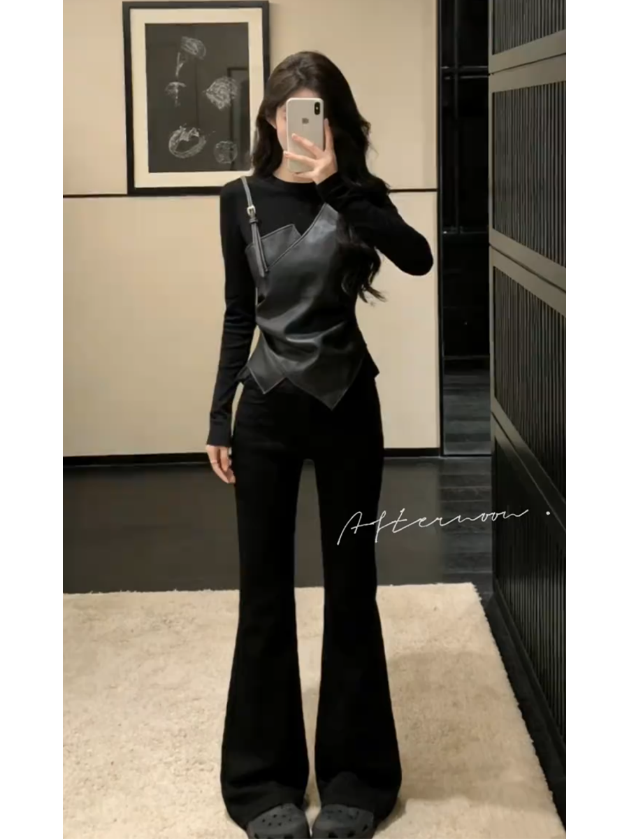 pu皮拼接假两件设计感长袖T恤女秋冬显瘦时尚打底衫上衣+裤套装