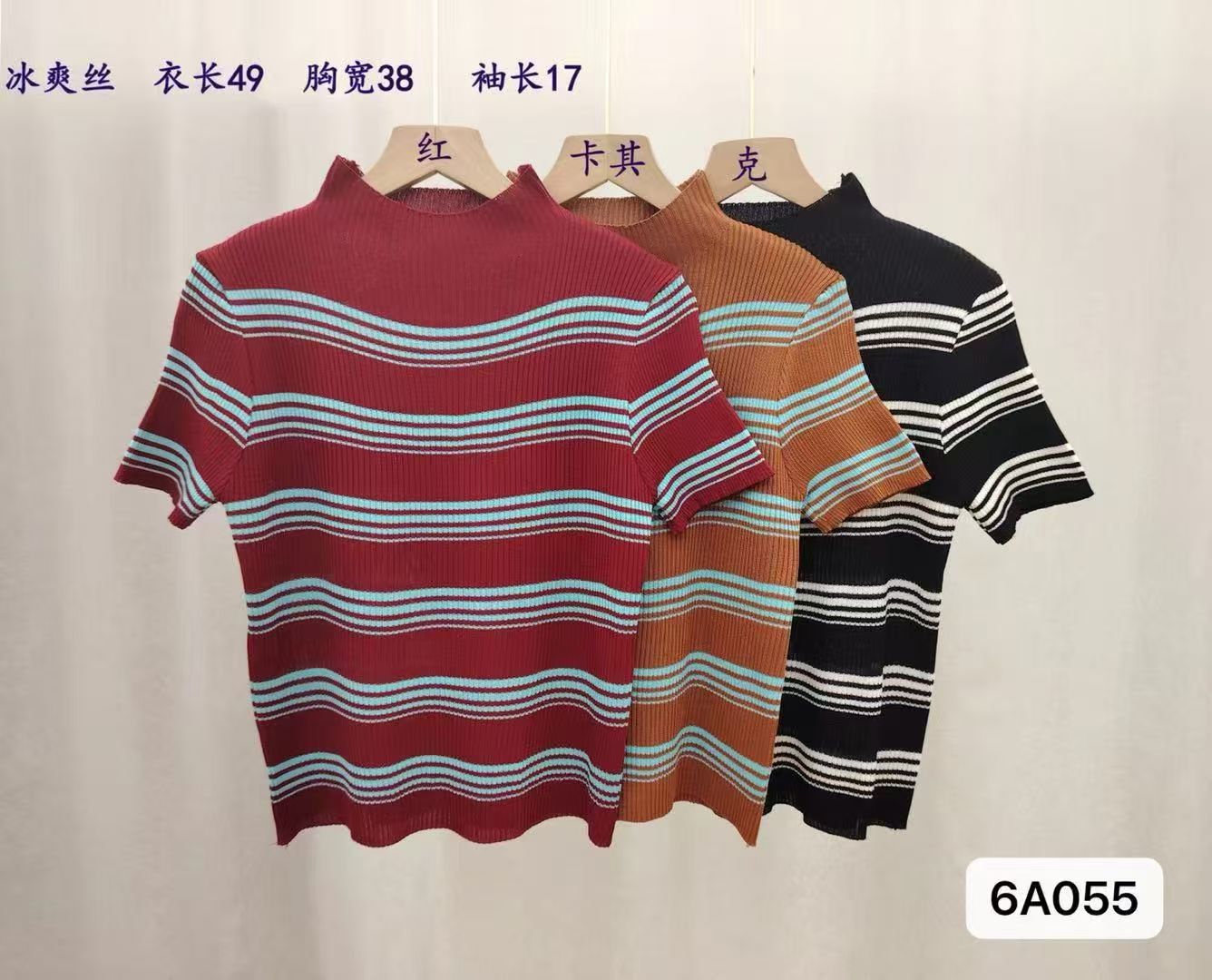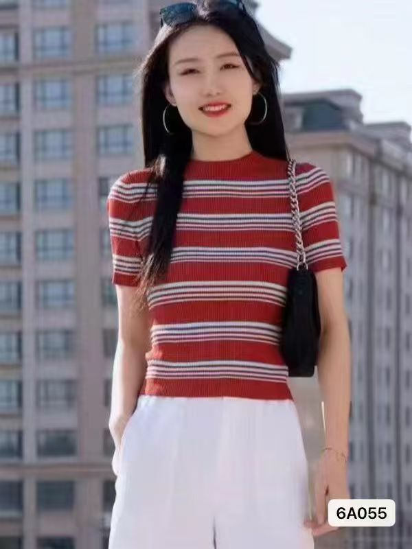 实价时尚复古半高领撞色条纹显瘦短袖上衣女