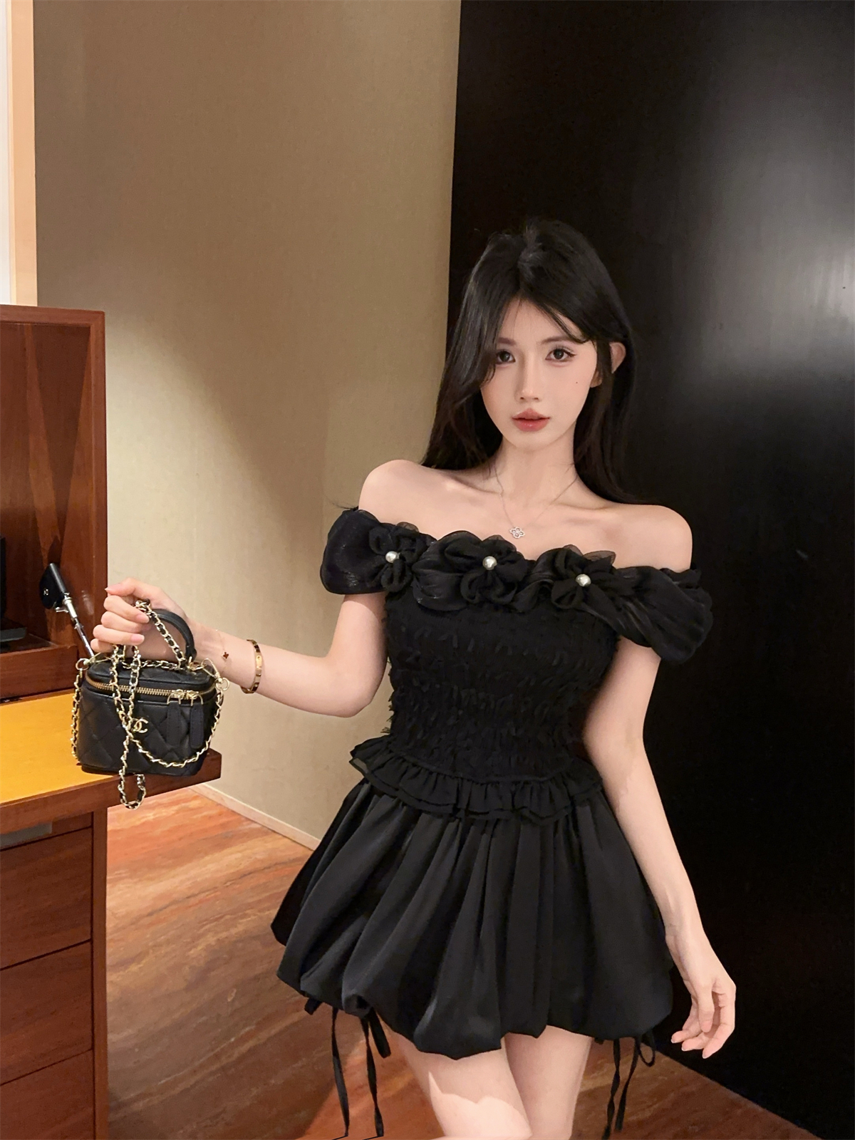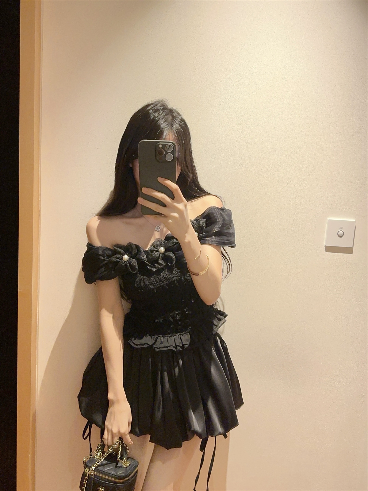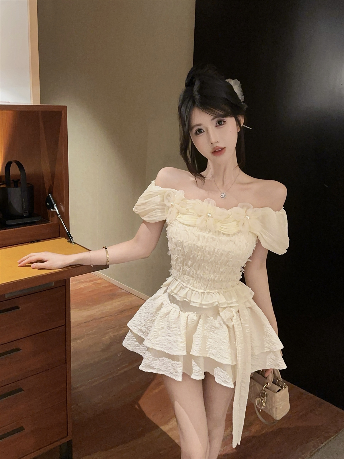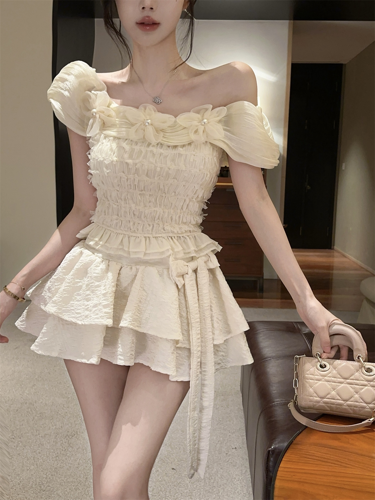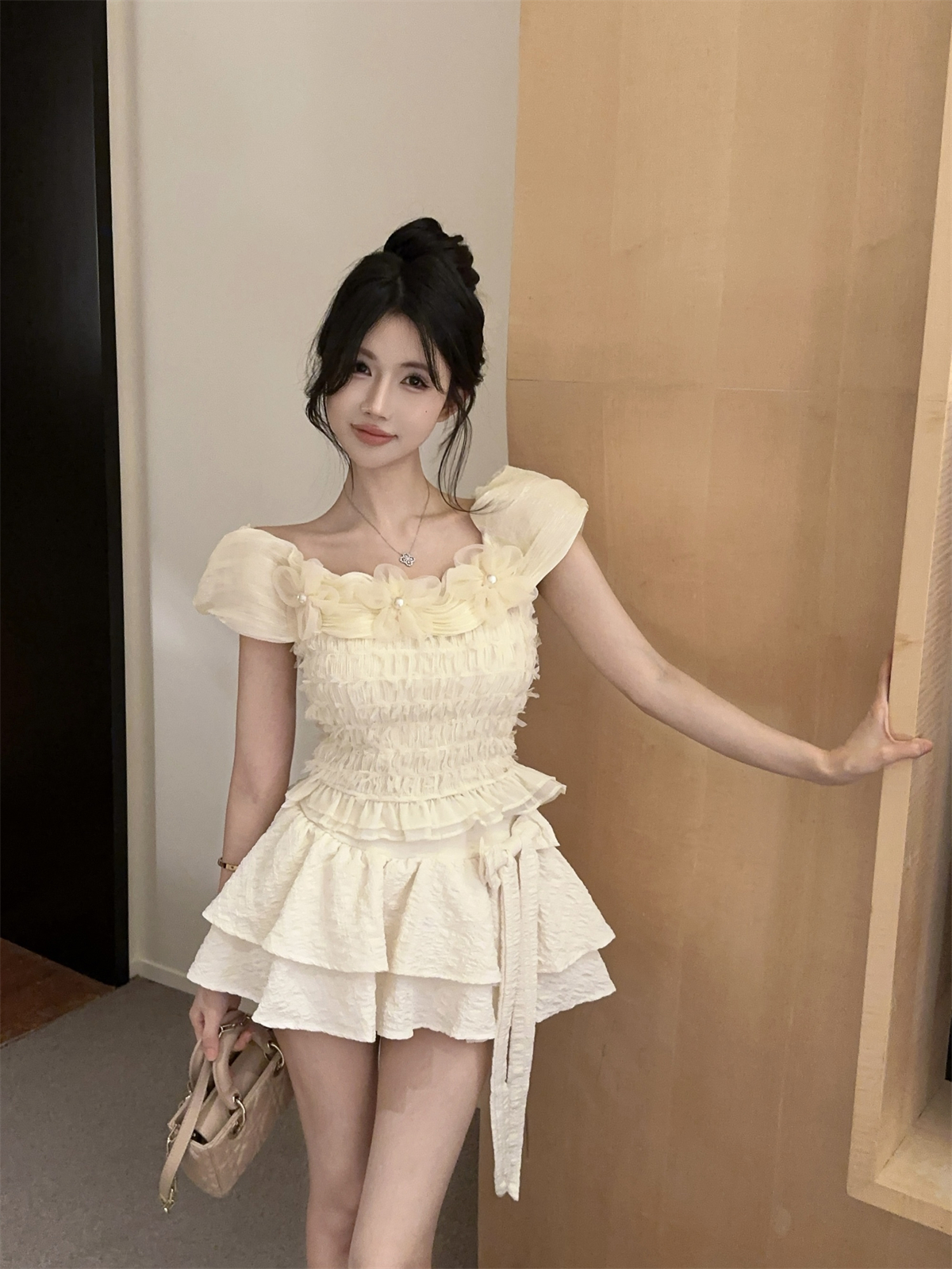 实拍实价 纯欲一字肩钉珠立体花荷叶边上衣高腰短裙裤女春套装