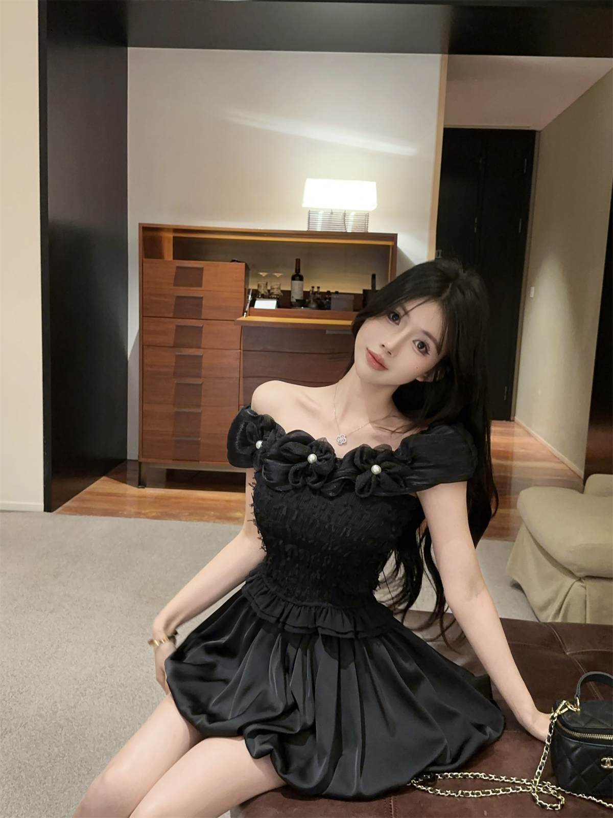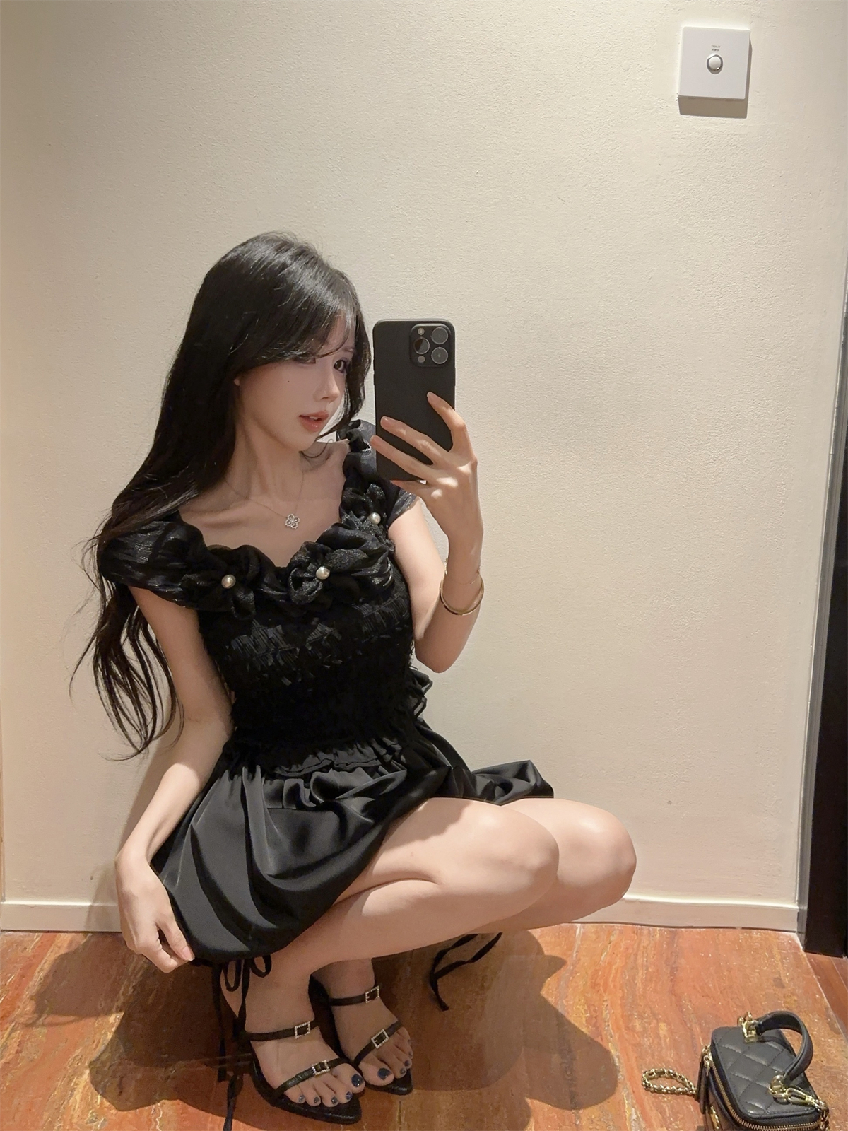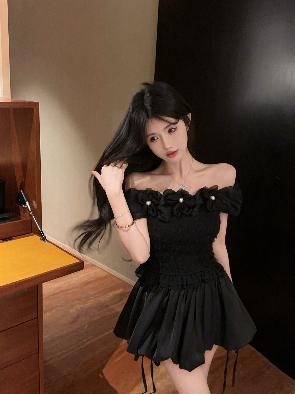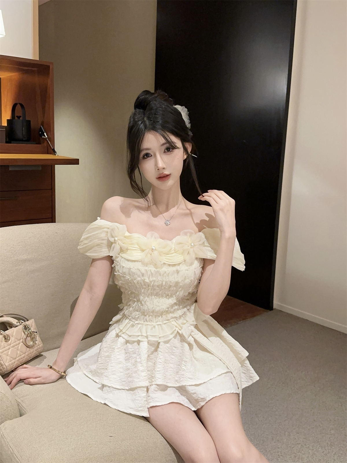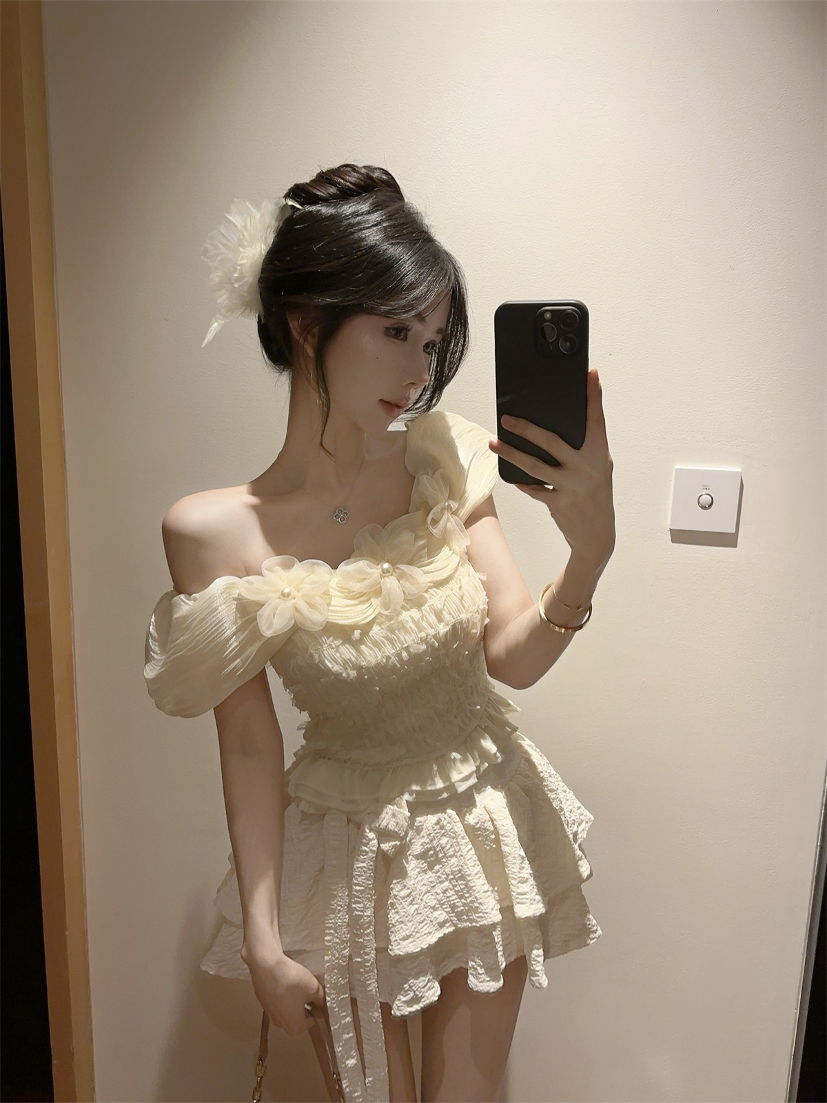 实拍实价 纯欲一字肩钉珠立体花荷叶边上衣高腰短裙裤女春套装