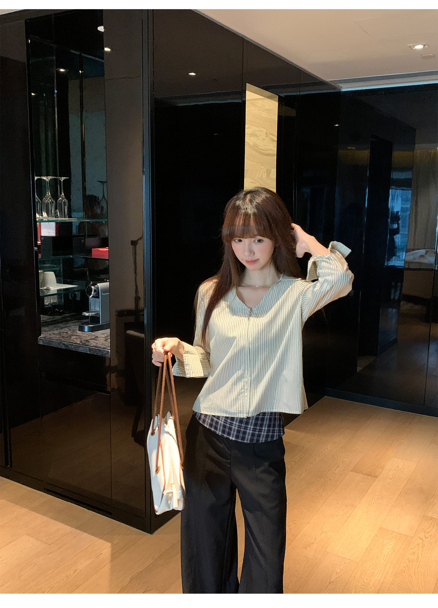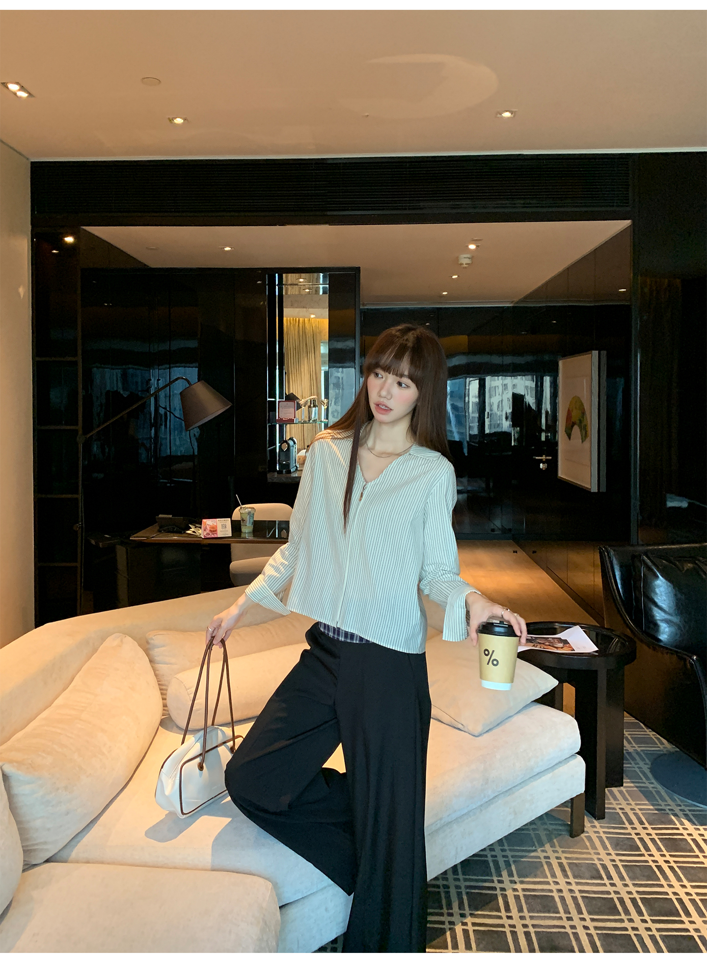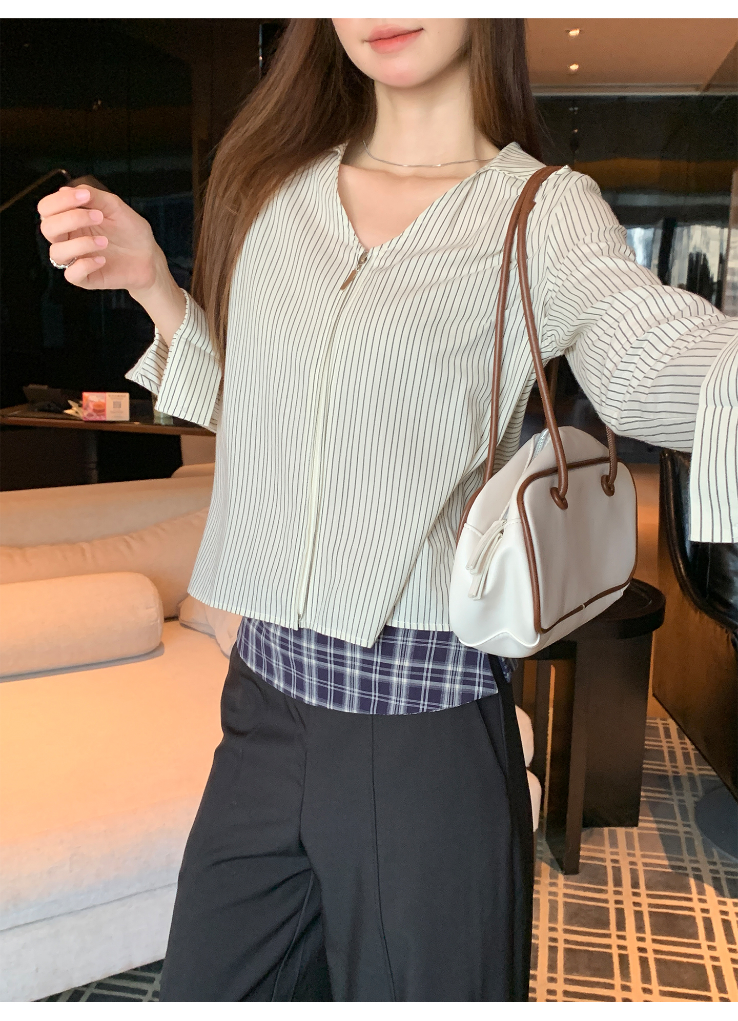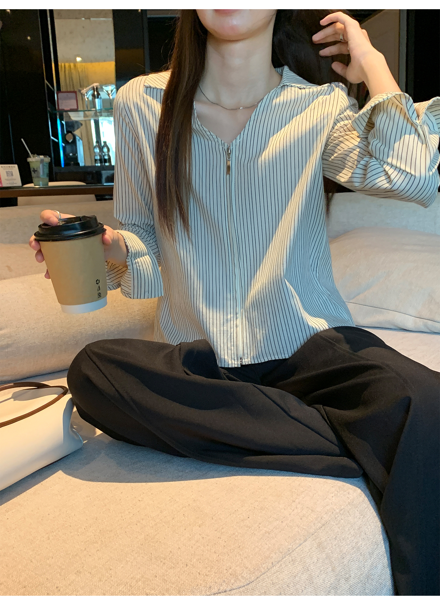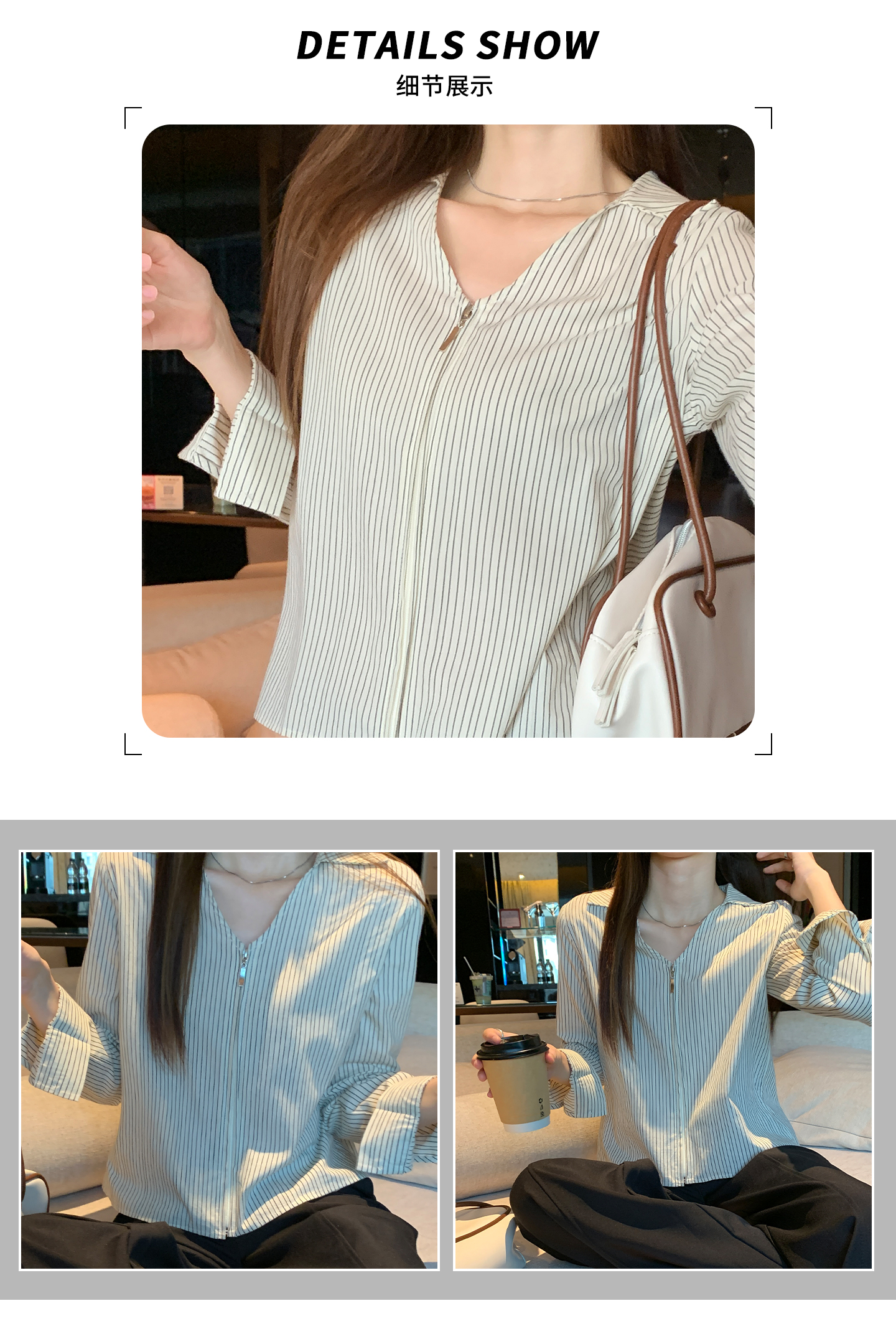 实拍实价#长袖衬衫女2025新款秋季竖条纹v领宽松显瘦法式小资上衣