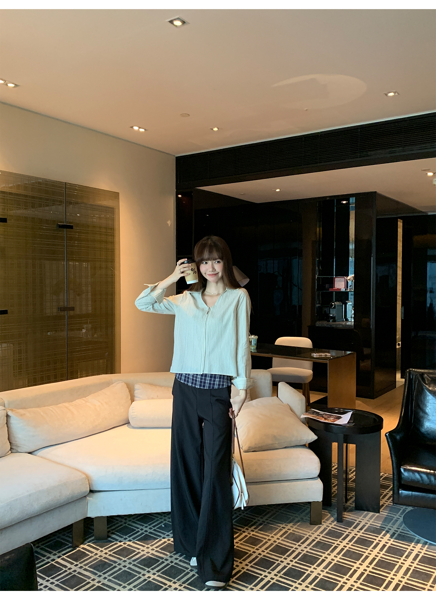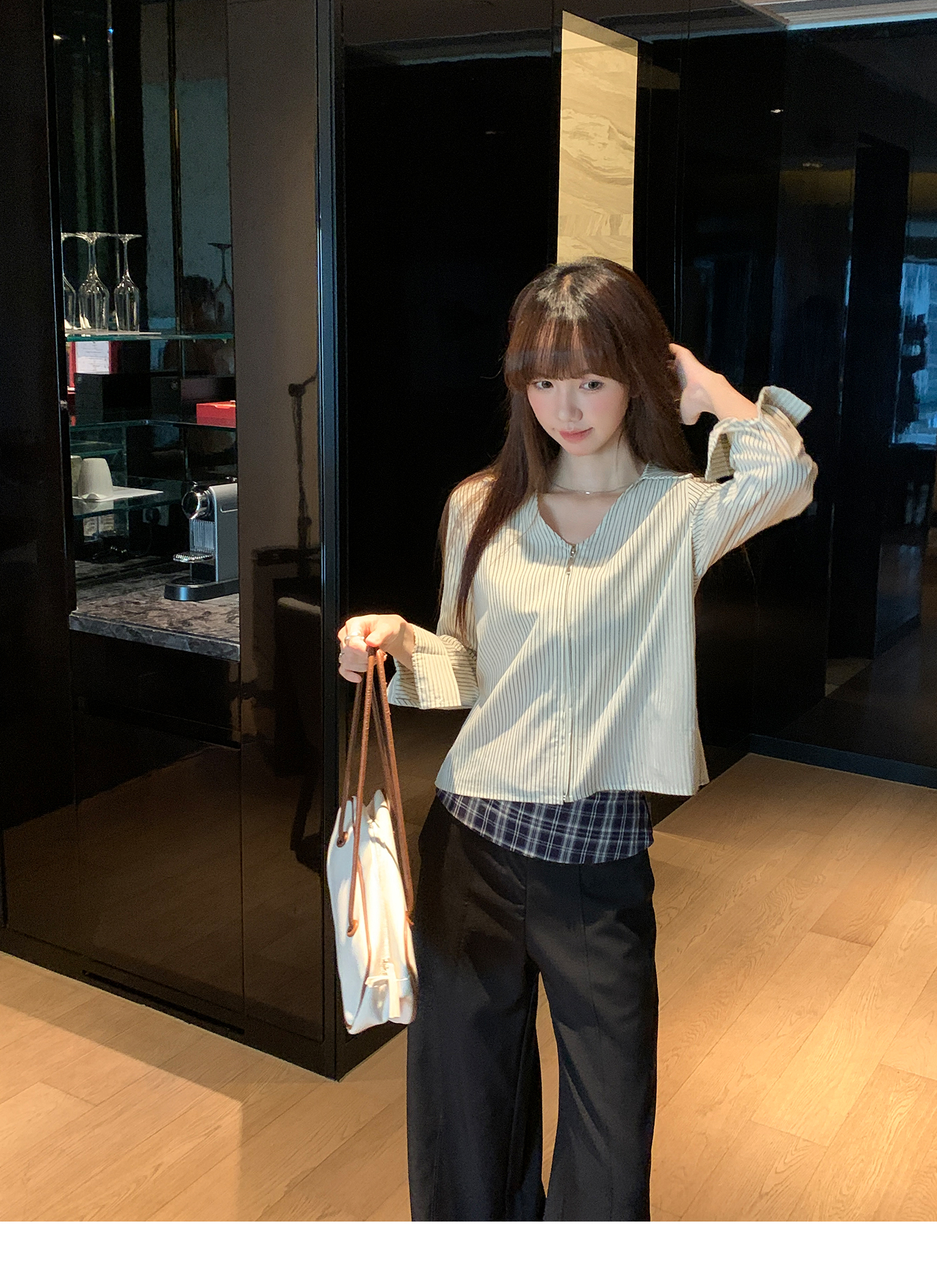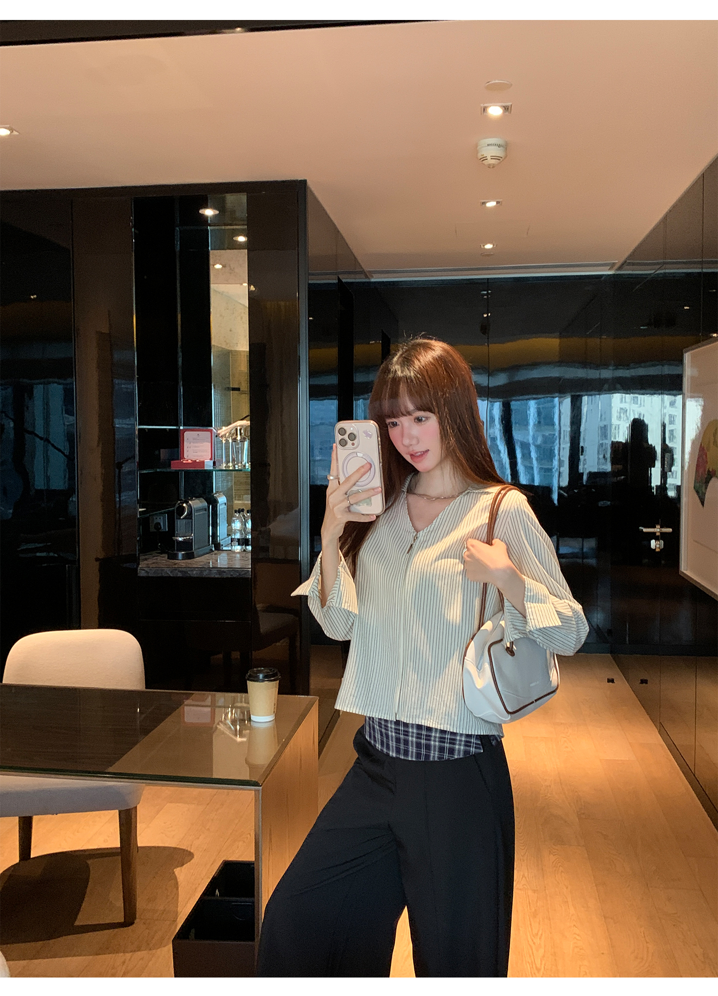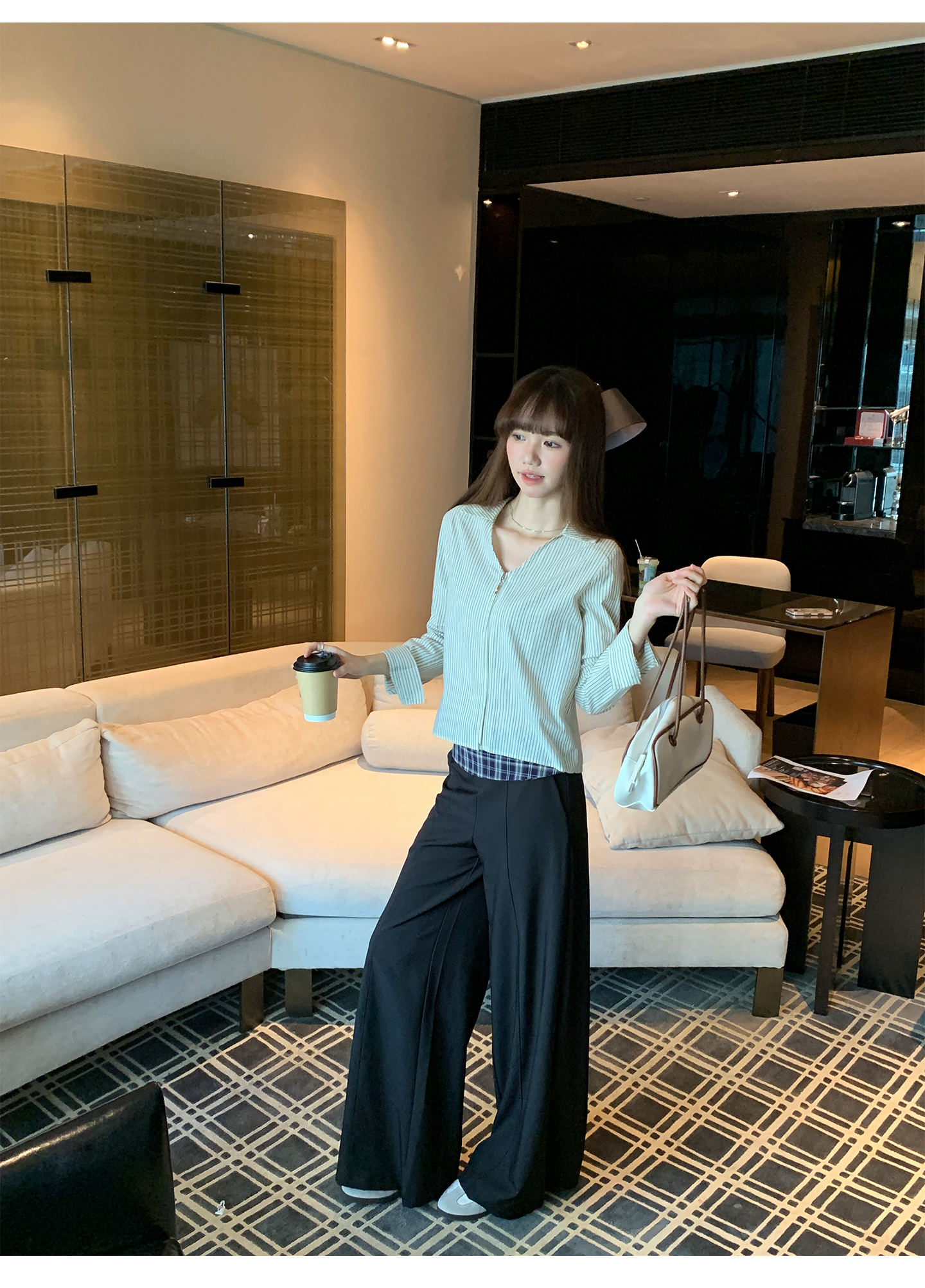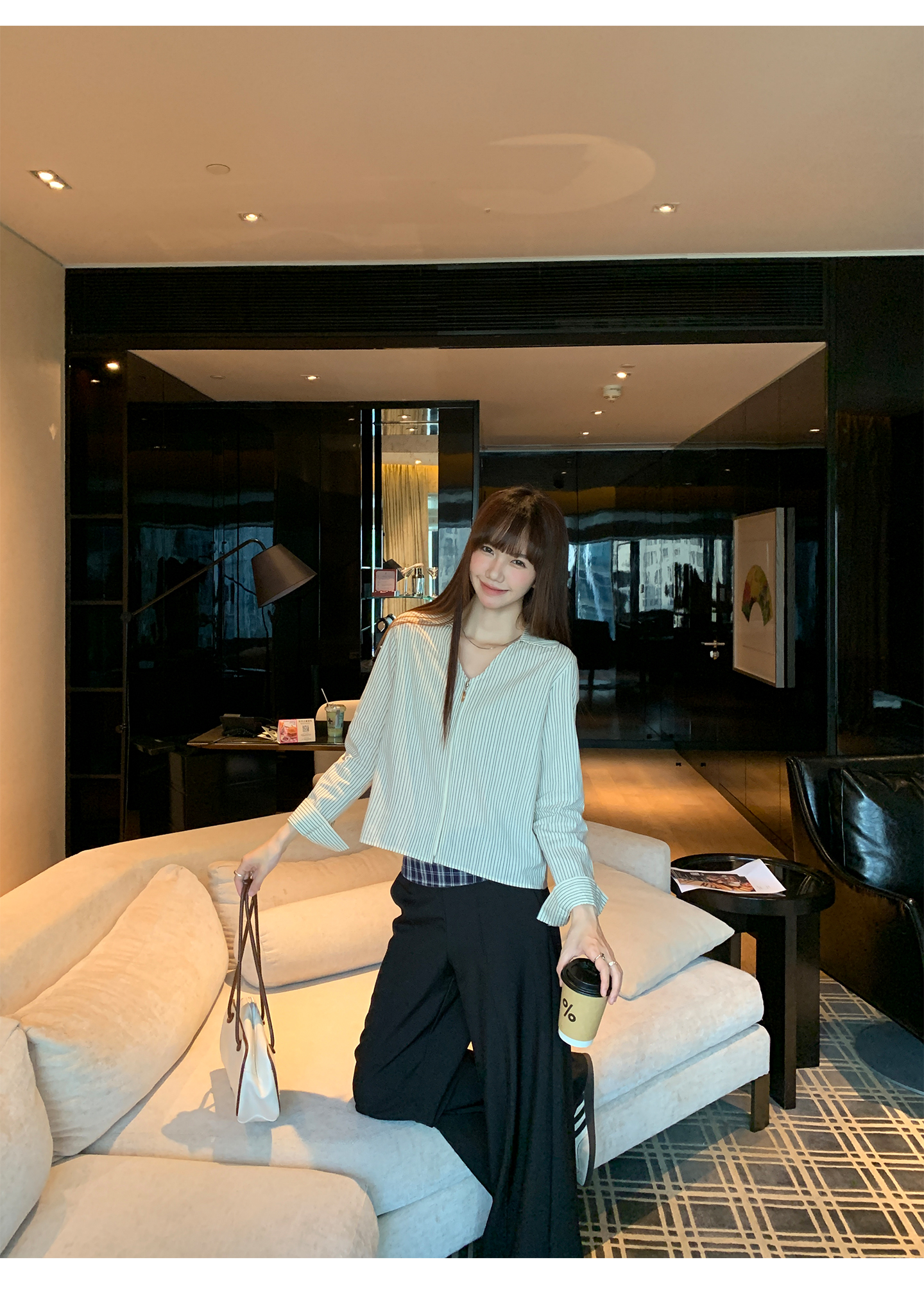 实拍实价#长袖衬衫女2025新款秋季竖条纹v领宽松显瘦法式小资上衣