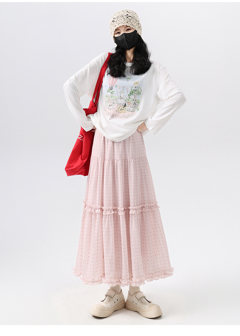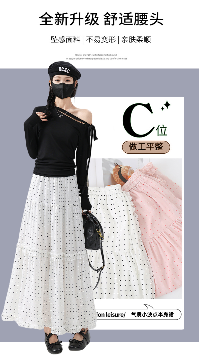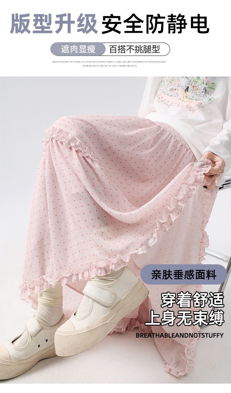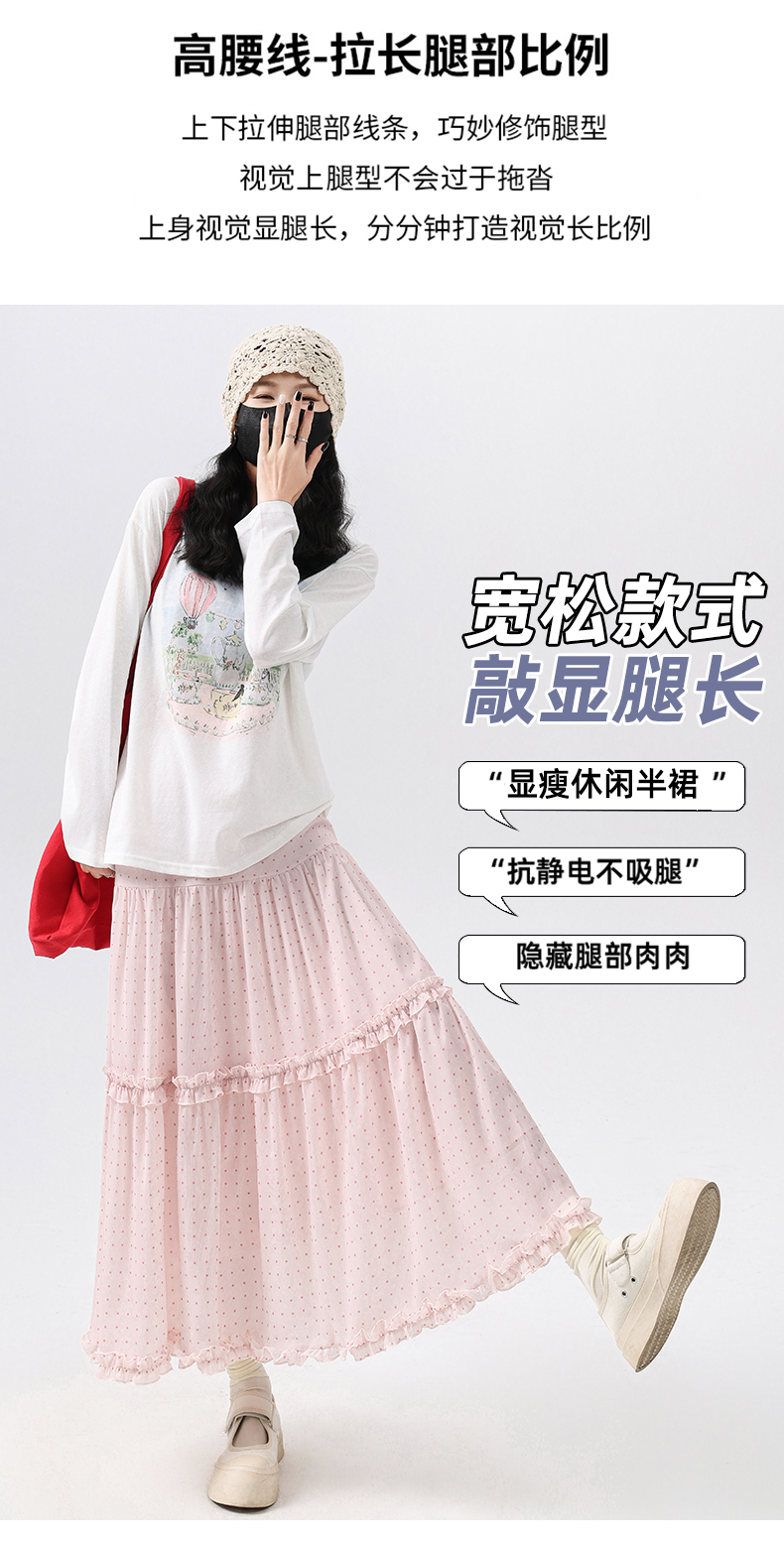 甜美少女粉色波点木耳花边半身裙女春款高腰A字蛋糕裙中长款伞裙