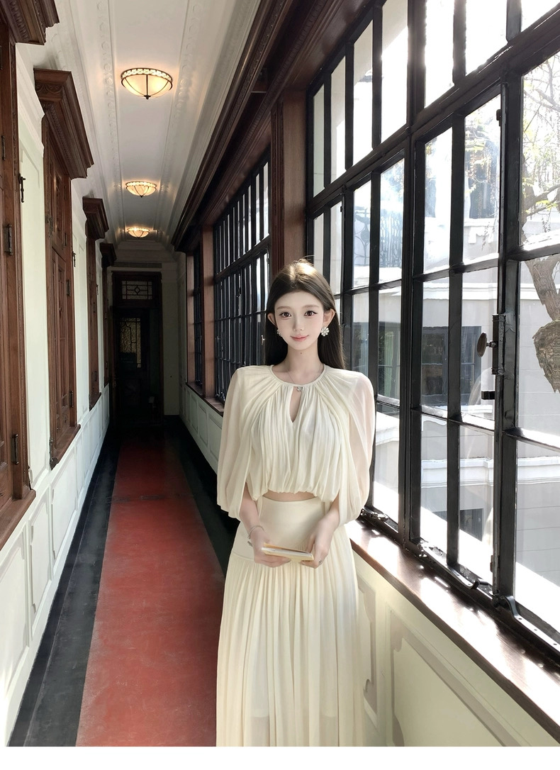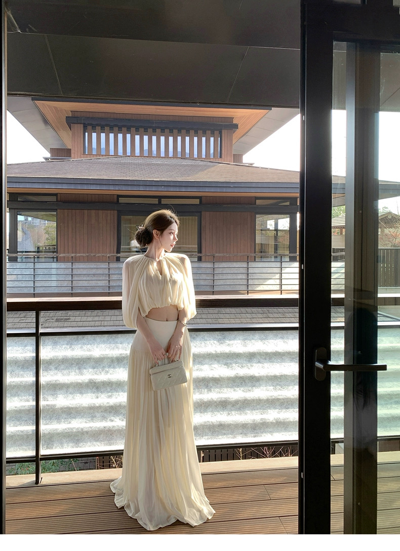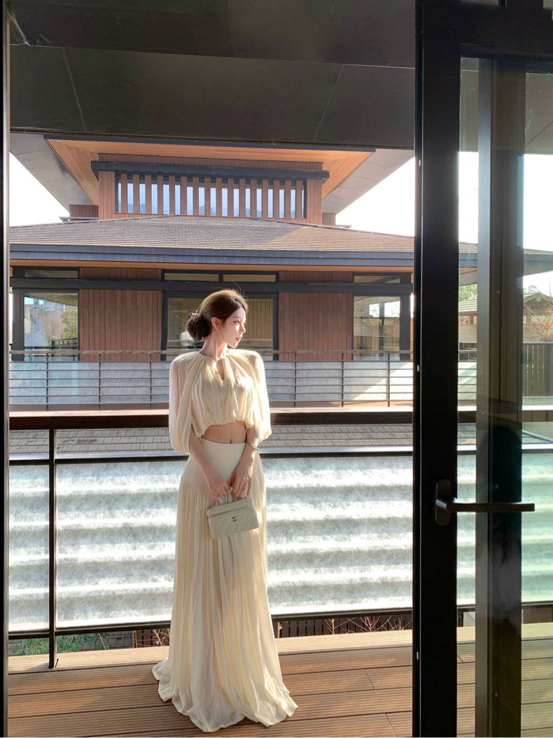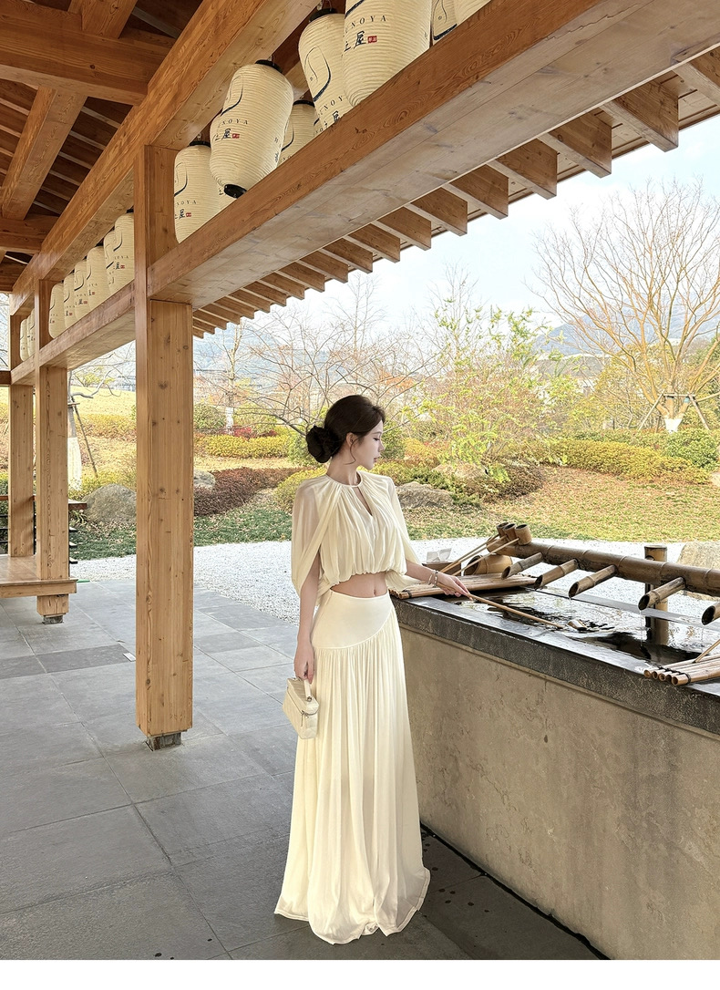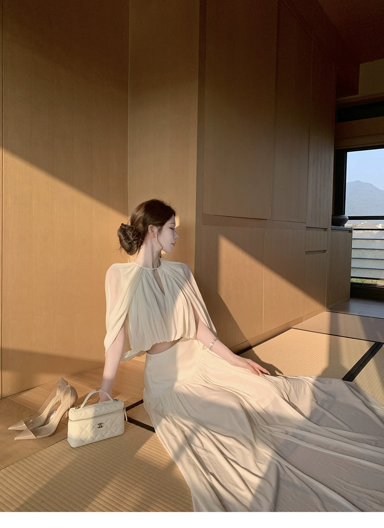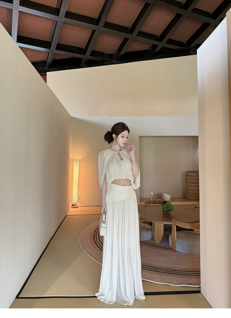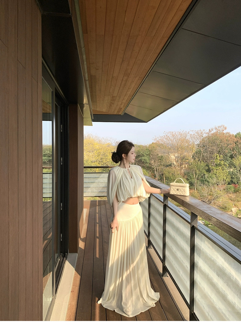 kubiliv心动缪斯设计感压褶斗篷无袖上衣高腰百褶伞裙两件套