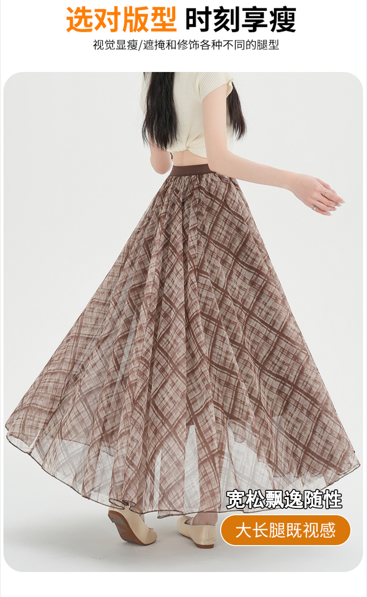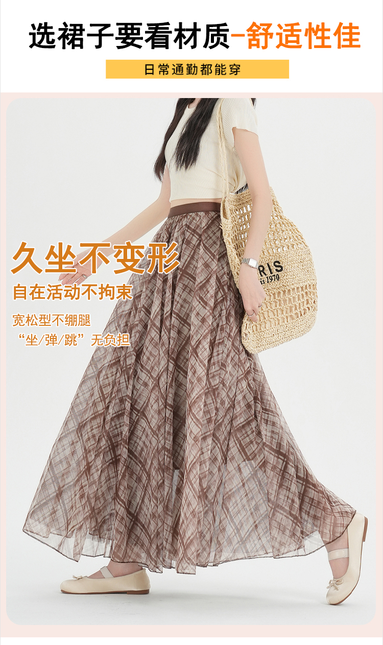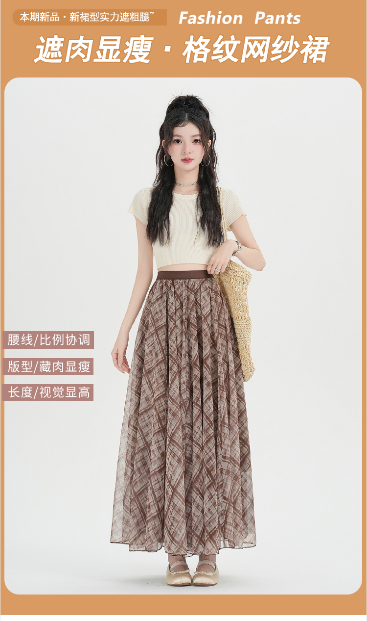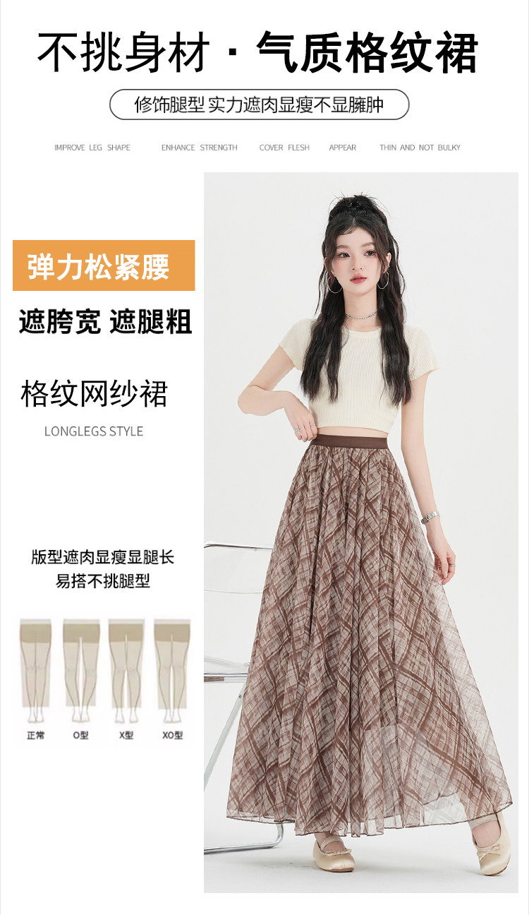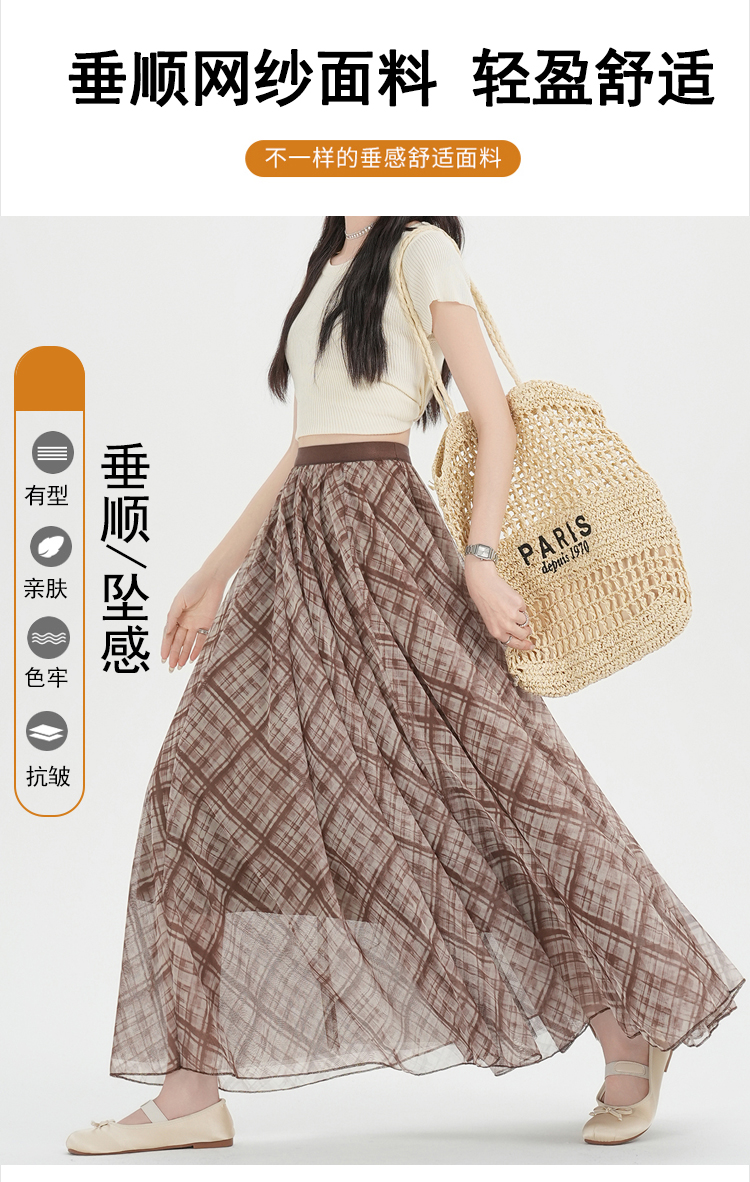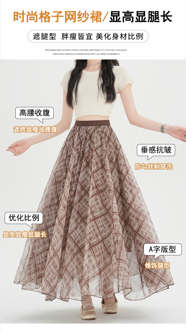 实拍 春款网纱格子半身裙女新款高腰气质显瘦a字垂感大摆伞裙长裙