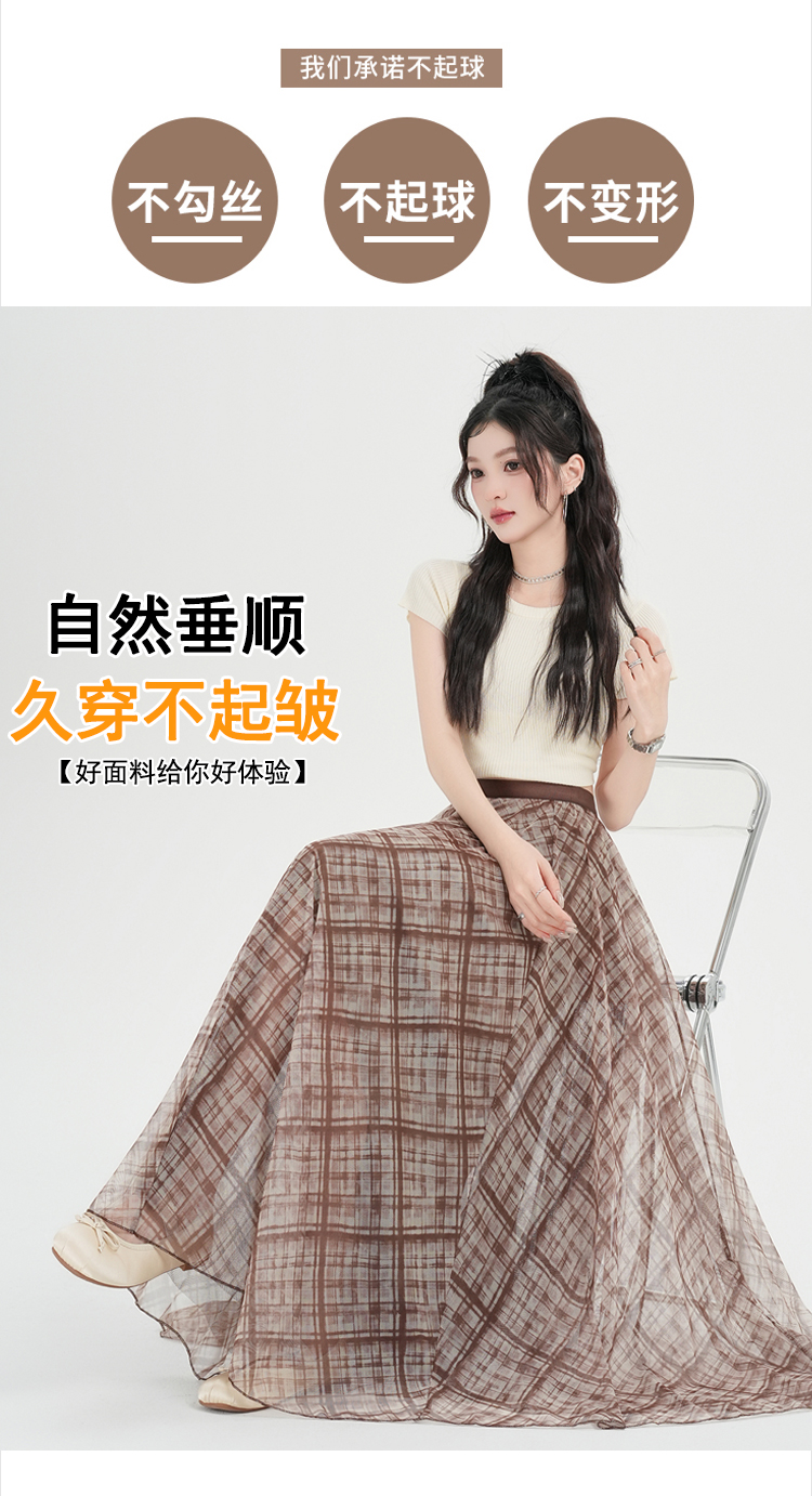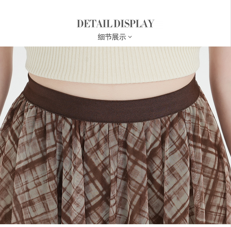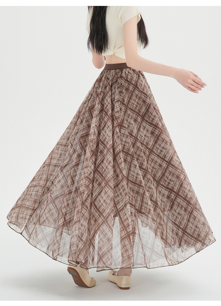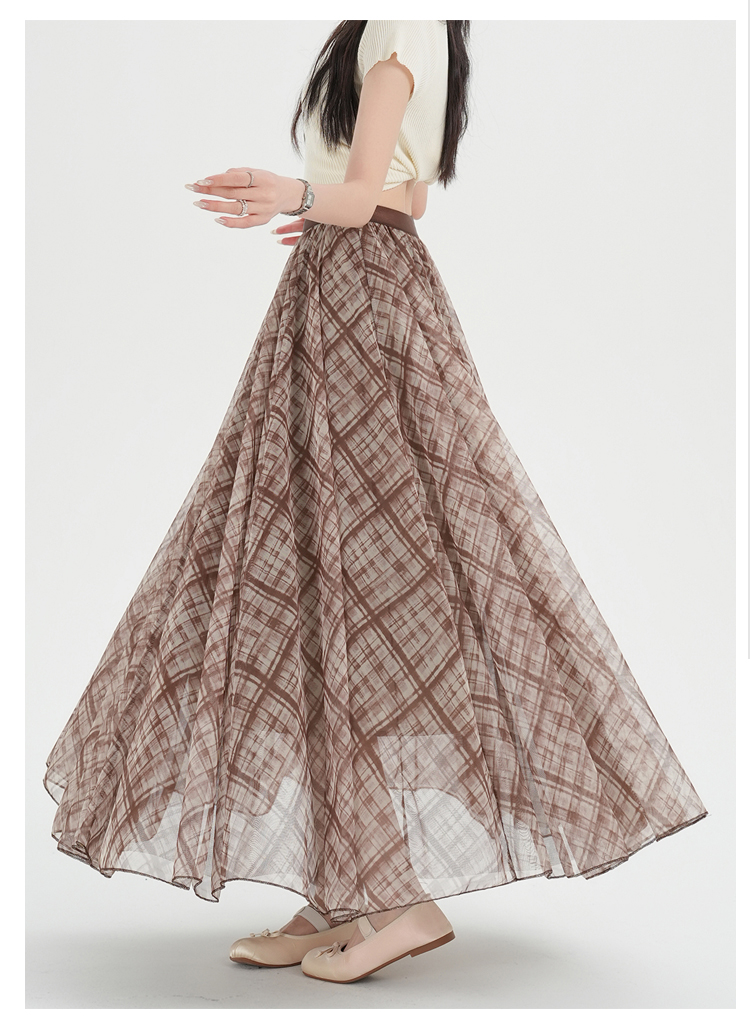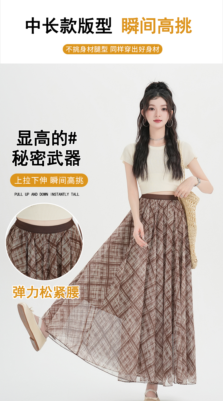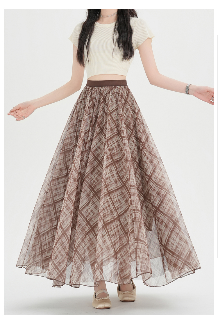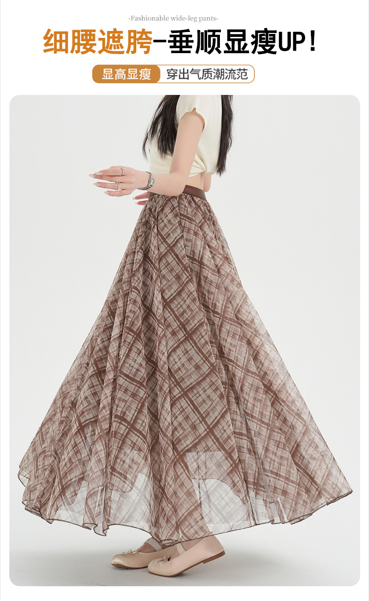 实拍 春款网纱格子半身裙女新款高腰气质显瘦a字垂感大摆伞裙长裙