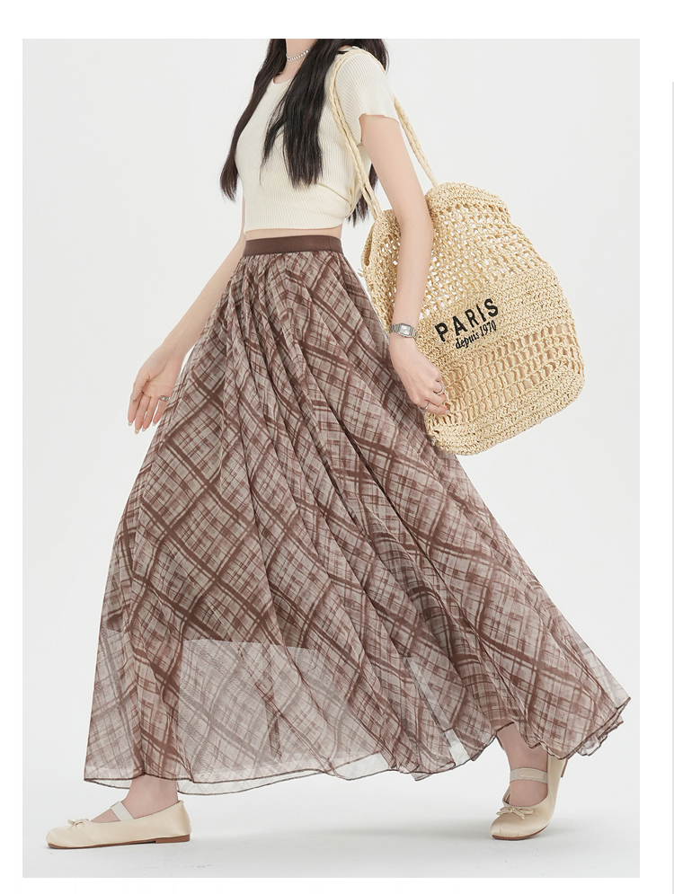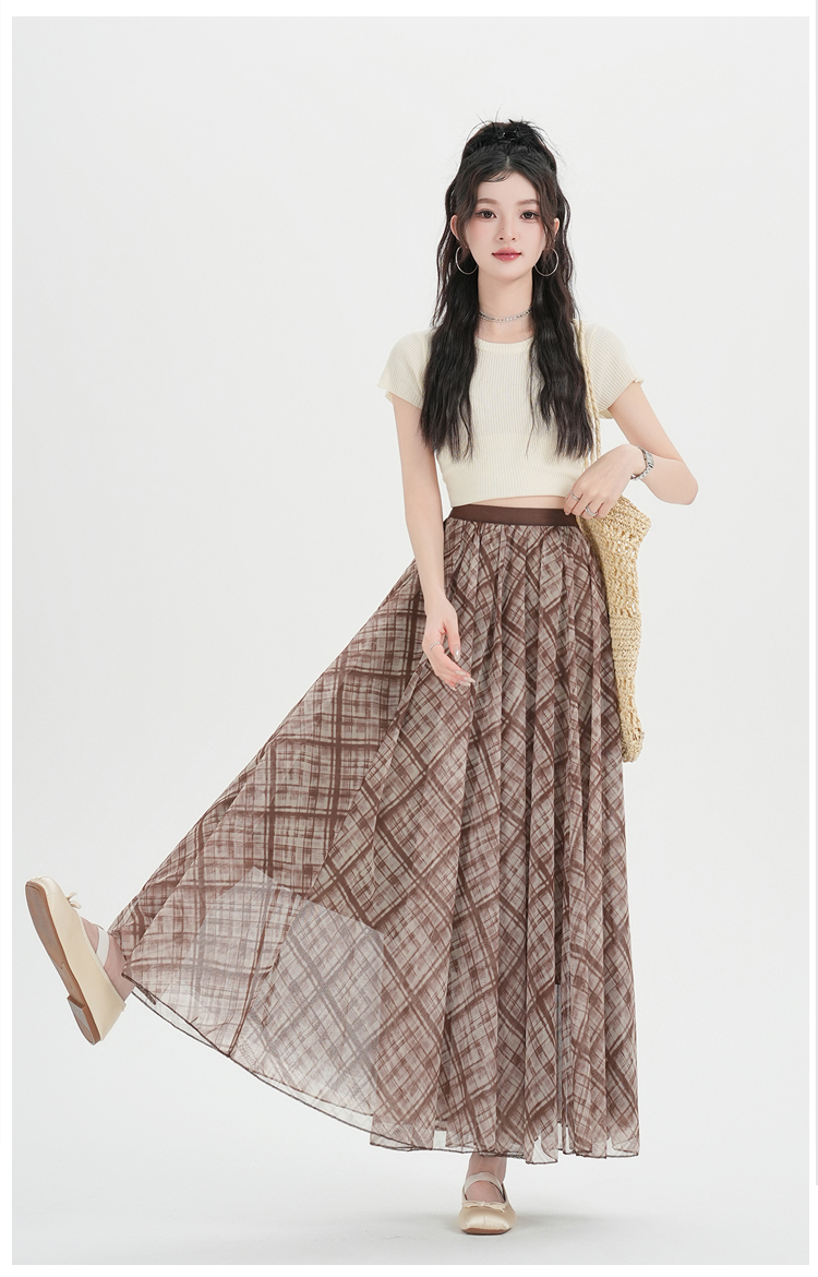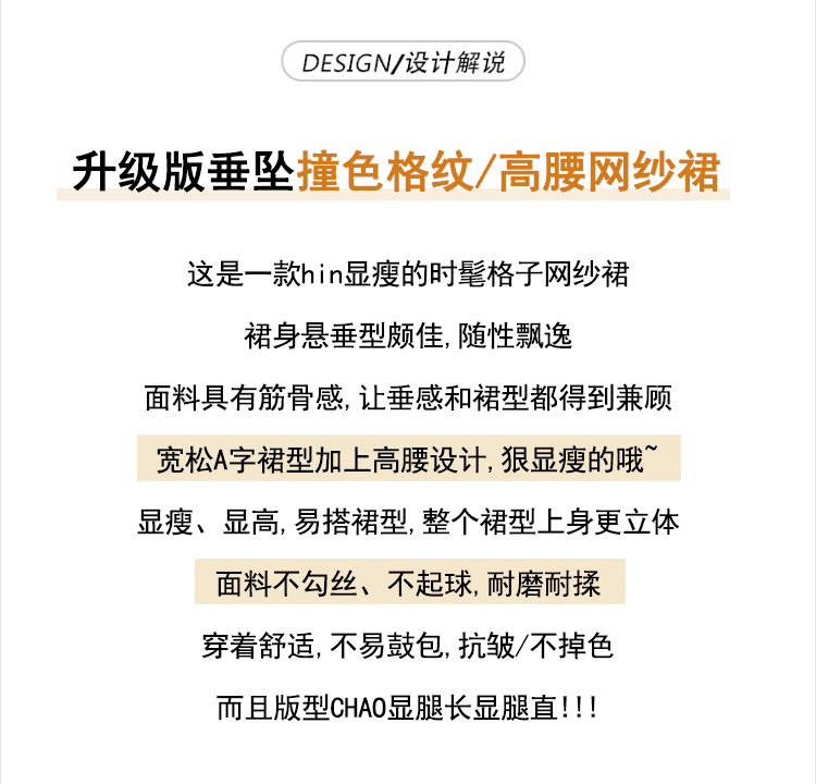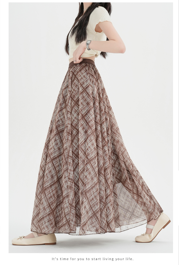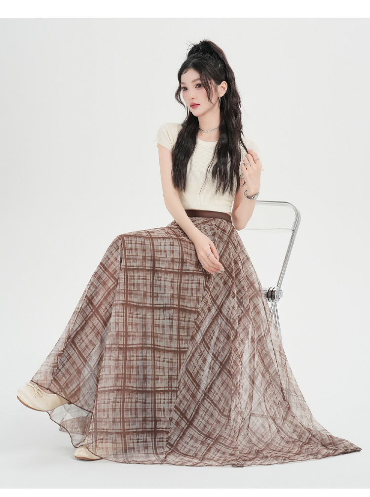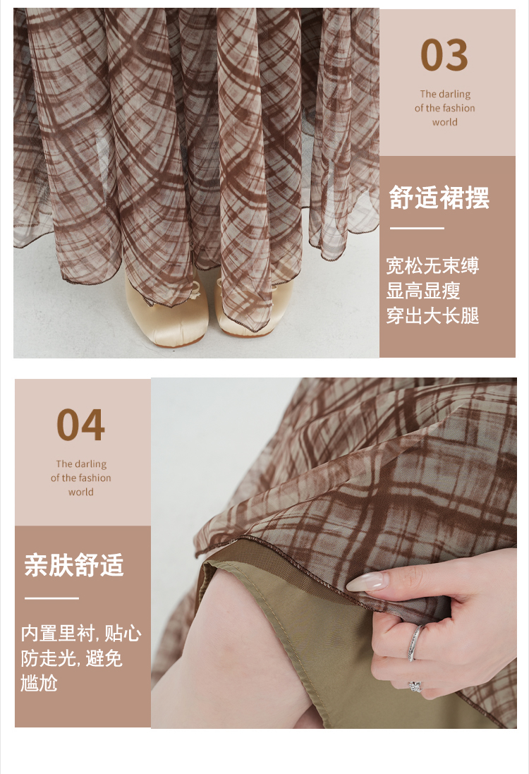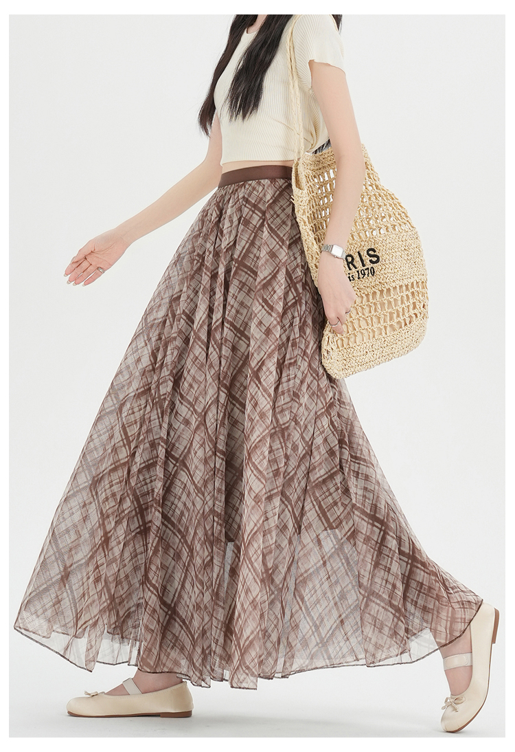 实拍 春款网纱格子半身裙女新款高腰气质显瘦a字垂感大摆伞裙长裙