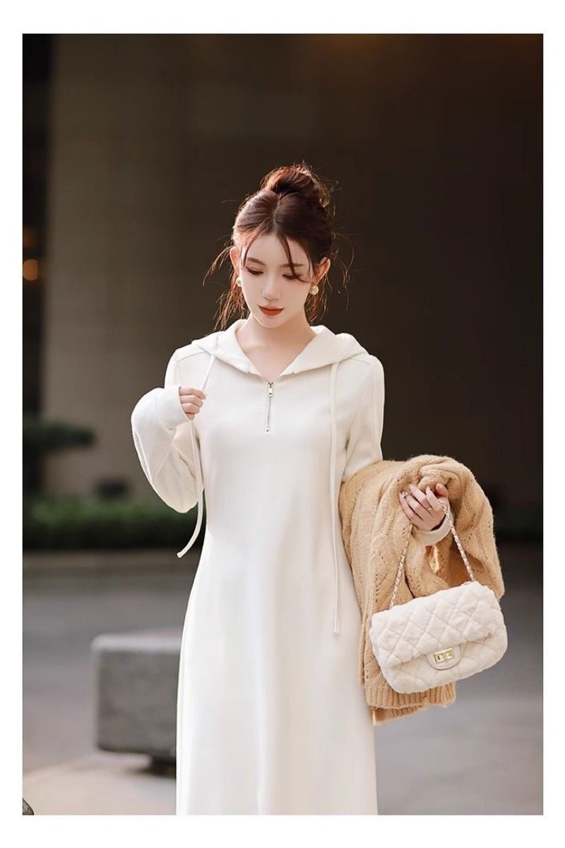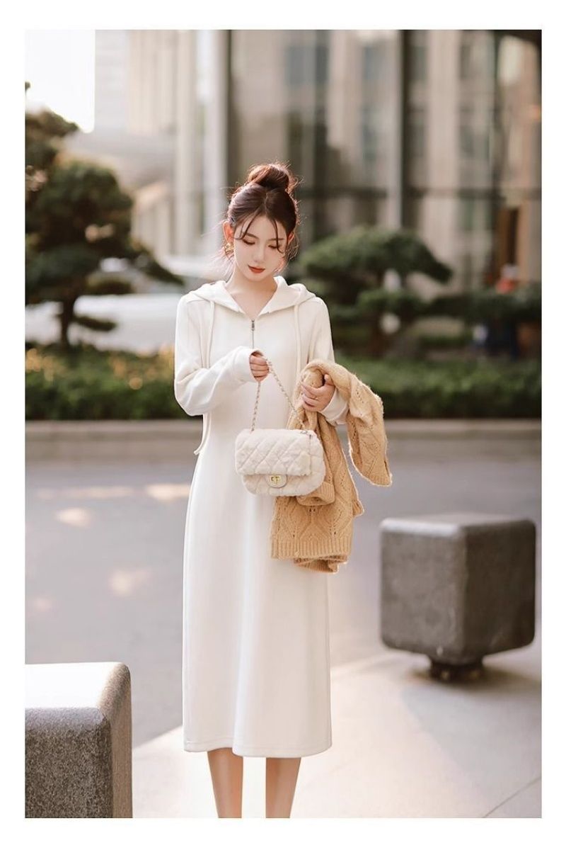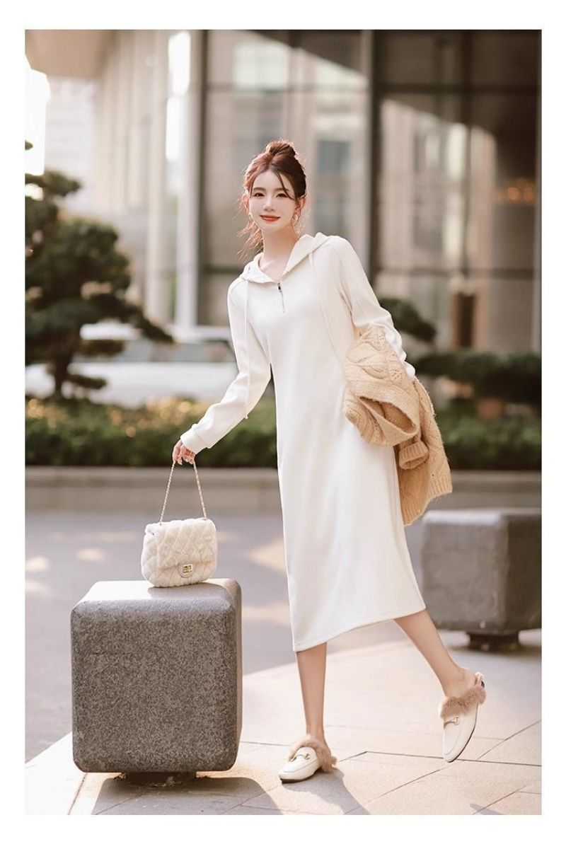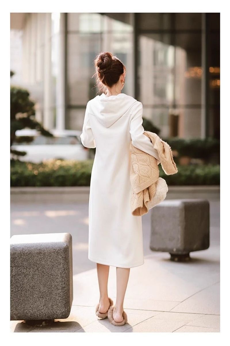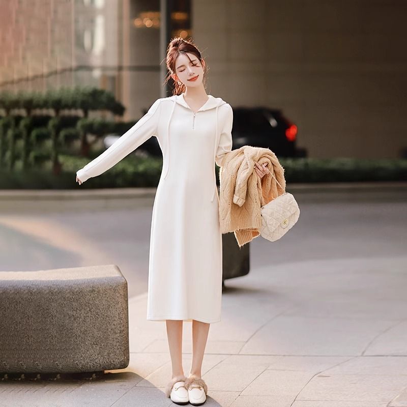 出大货 连帽连衣裙女秋冬季新款MM收腰显瘦遮肚休闲过膝卫衣裙