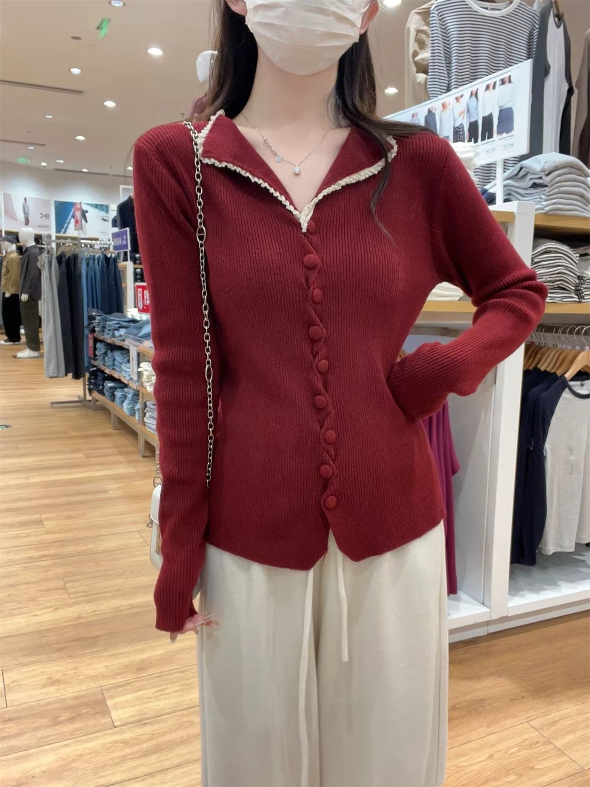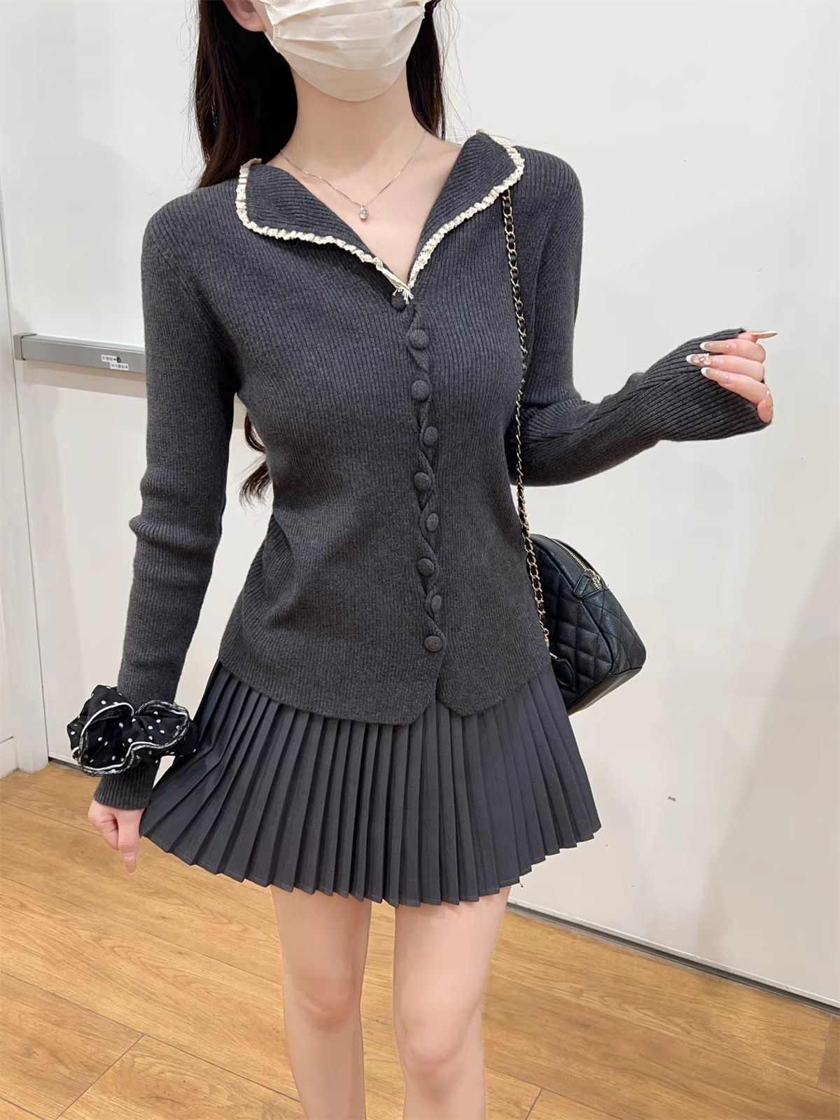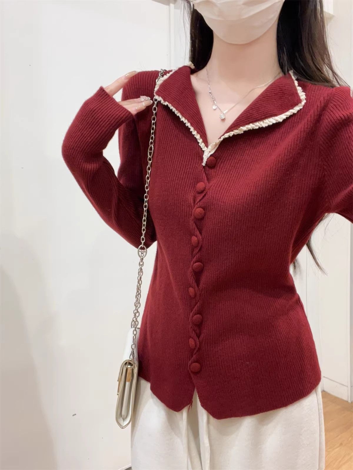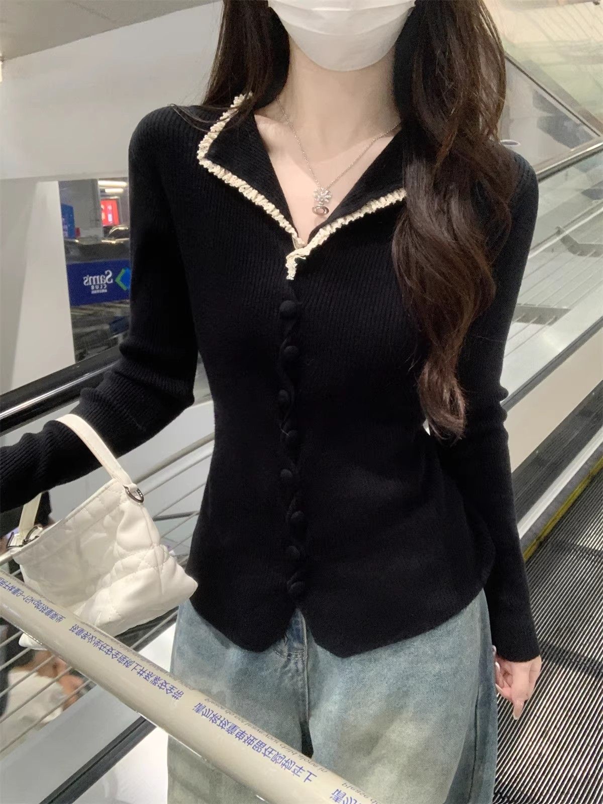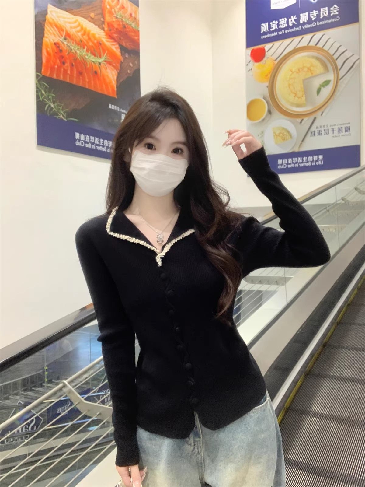 已出货 木耳边翻领纽扣长袖针织衫上衣女秋冬打底修身内搭毛衣