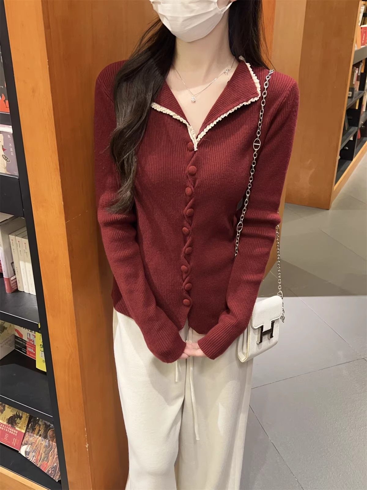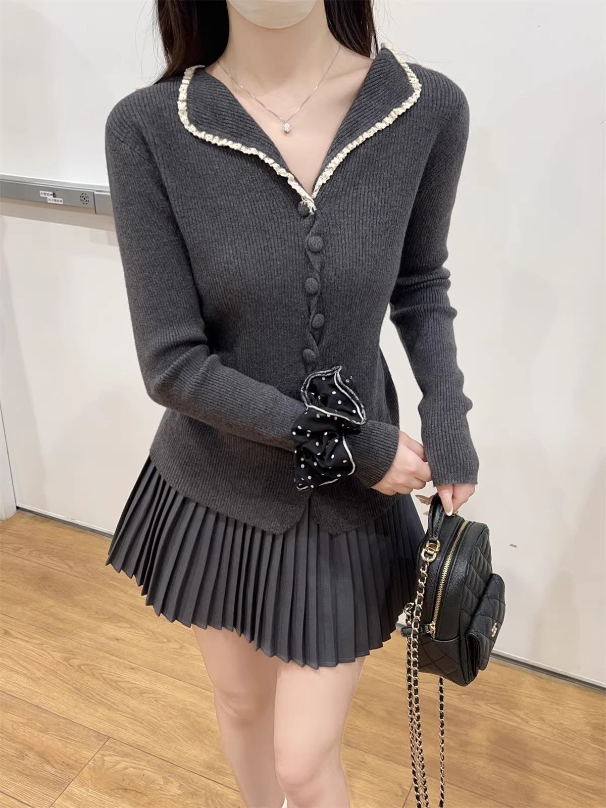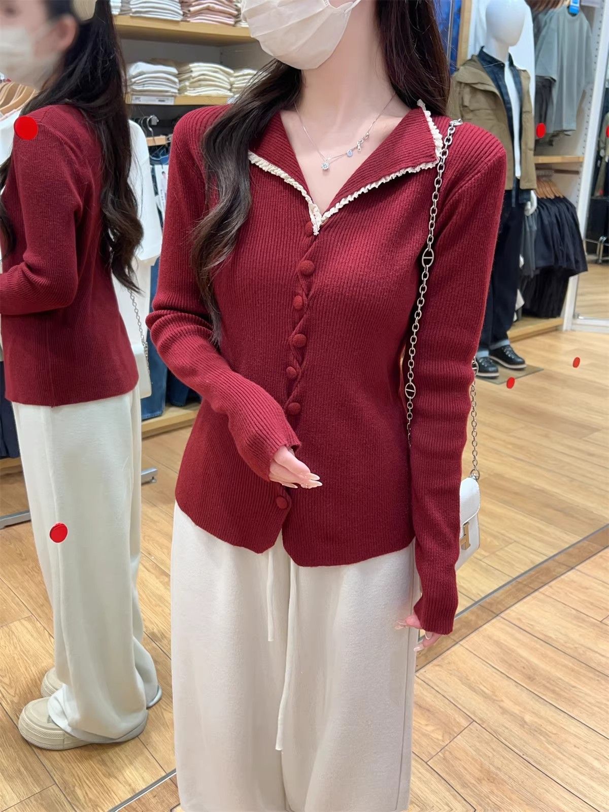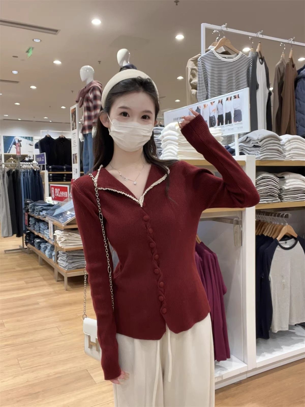 已出货 木耳边翻领纽扣长袖针织衫上衣女秋冬打底修身内搭毛衣