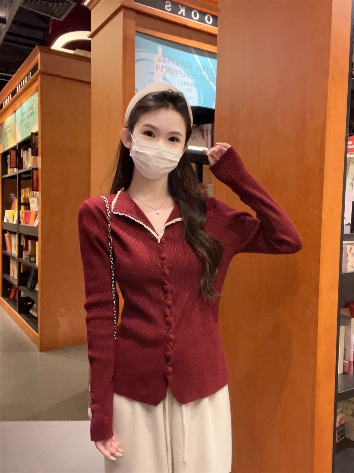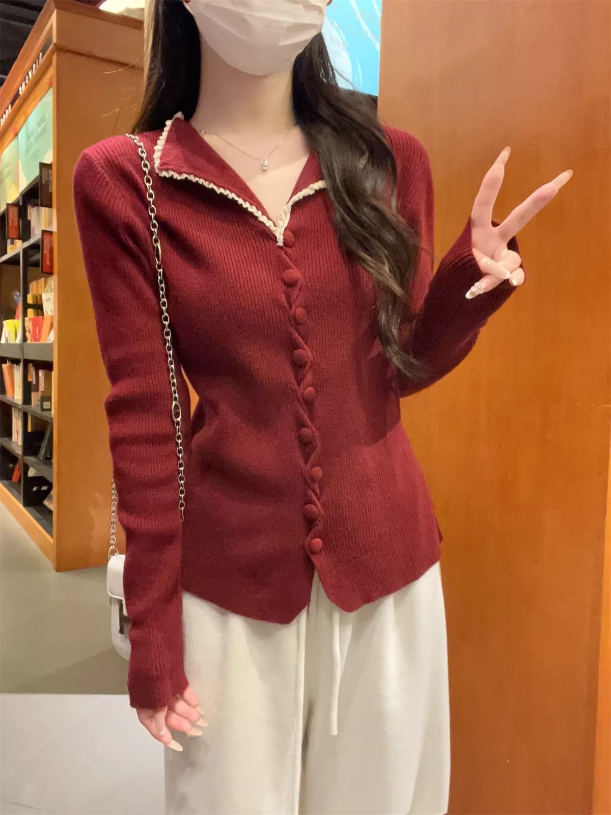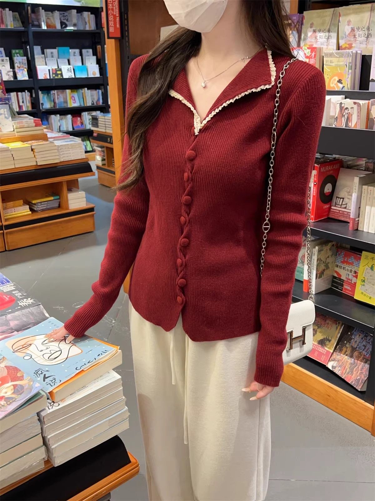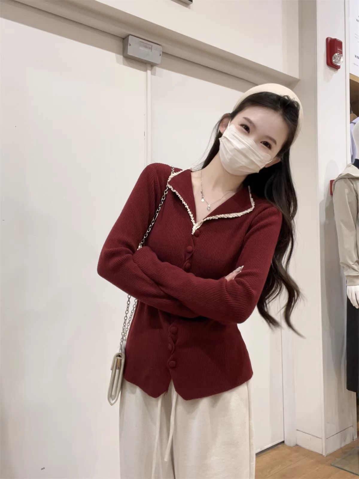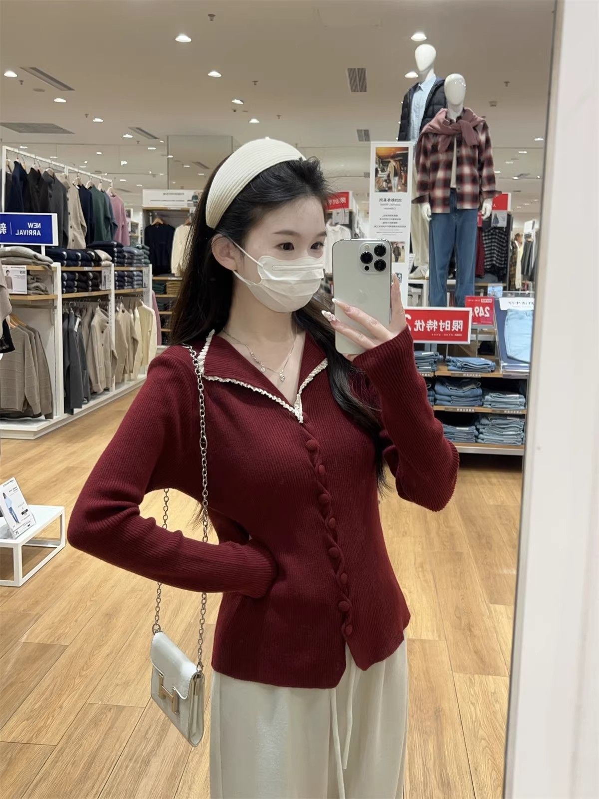 已出货 木耳边翻领纽扣长袖针织衫上衣女秋冬打底修身内搭毛衣