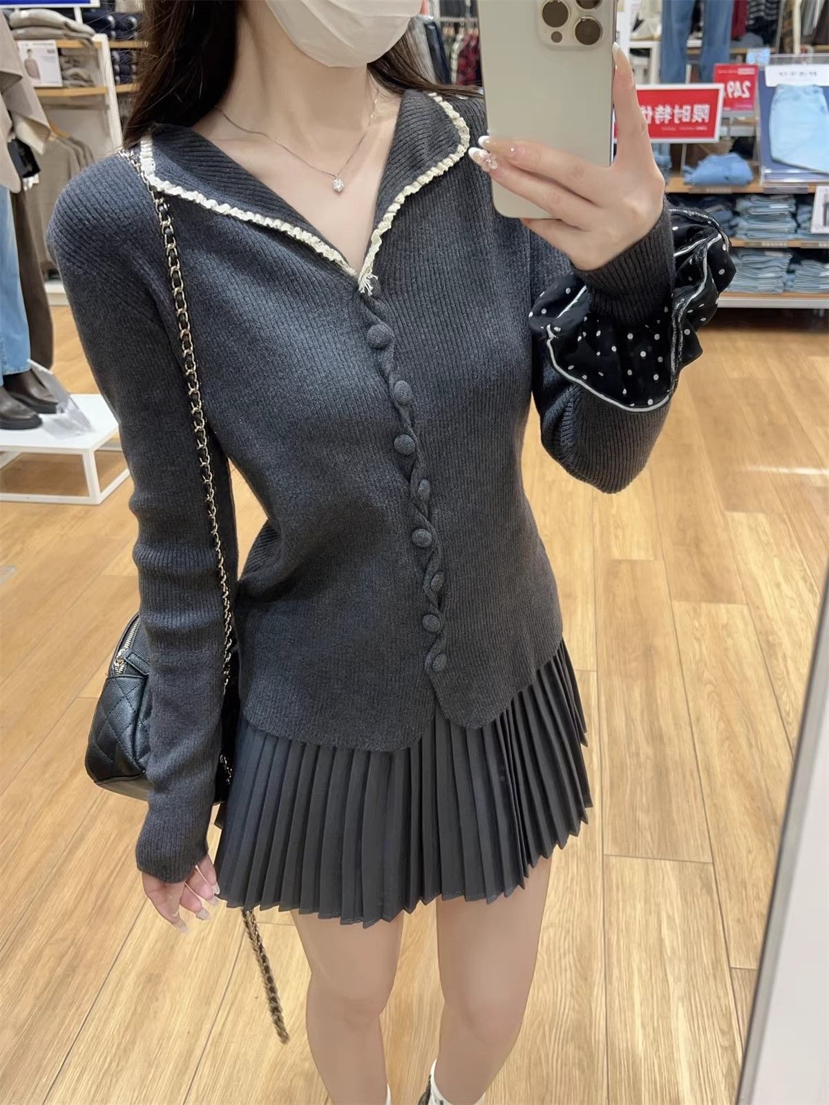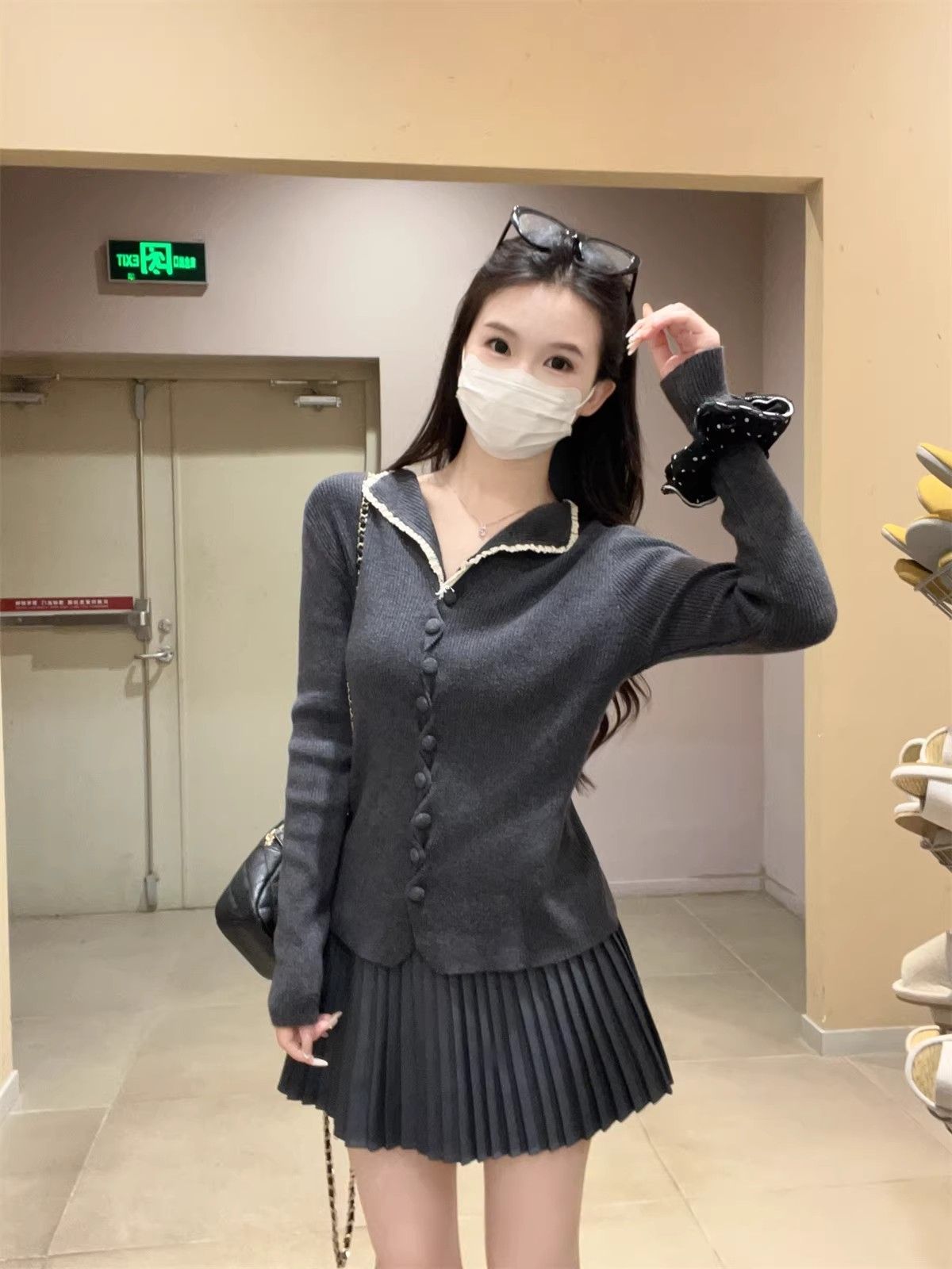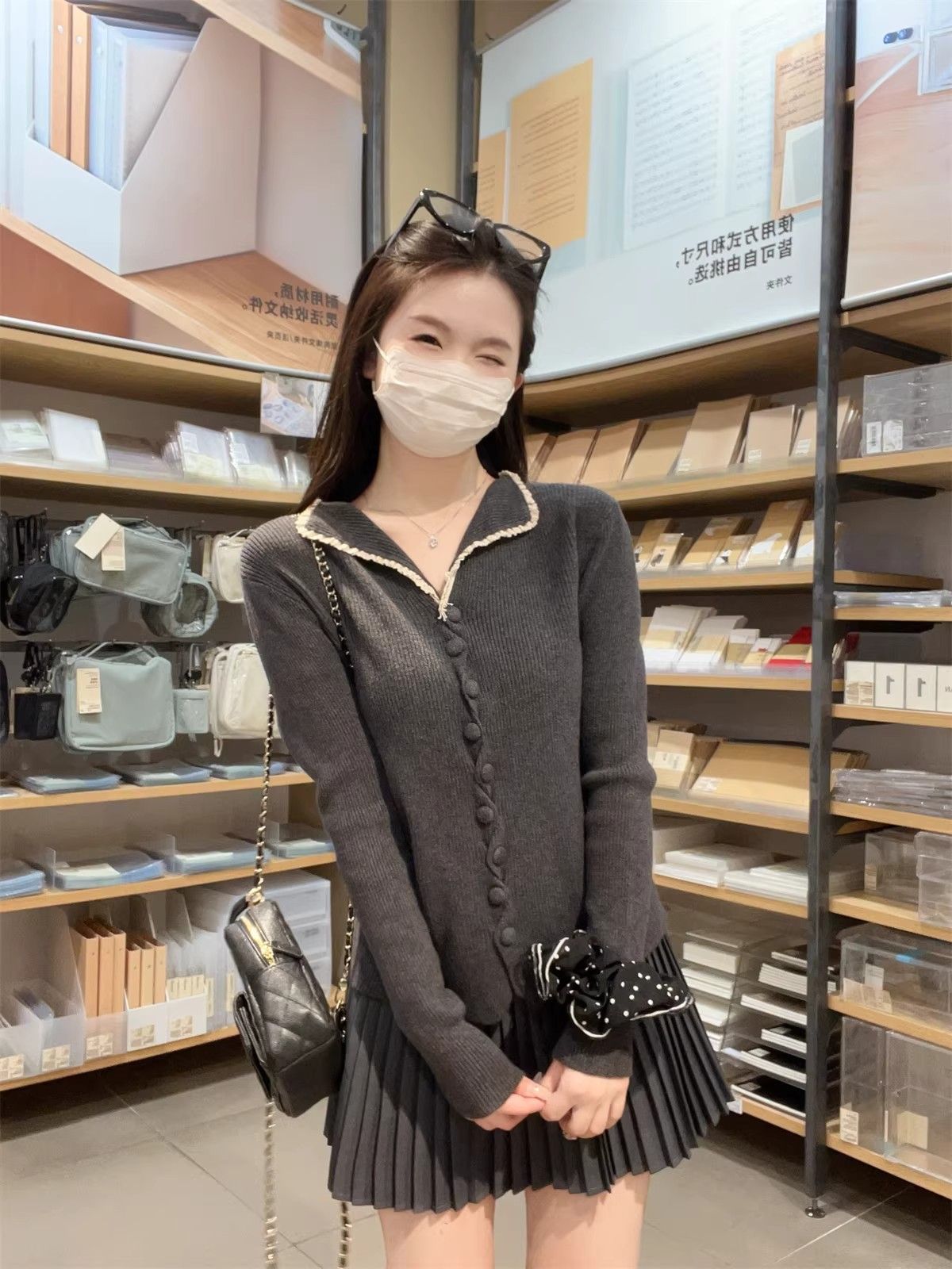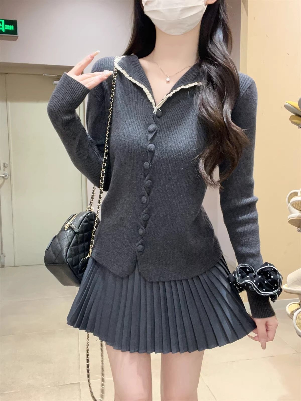 已出货 木耳边翻领纽扣长袖针织衫上衣女秋冬打底修身内搭毛衣