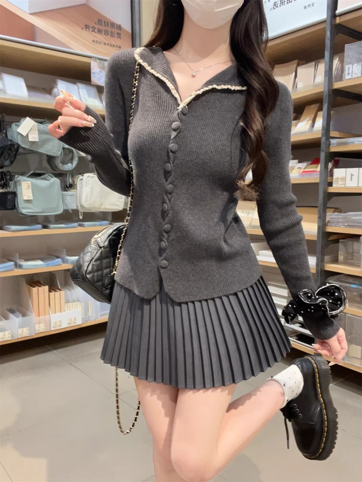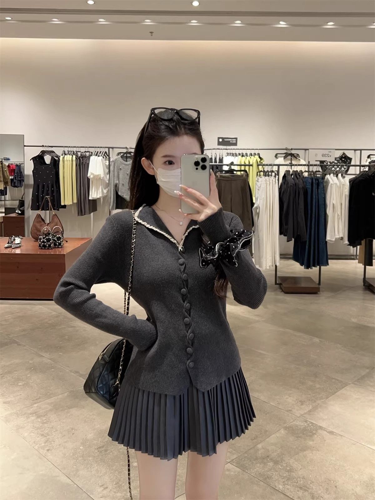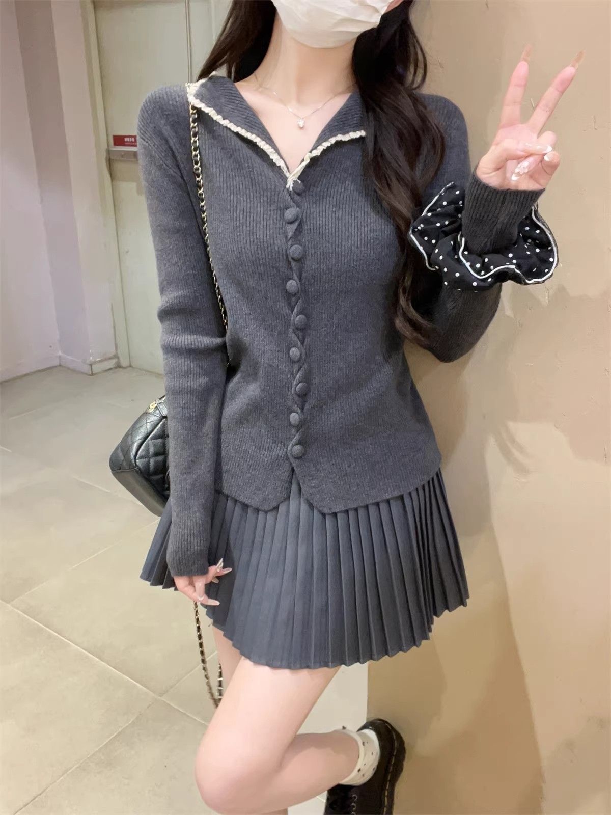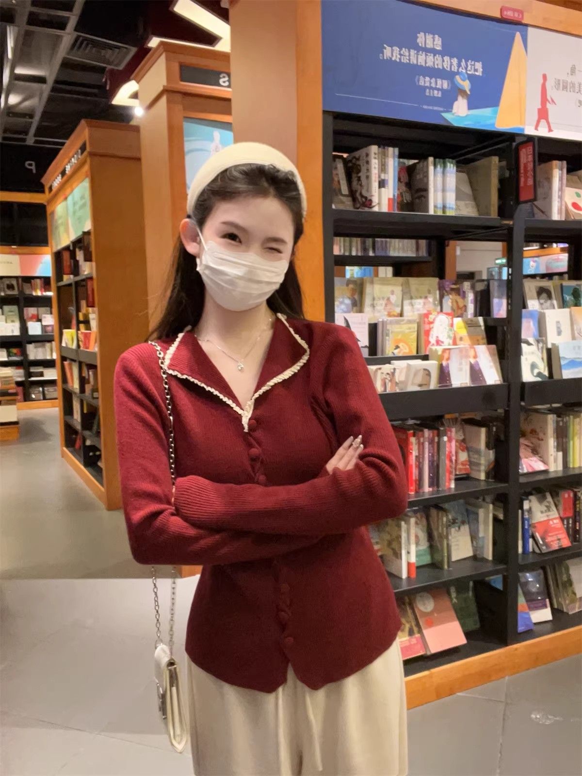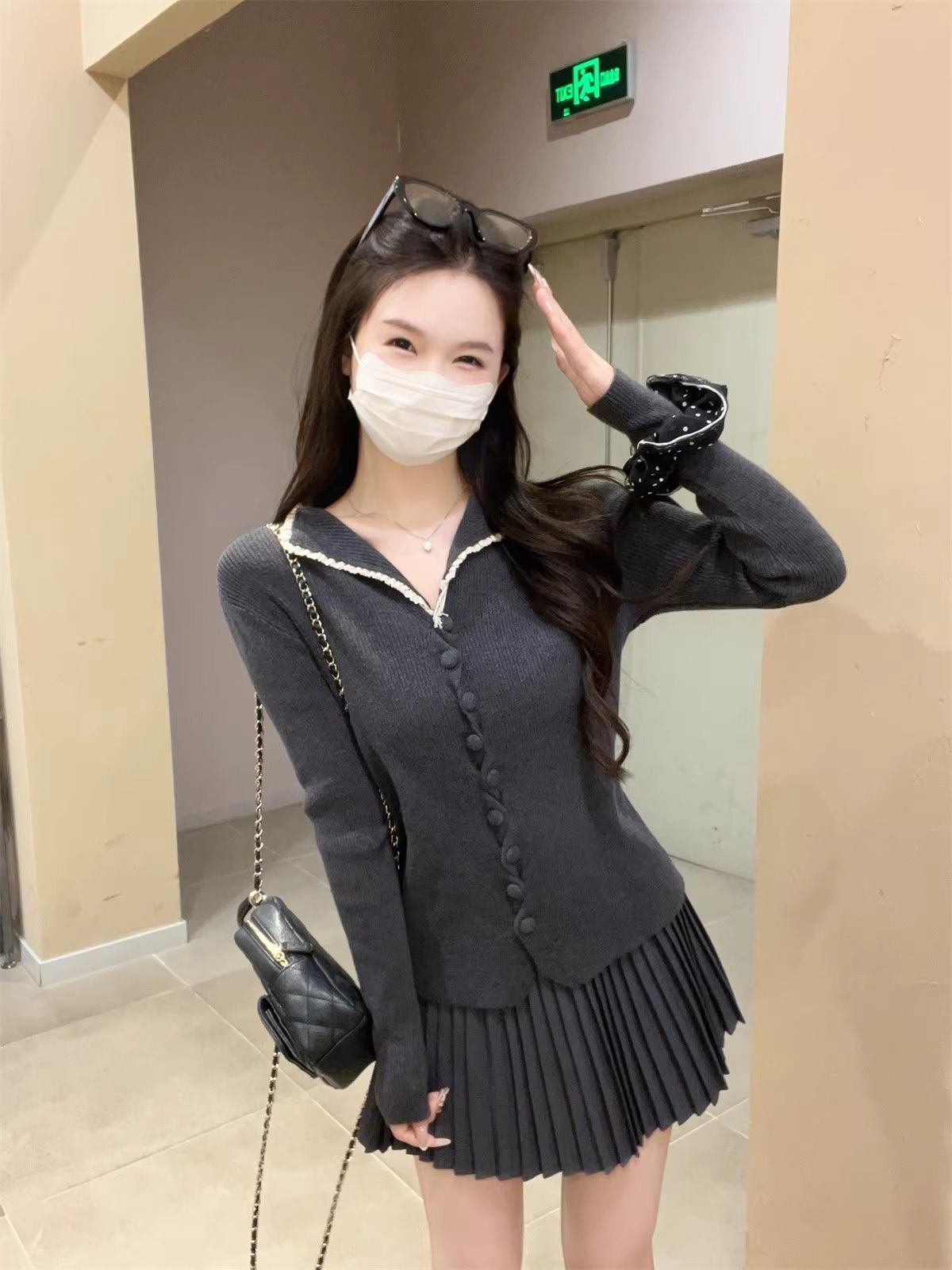 已出货 木耳边翻领纽扣长袖针织衫上衣女秋冬打底修身内搭毛衣