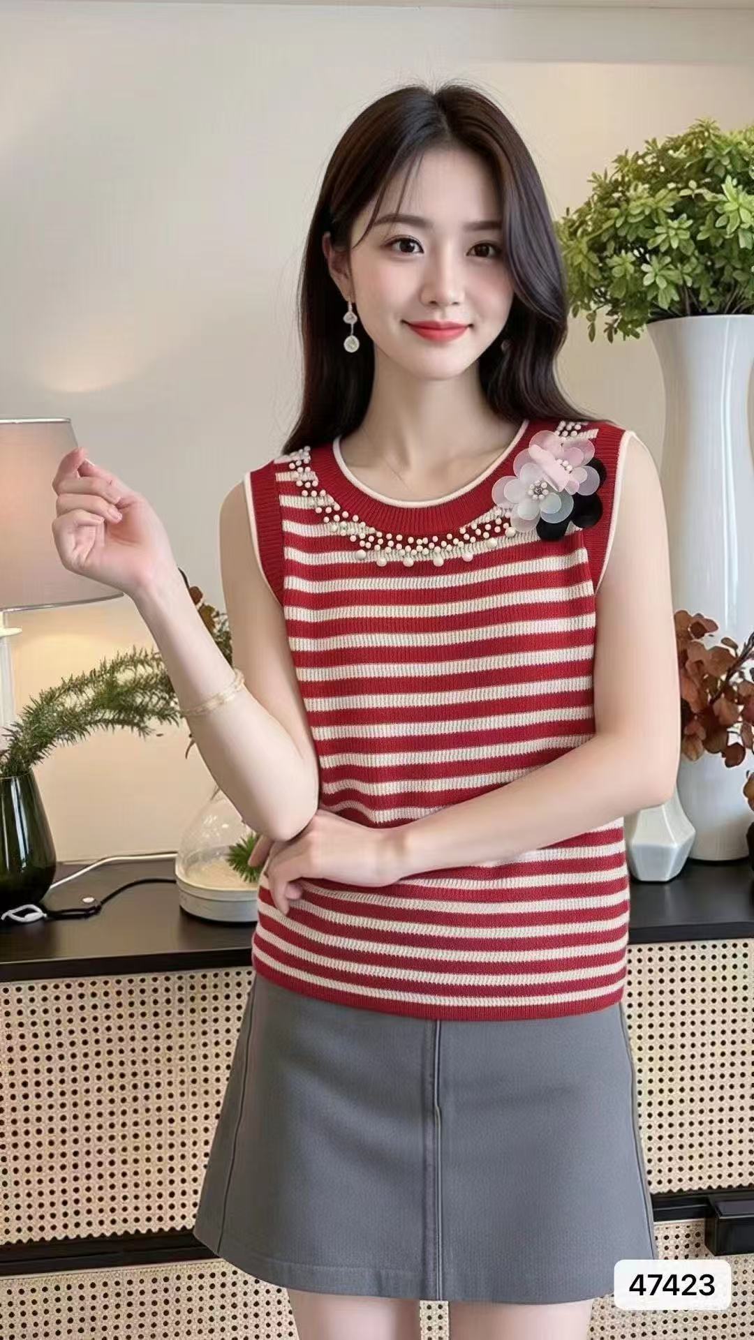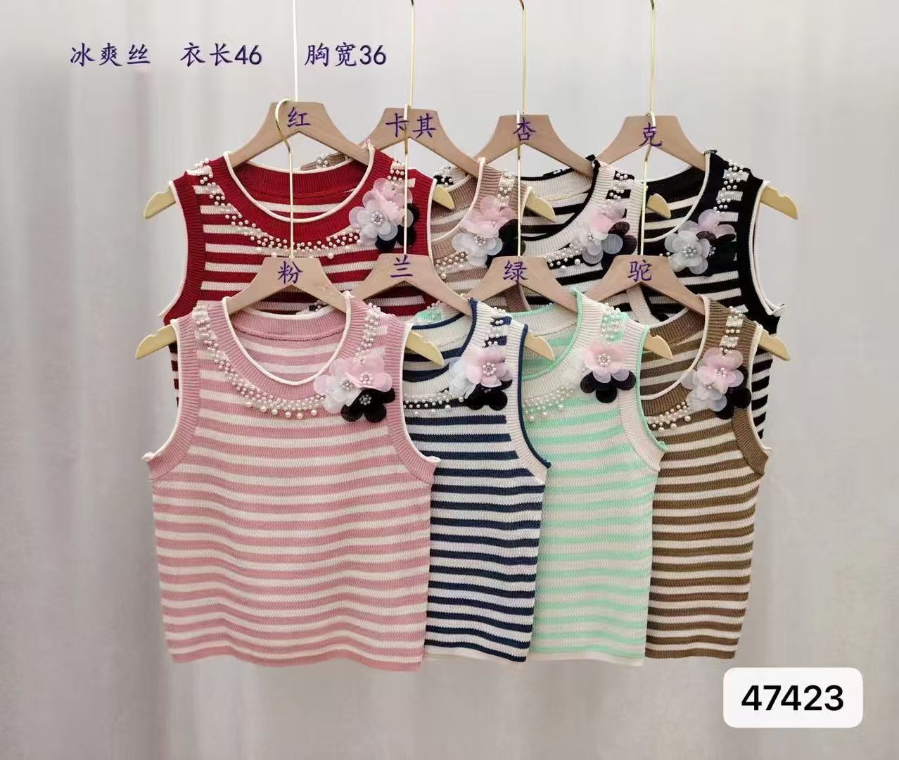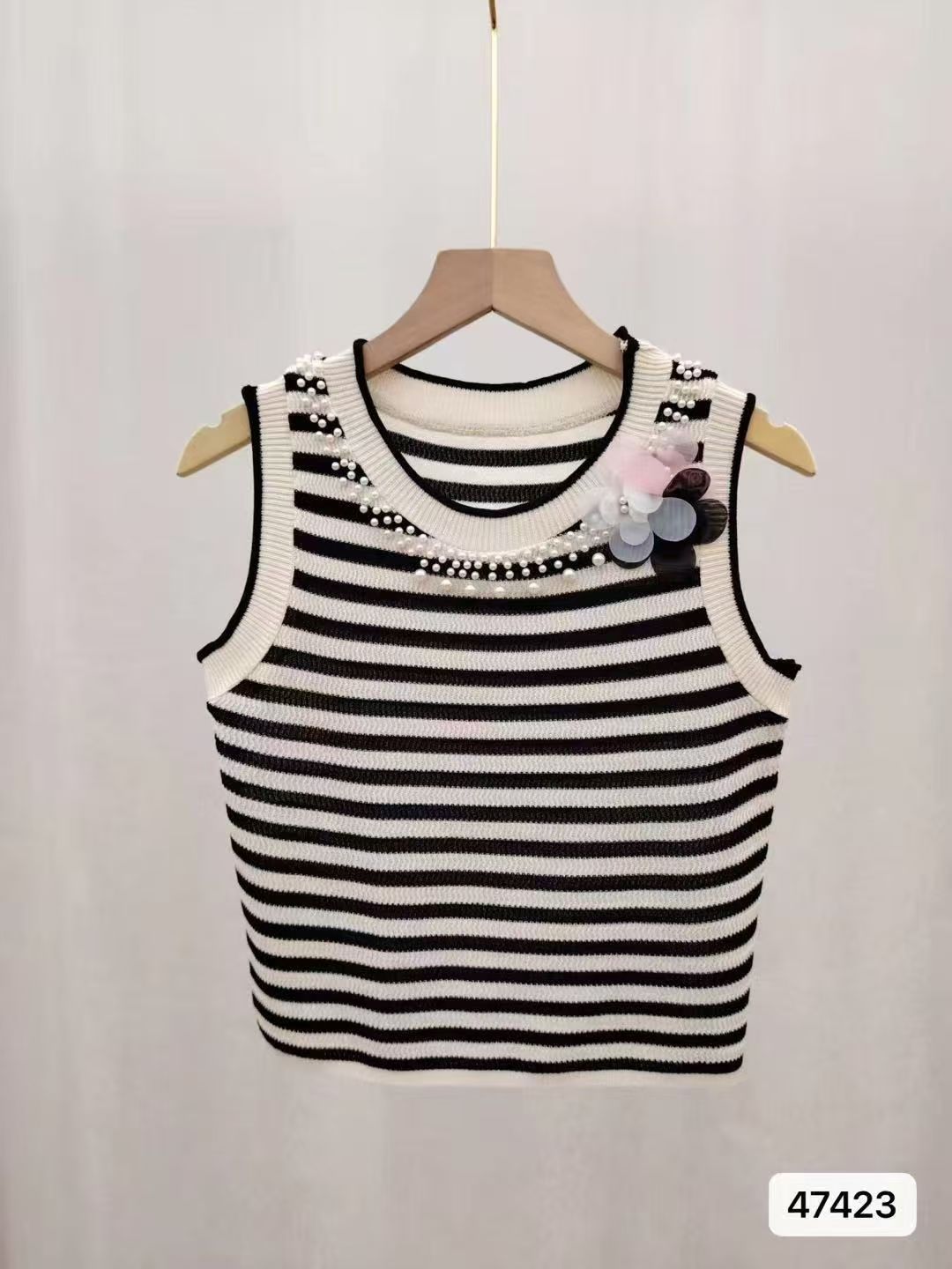 实价时尚圆领撞色条纹3朵花钉珠百搭背心