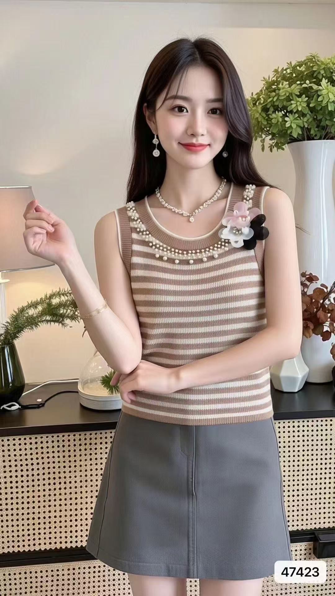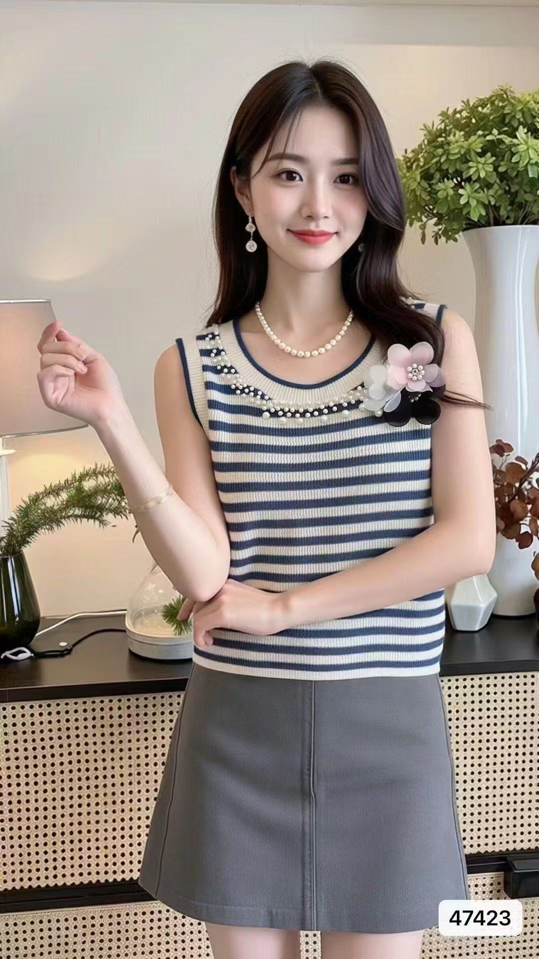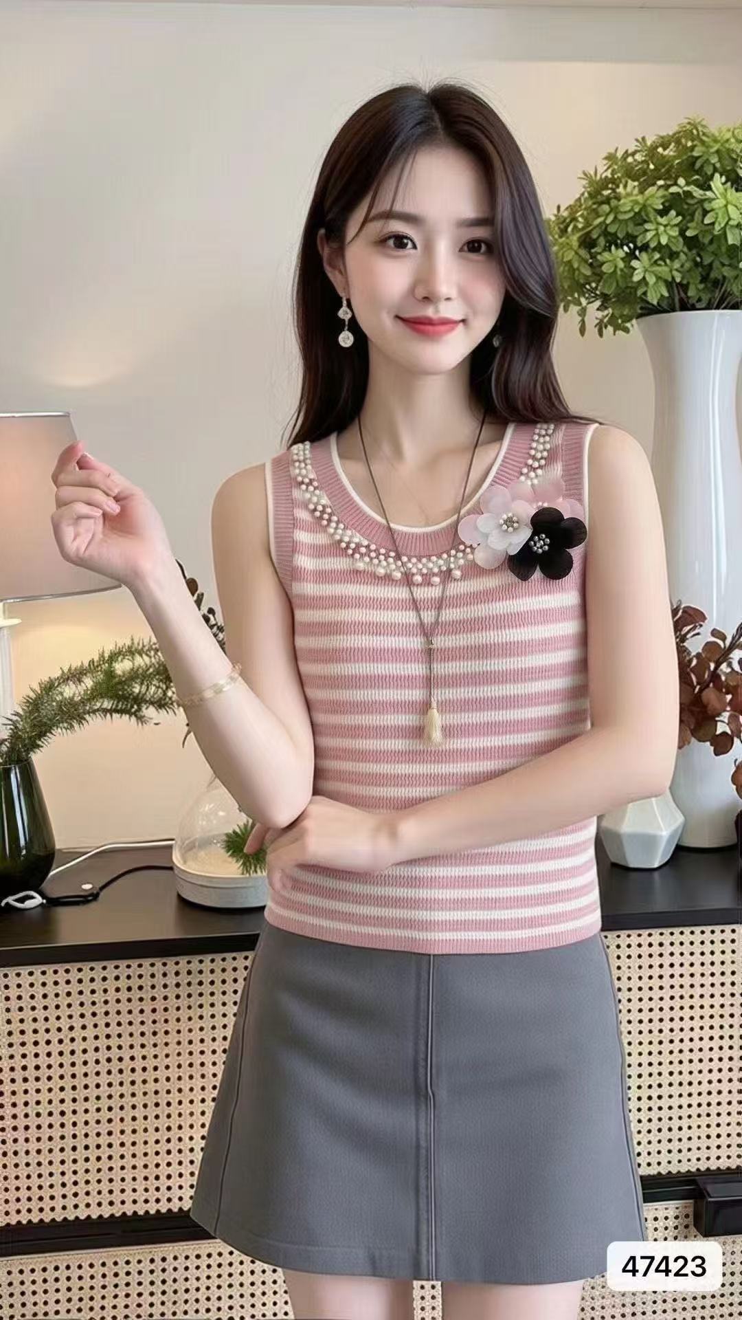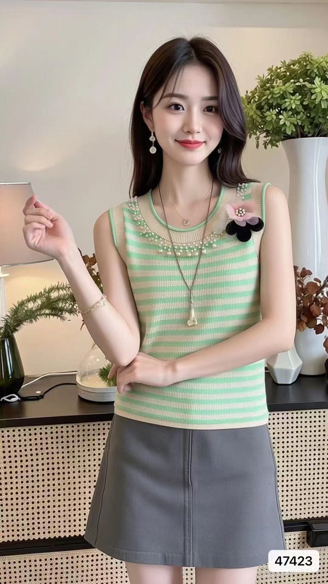 实价时尚圆领撞色条纹3朵花钉珠百搭背心