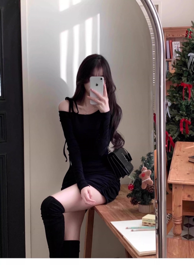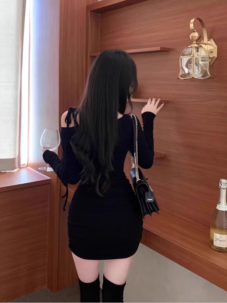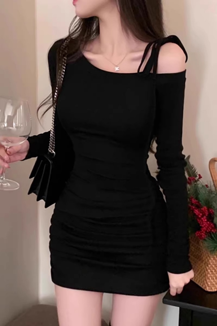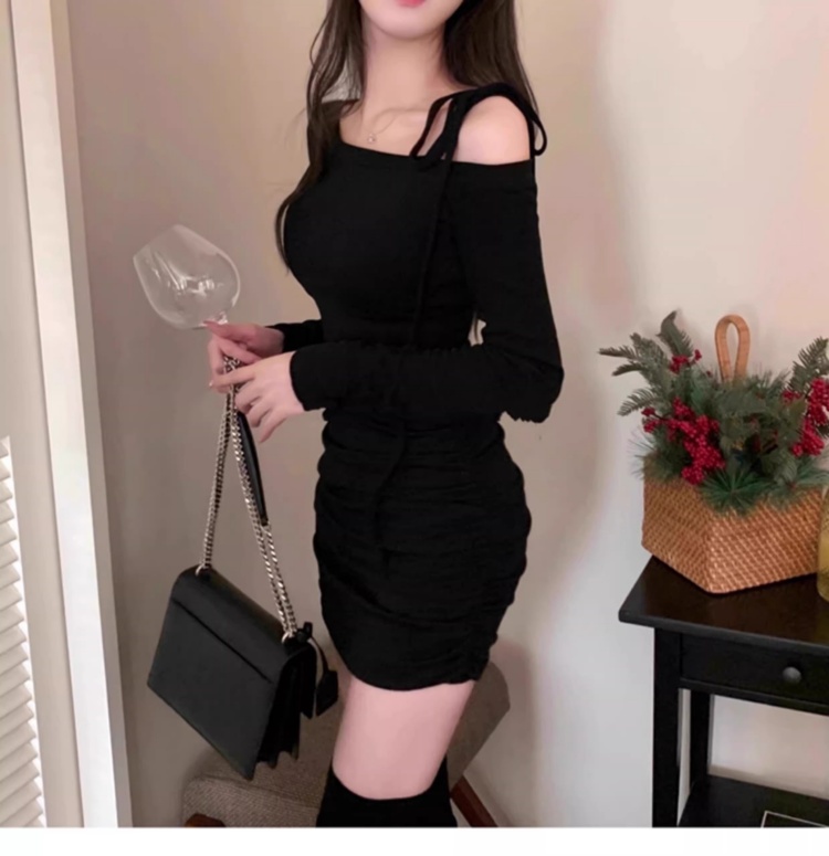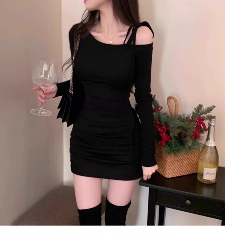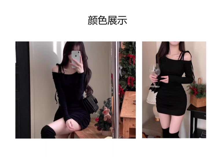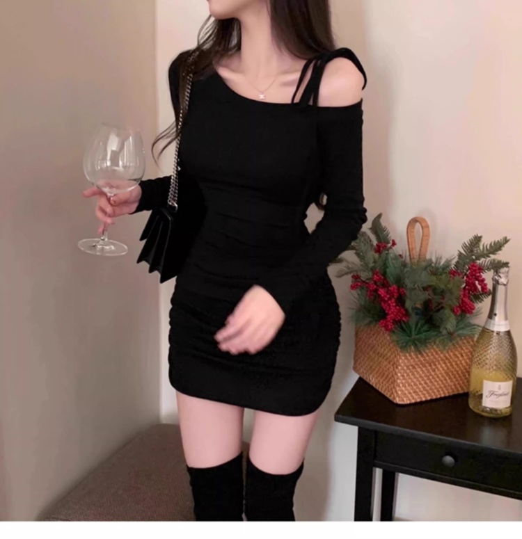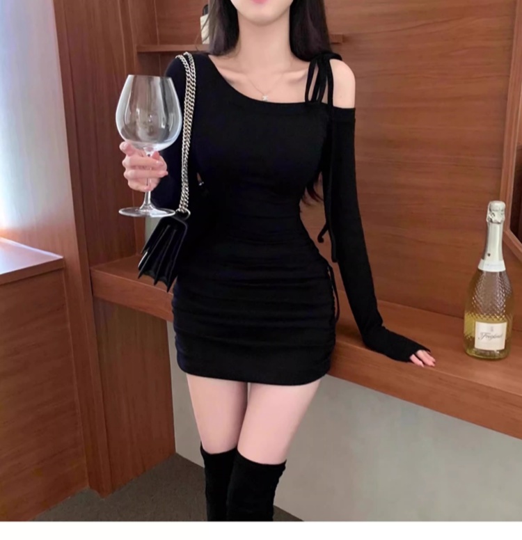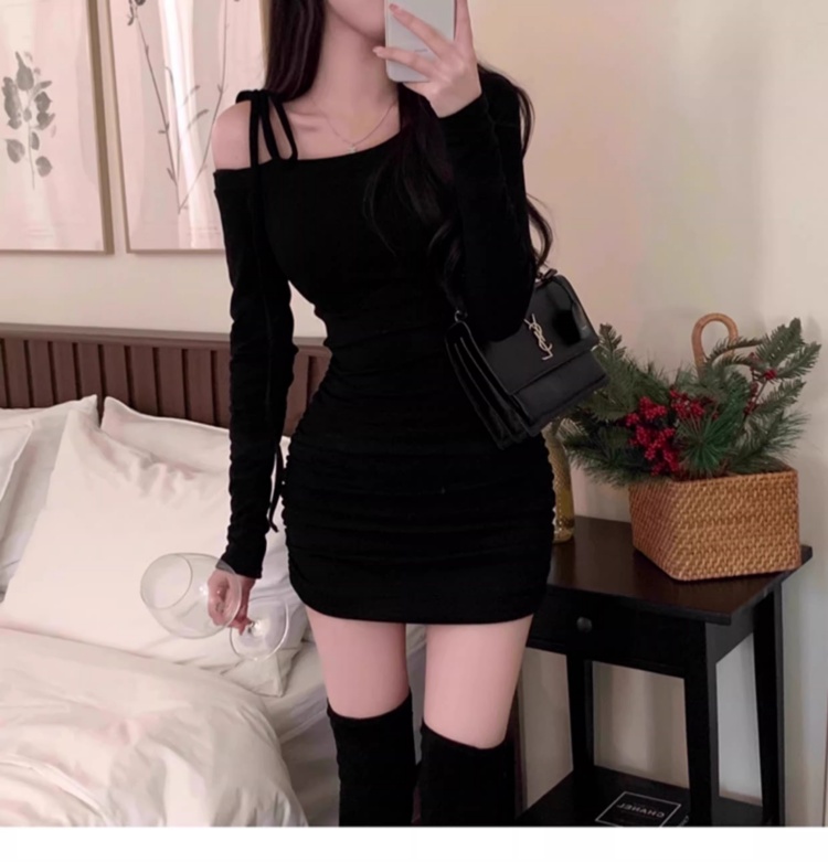 韩国春秋新款气质斜领露肩显瘦系带收腰褶皱包臀裙打底高腰连衣裙