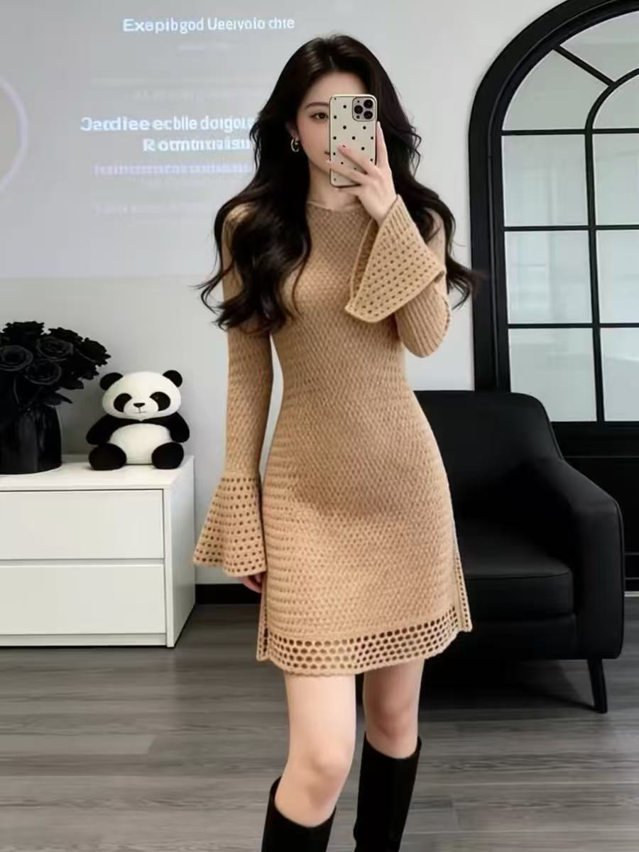 法式气质镂空针织连衣裙子女秋冬2026新款高级感修身收腰包臀短裙