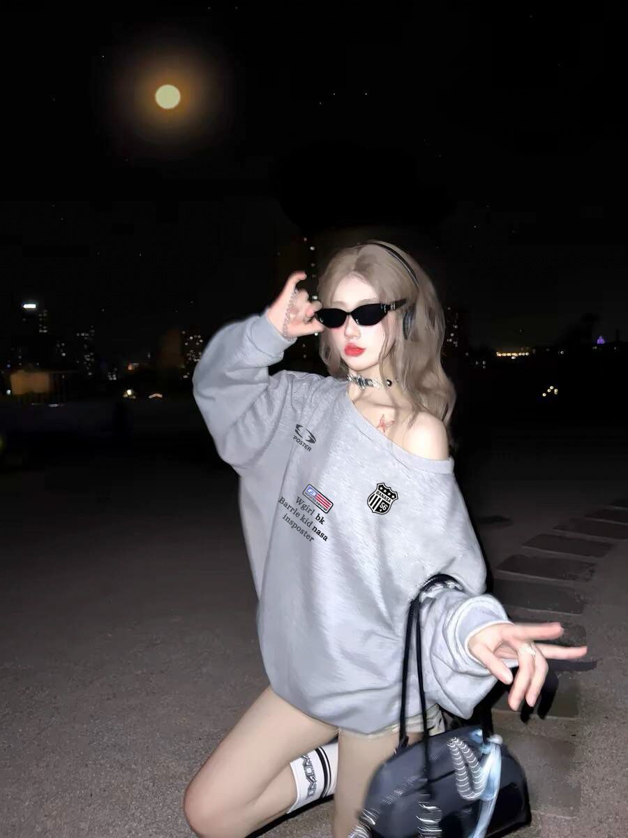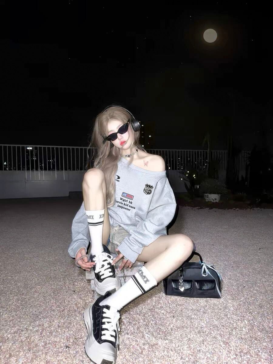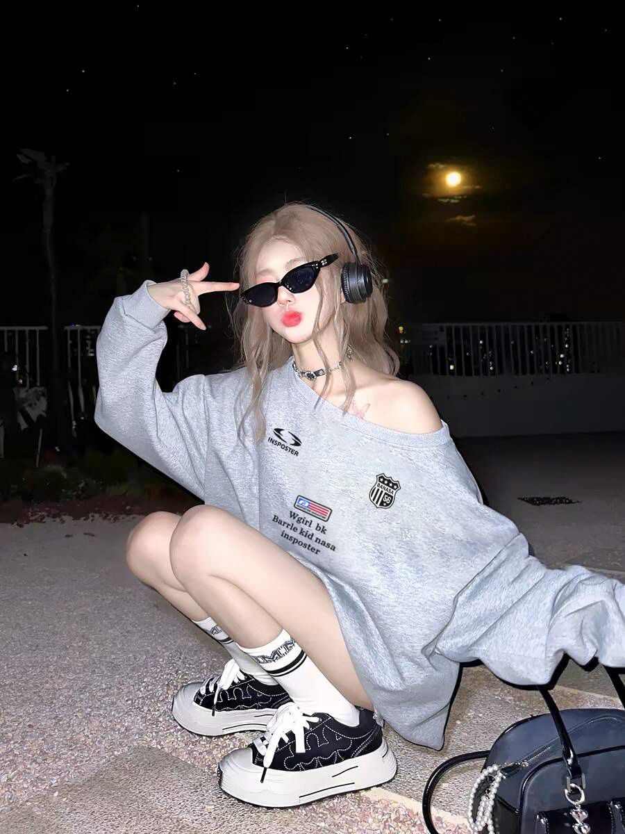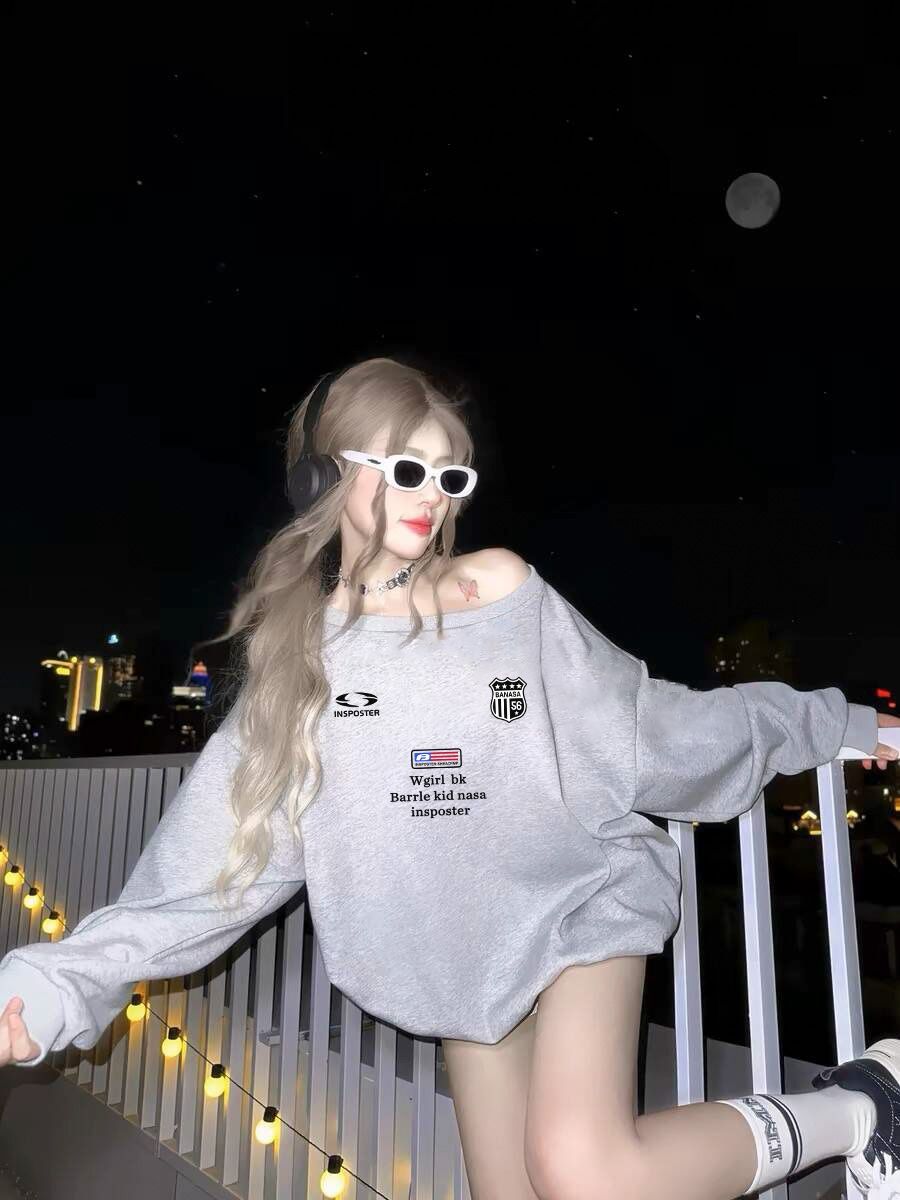 美式辣妹印花斜肩卫衣女时尚性感慵懒宽松