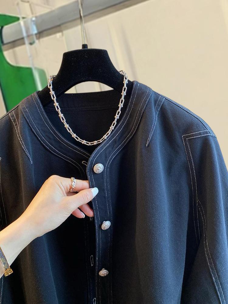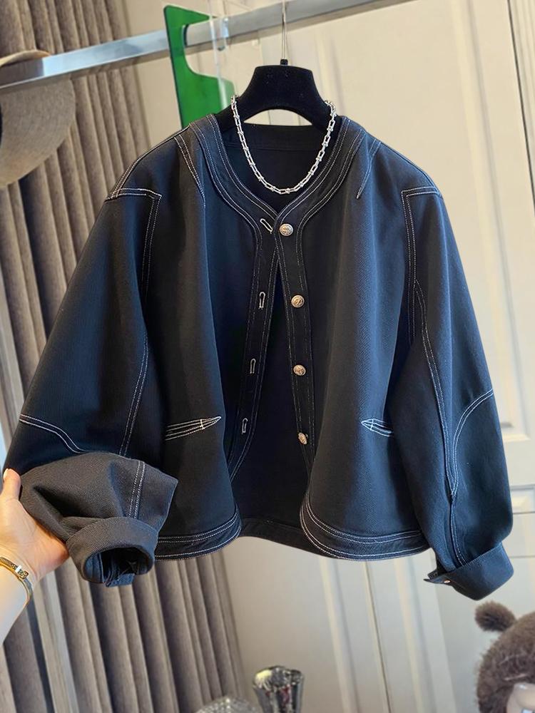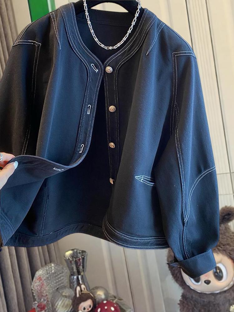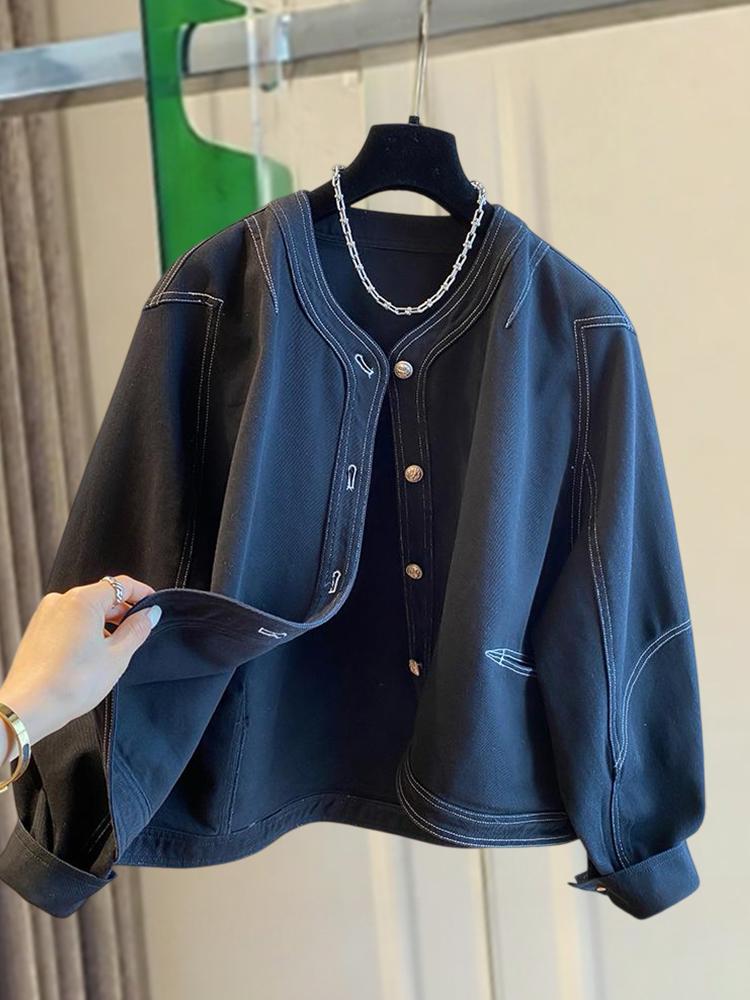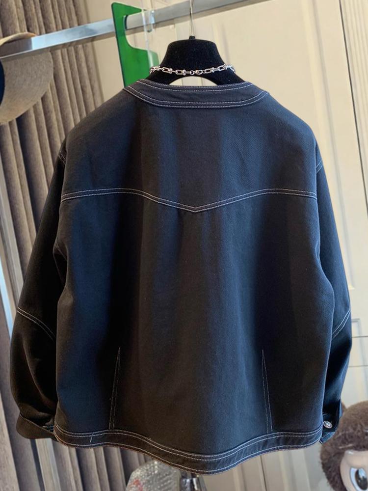 高级感明线黑色牛仔外套女春秋2026新款宽松休闲无领薄款夹克上衣