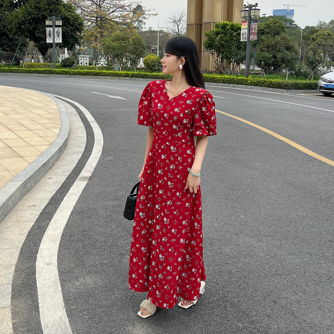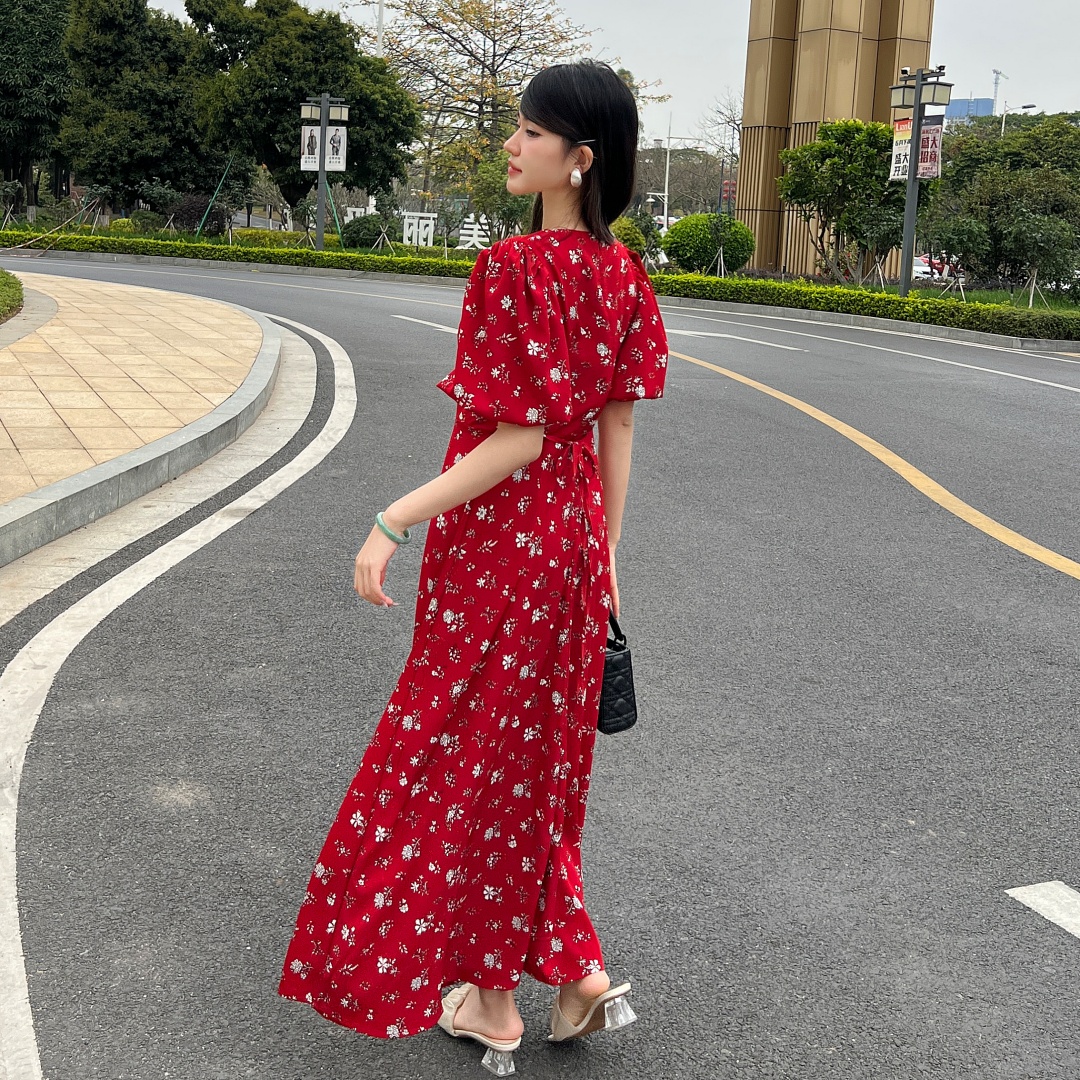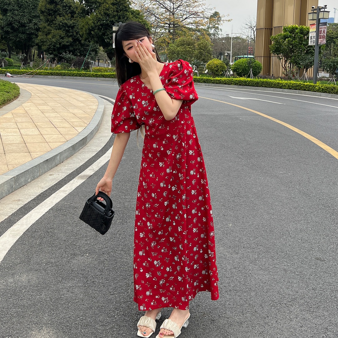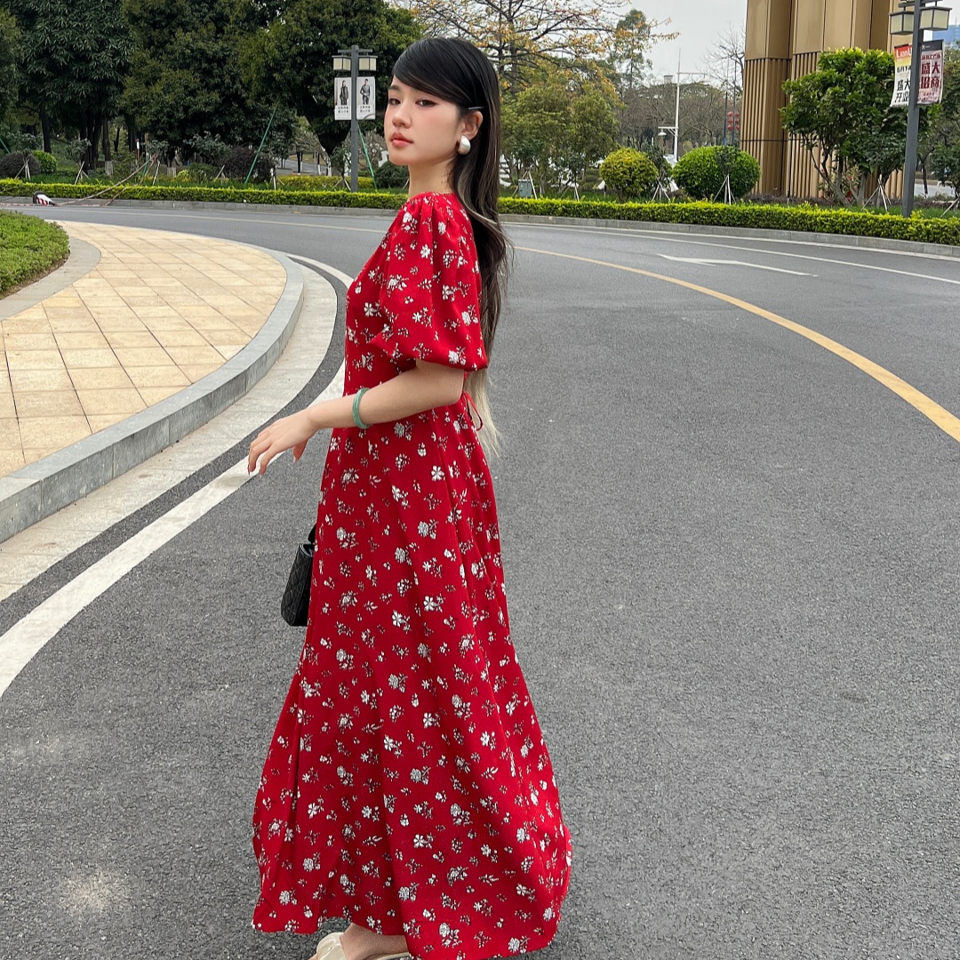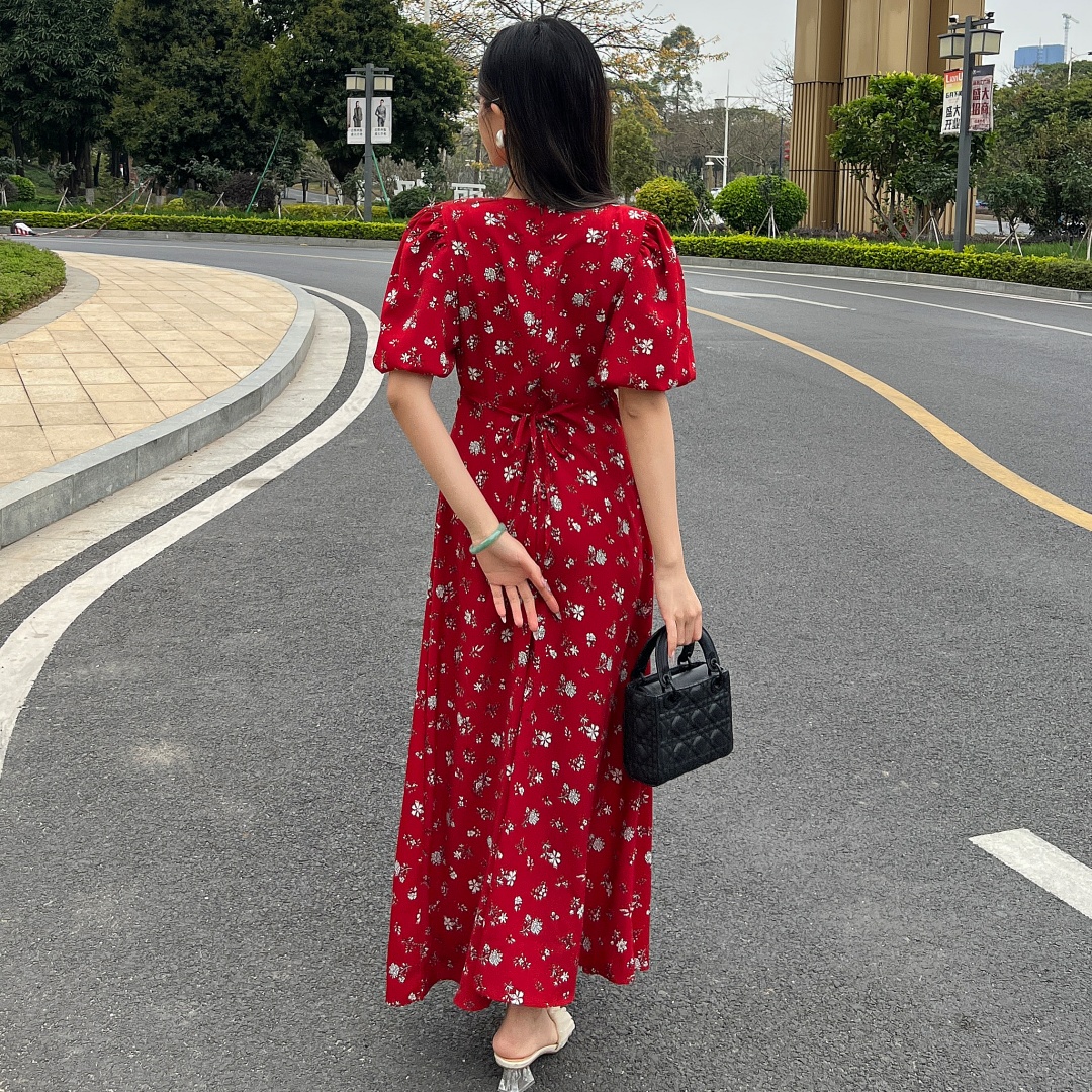 实拍 夏季新款红色碎花连衣裙法式复古设计感气质显瘦度假长裙