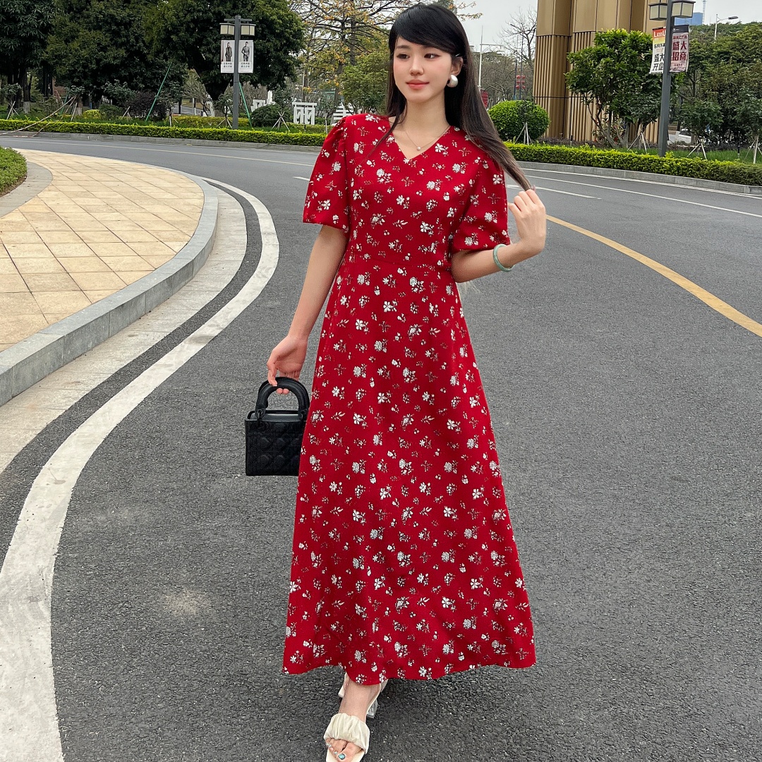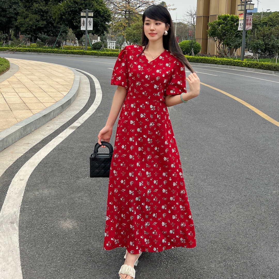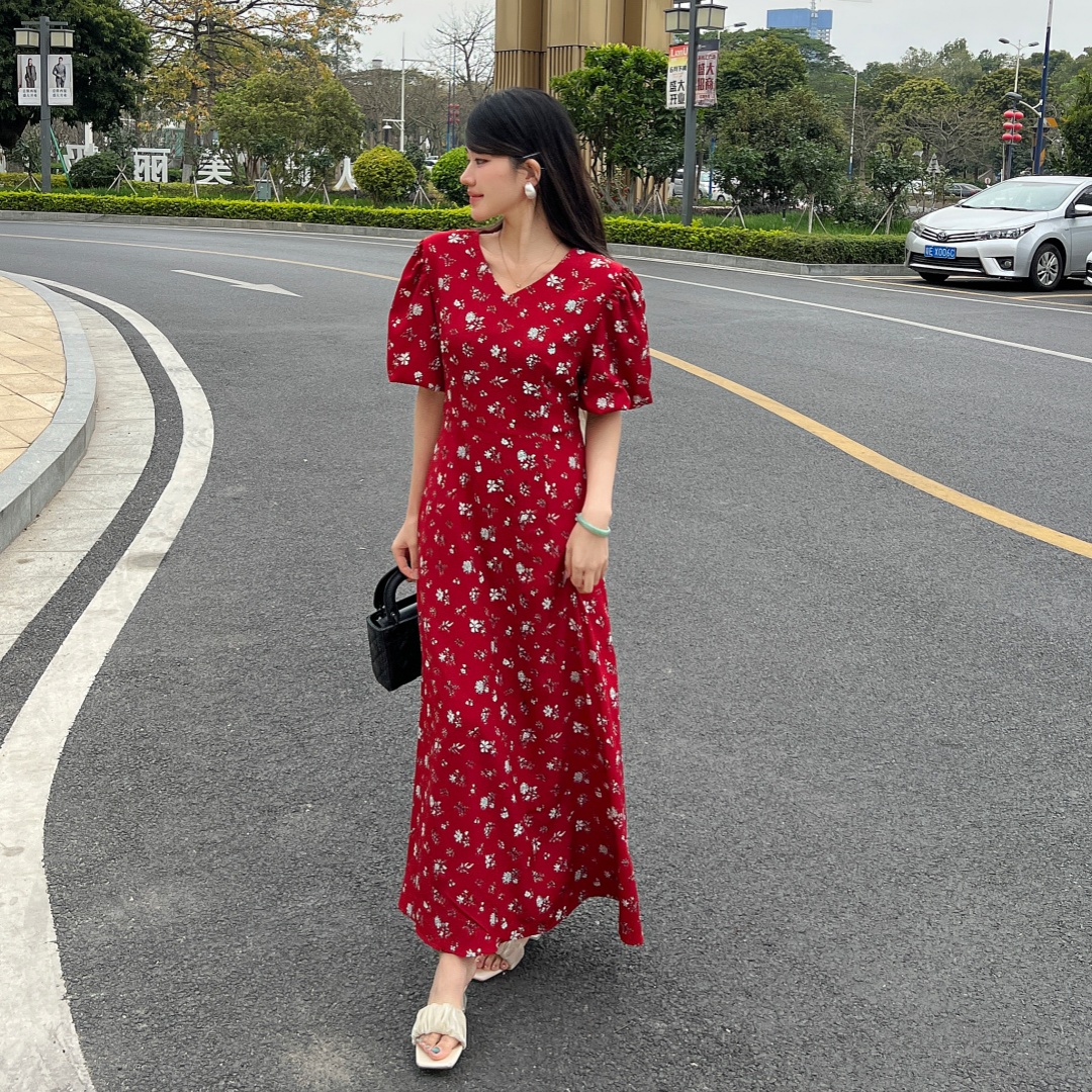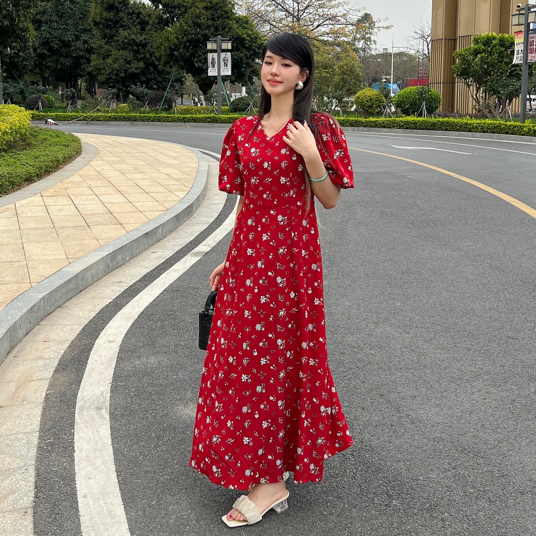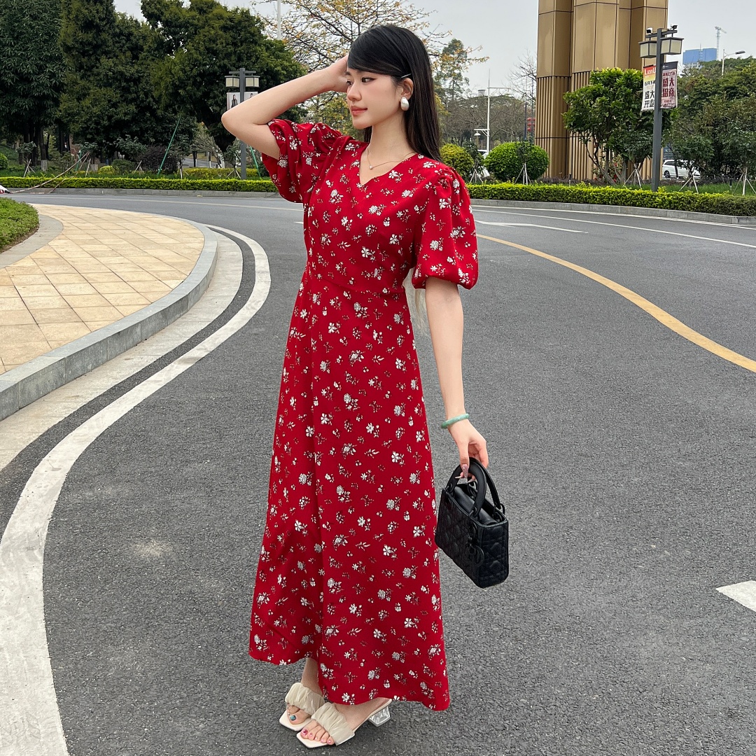 实拍 夏季新款红色碎花连衣裙法式复古设计感气质显瘦度假长裙