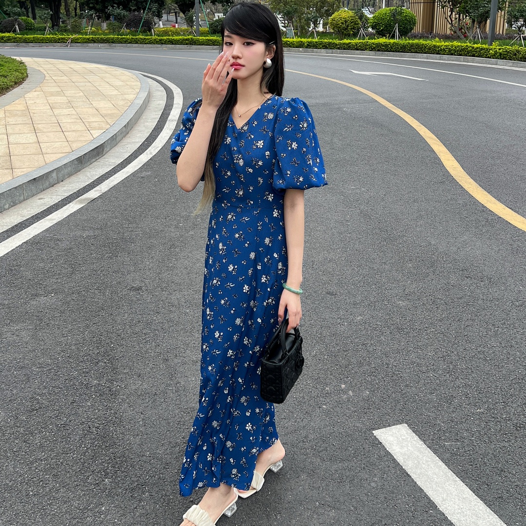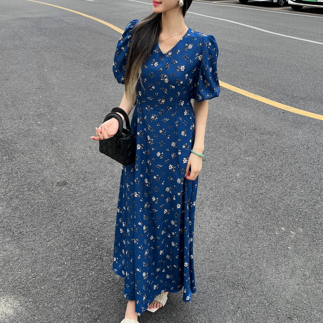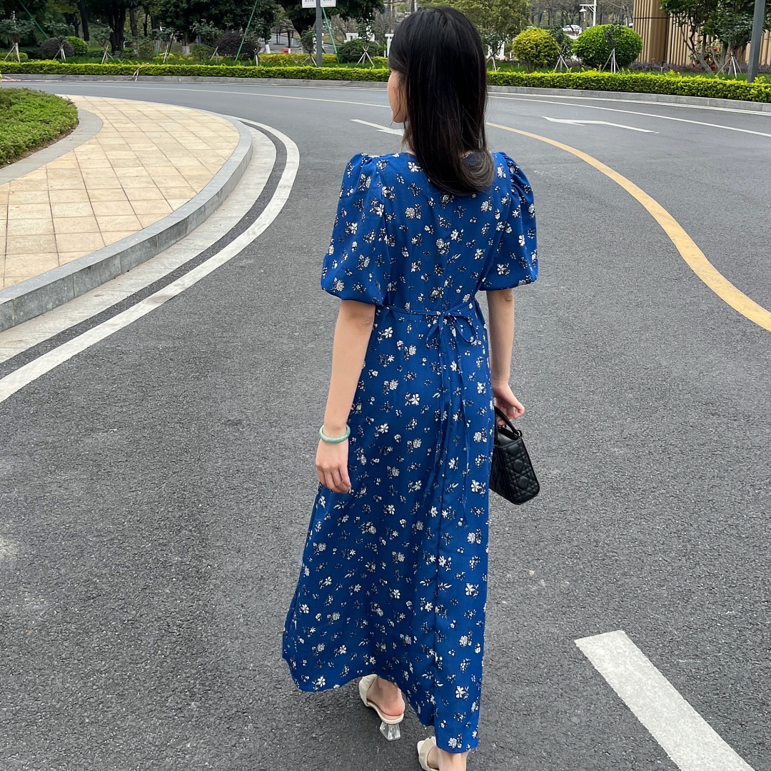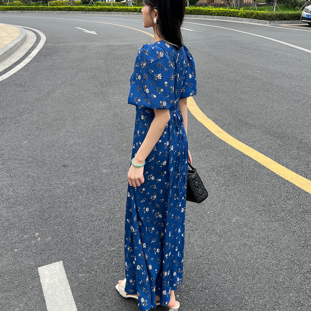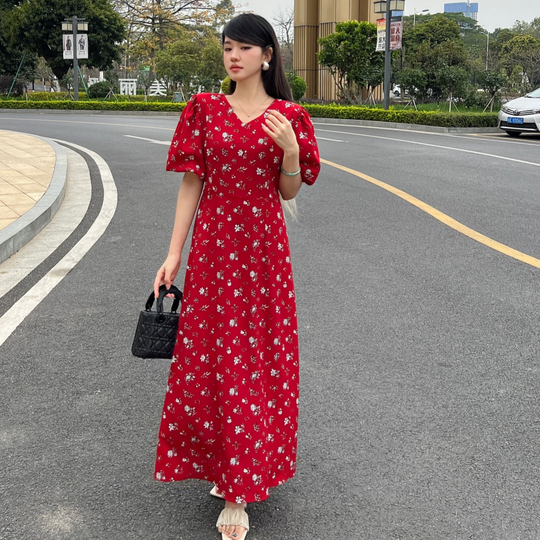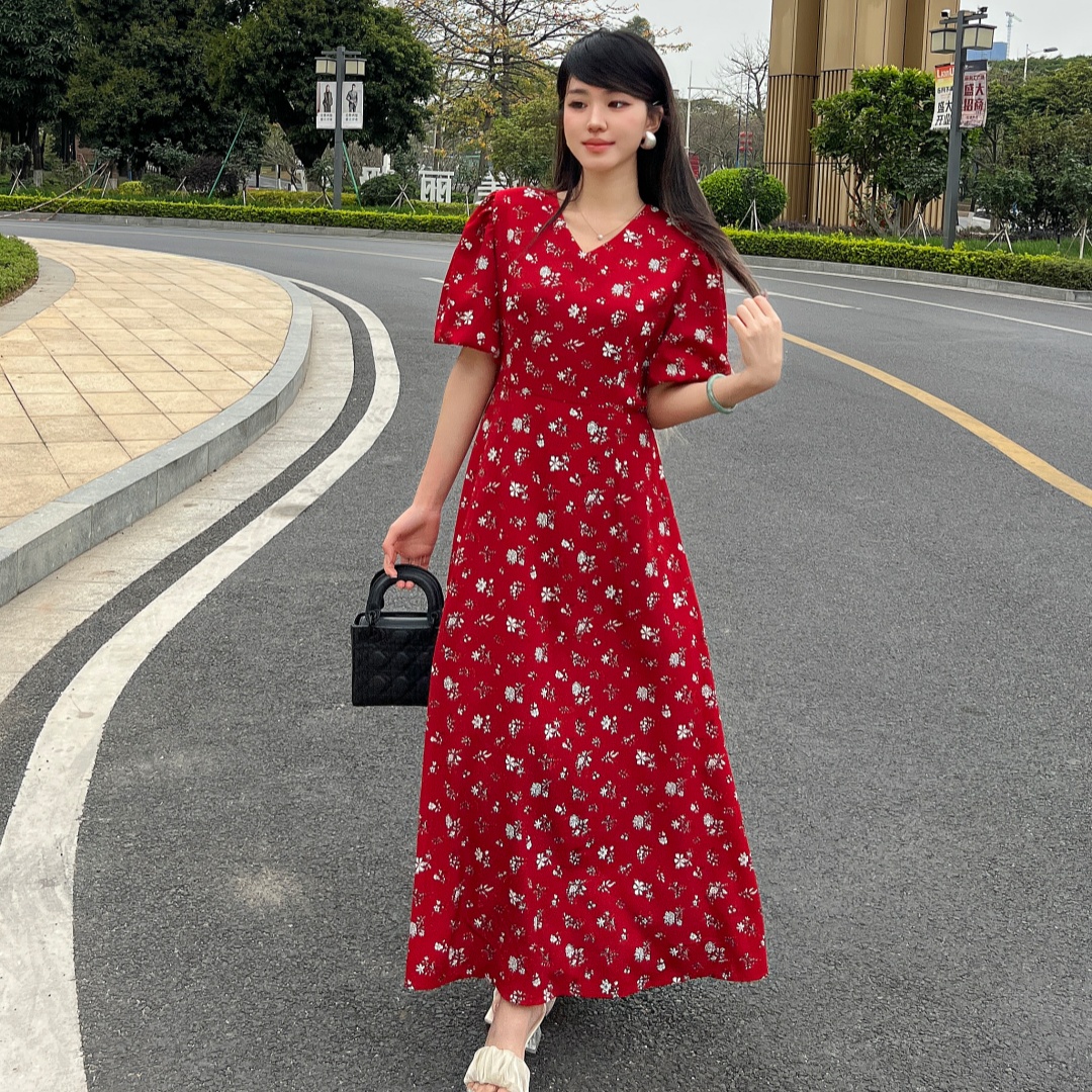 实拍 夏季新款红色碎花连衣裙法式复古设计感气质显瘦度假长裙