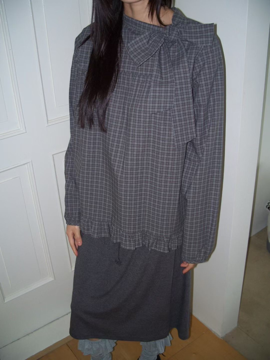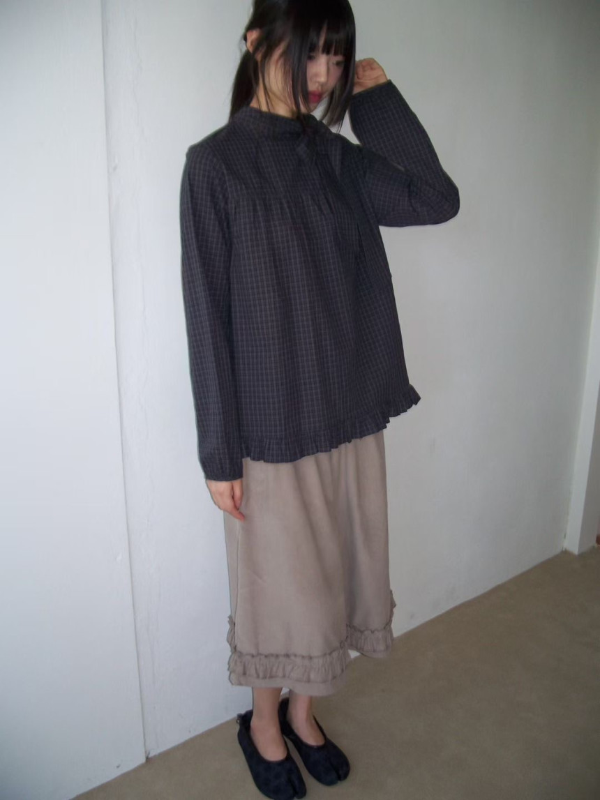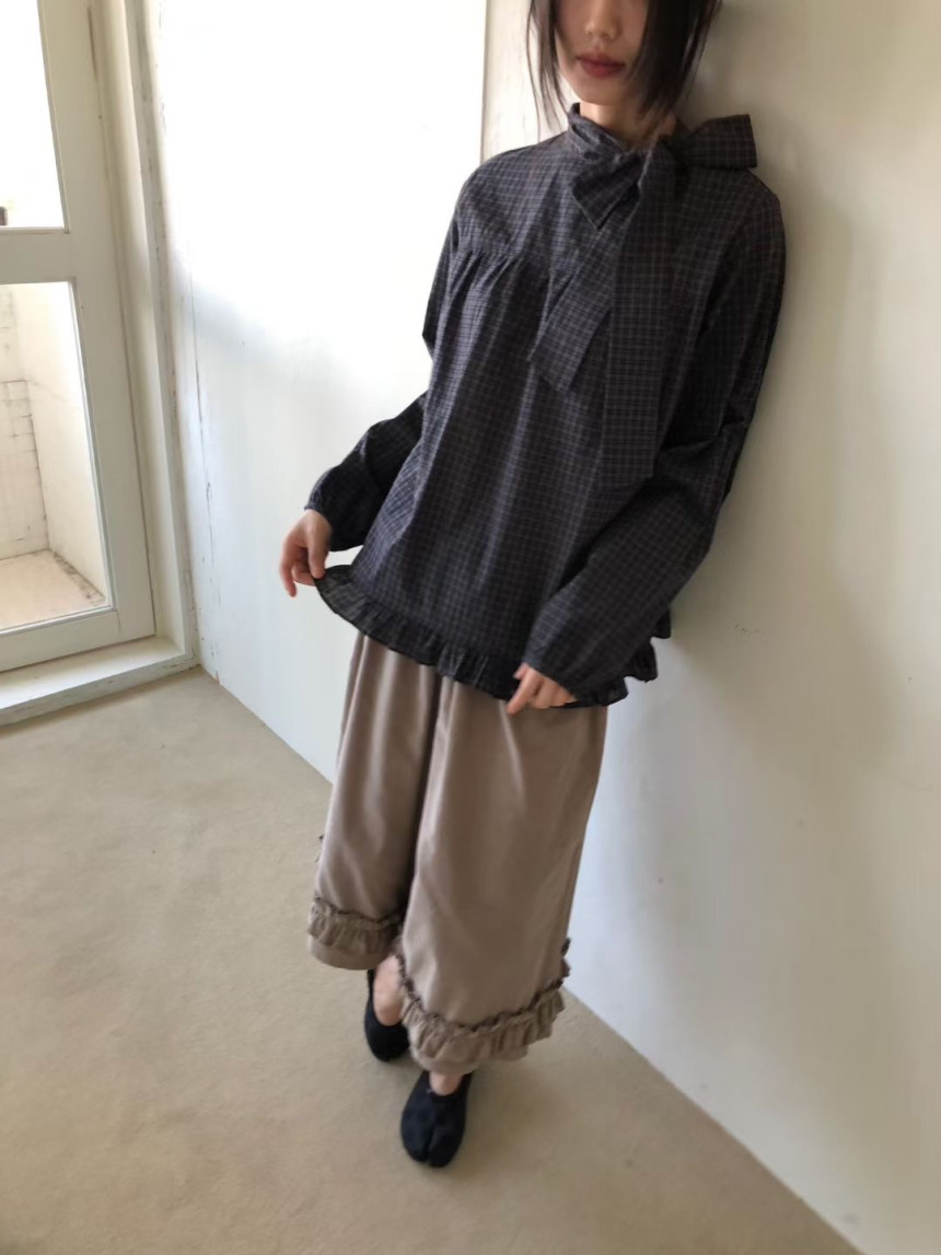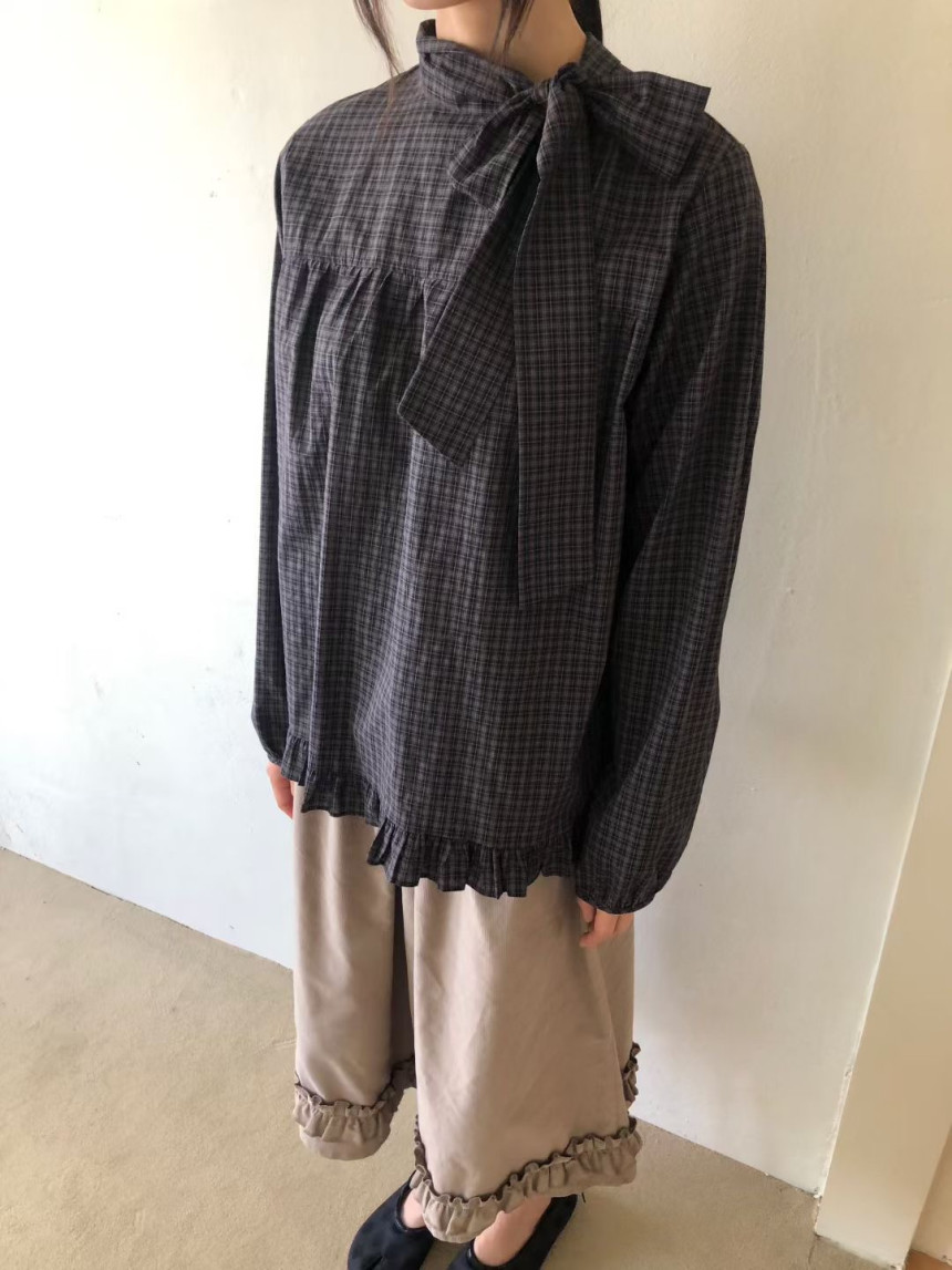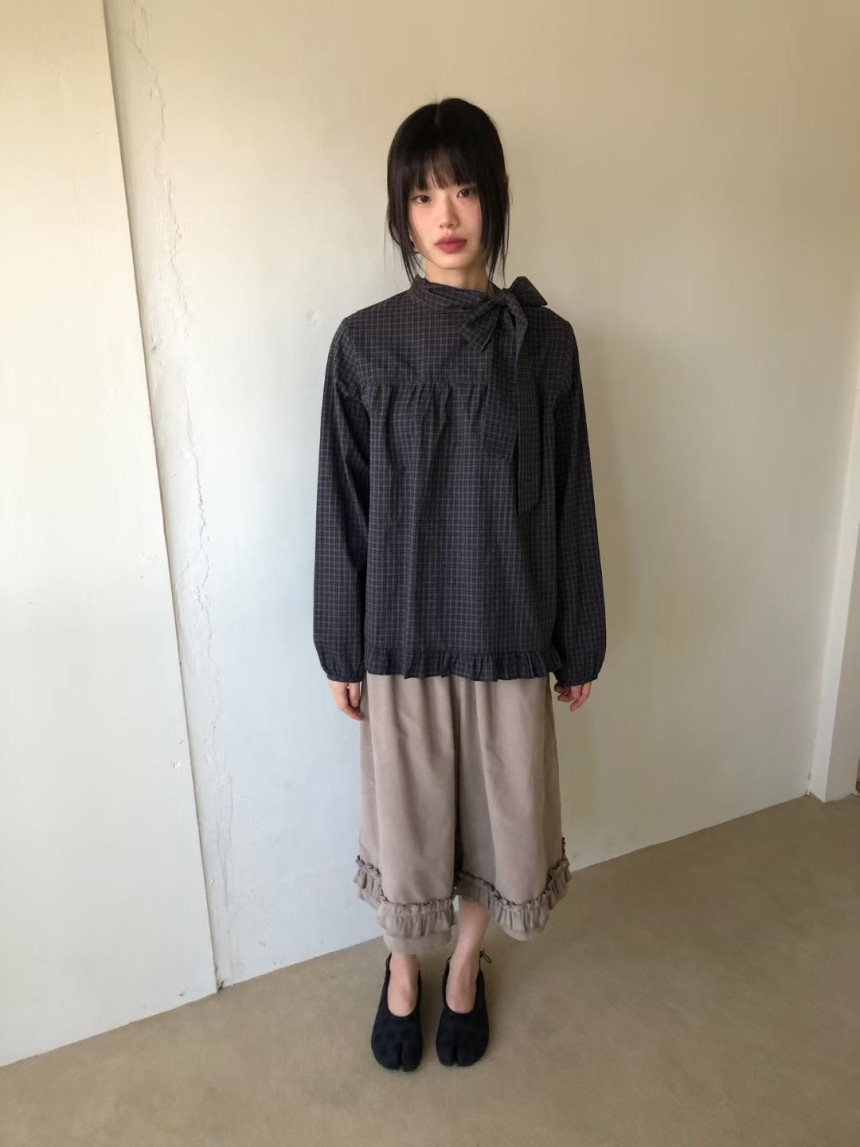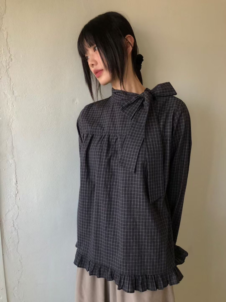 有货 韩国复古格子领口飘带蝴蝶结系带荷叶边泡泡袖衬衫日系上衣